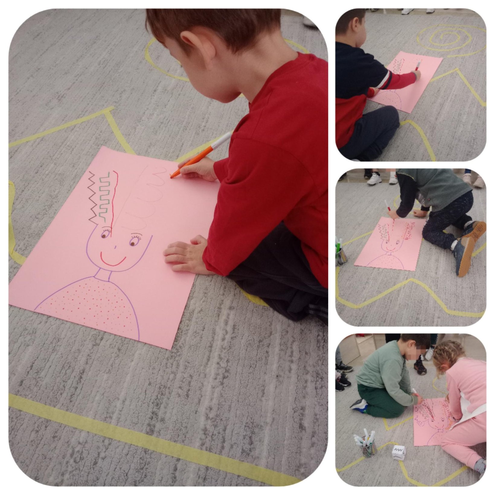 Η κυρία Γραμμή επισκέπτεται την τάξη μας και μας αναθέτει μια αποστολή. Ένας δυνατός αέρας πήρε τα μαλλιά της και ζητά τη βοήθειά μας, ώστε να τα πάρει πίσω. Μαζί της έχει φέρει και ένα ζάρι πάνω στο οποίο υπάρχουν γραμμές (ευθεία, τεθλασμένη, σπείρα κ.α.). Τα παιδιά ρίχνουν το ζάρι και σχεδιάζουν στο κεφάλι της κυρίας Γραμμής το σχέδιο που έτυχαν.