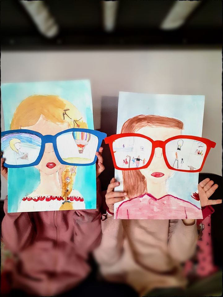 “Αρχικά τα κορίτσια ζωγράφισαν τον εαυτό τους με νερομπογιές. Στη συνέχεια κολλήσανε πάνω στη ζωγραφιά τους ένα μεγάλο ζευγάρι γυαλιά που τους είχα ετοιμάσει. Έπειτα τις είπα να κλείσουν τα μάτια τους κ να φανταστούν ότι έξω έχει μια πολλή όμορφη μέρα,έχει τελειώσει η καραντίνα και μπορούν να φορέσουν τα ωραία τους γυαλιά κ να βγούνε.Τι θα ήθελαν λοιπόν να κάνουν,ποιους θα ήθελαν να συναντήσουν και σε ποιο μέρος να βρεθούν;Τι θα ήταν αυτό που θα τις έκανε χαρούμενες και που τους έλειψε πιο πολύ όλον αυτό το καιρό που μένουνε σπίτι! Τι θα ήταν αυτό που θα έβλεπαν τα μάτια τους και θα έφερνε το πιο γλυκό χαμόγελο στο πρόσωπο;” Οι ιδέες των παιδιών σας πιθανόν να σας εκπλήξουν!!!