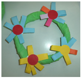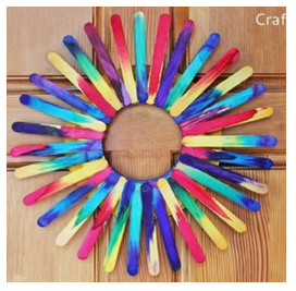 Διαδικασία: Κόβουμε το εσωτερικό του χάρτινου πιάτου και φτιάχνουμε ένα στεφάνι. Στη συνέχεια βάφουμε με πράσινη ή κίτρινη τέμπερα το στεφάνι. Χρωματίζουμε τα γλωσσοπίεστρα (αν δεν έχουν χρώμα) και τα κολλάμε με κόλλα επάνω στο στεφάνι.