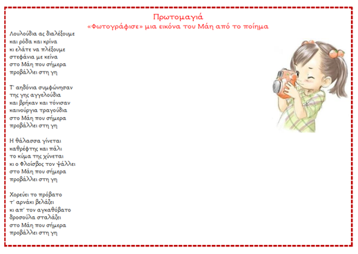 Με αφορμή το ποίημα «Η απεργία των λουλουδιών» της Ελένης Τσούση (Πηγή: http://taniamanesi-kourou.blogspot.com/2015/04/blog-post_28.html), μαθαίνουμε για την Εργατική Πρωτομαγιά, την απεργία αλλά και για την γιορτή των Λουλουδιών.