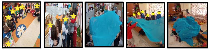 Έπειτα παίξαμε «Τον ωκεανό της αγάπης». Όλοι μαζί κρατούσαμε ένα μπλε πανί που ήταν ο ωκεανός. Κάθε φορά ένα παιδί περνούσε από κάτω και όταν έβγαινε επέλεγε έναν φίλο του για να του χαρίσει μία αγκαλιά και να μοιραστεί μαζί του την αγάπη του.