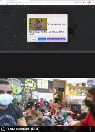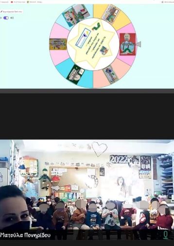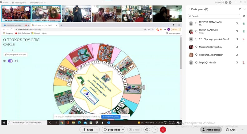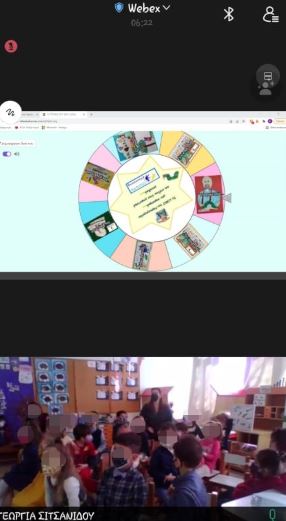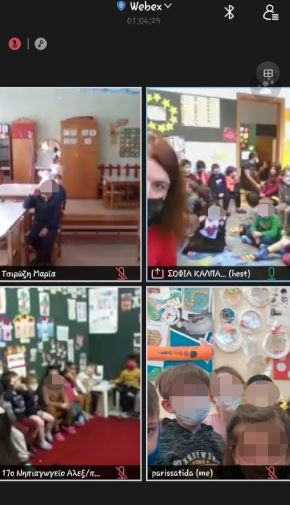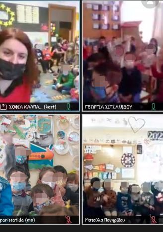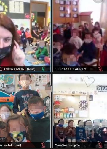 Η πρώτη γνωριμία των παιδιών όλων των σχολείων που συμμετέχουν στο εθνικό πρόγραμμα etwinning «Η κάμπια του Eric Carle οδηγός μου, για να γνωρίσω τα ζωάκια του κόσμου». Η τηλεδιάσκεψη πραγματοποιήθηκε μέσω της πλατφόρμας τηλεκπαίδευσης webex.