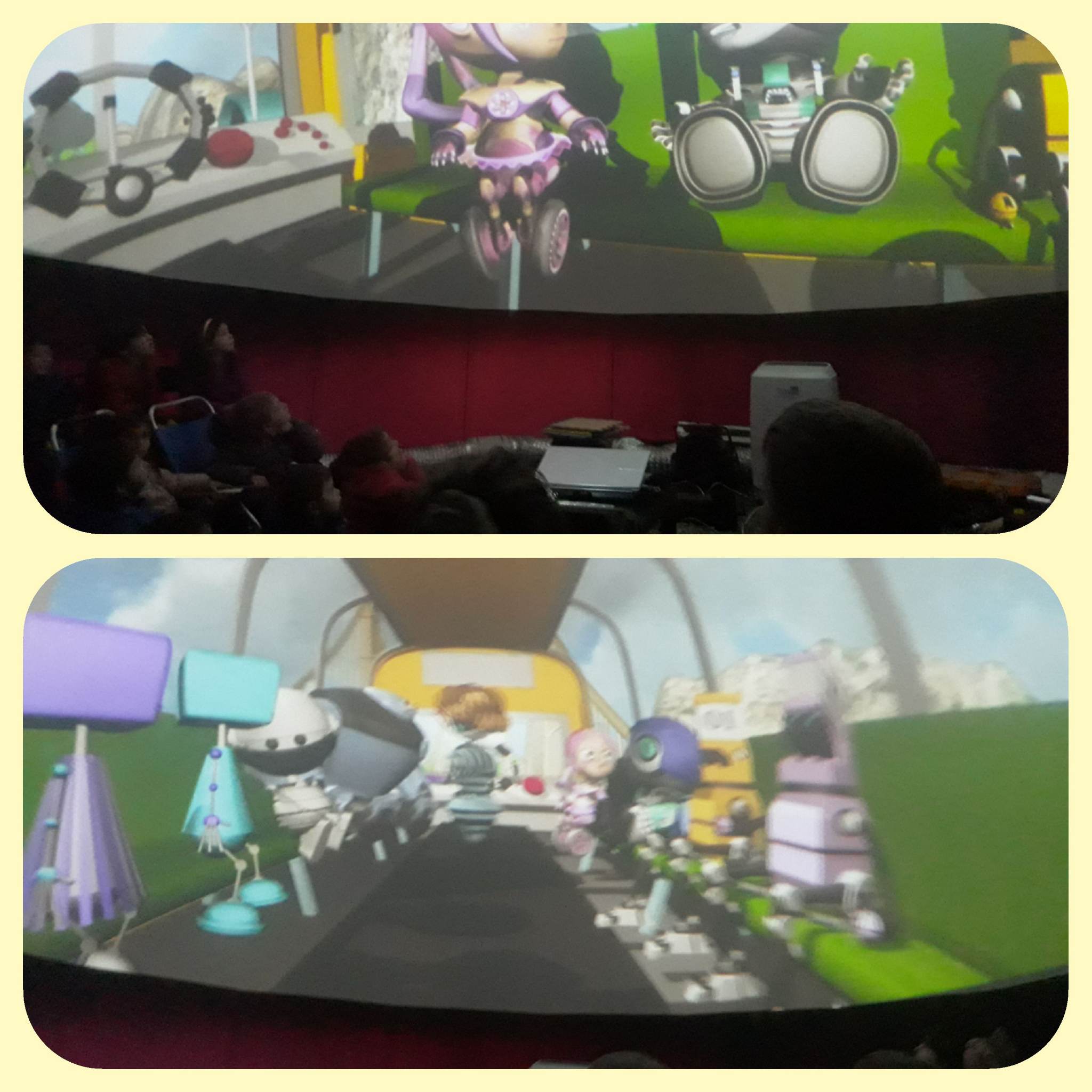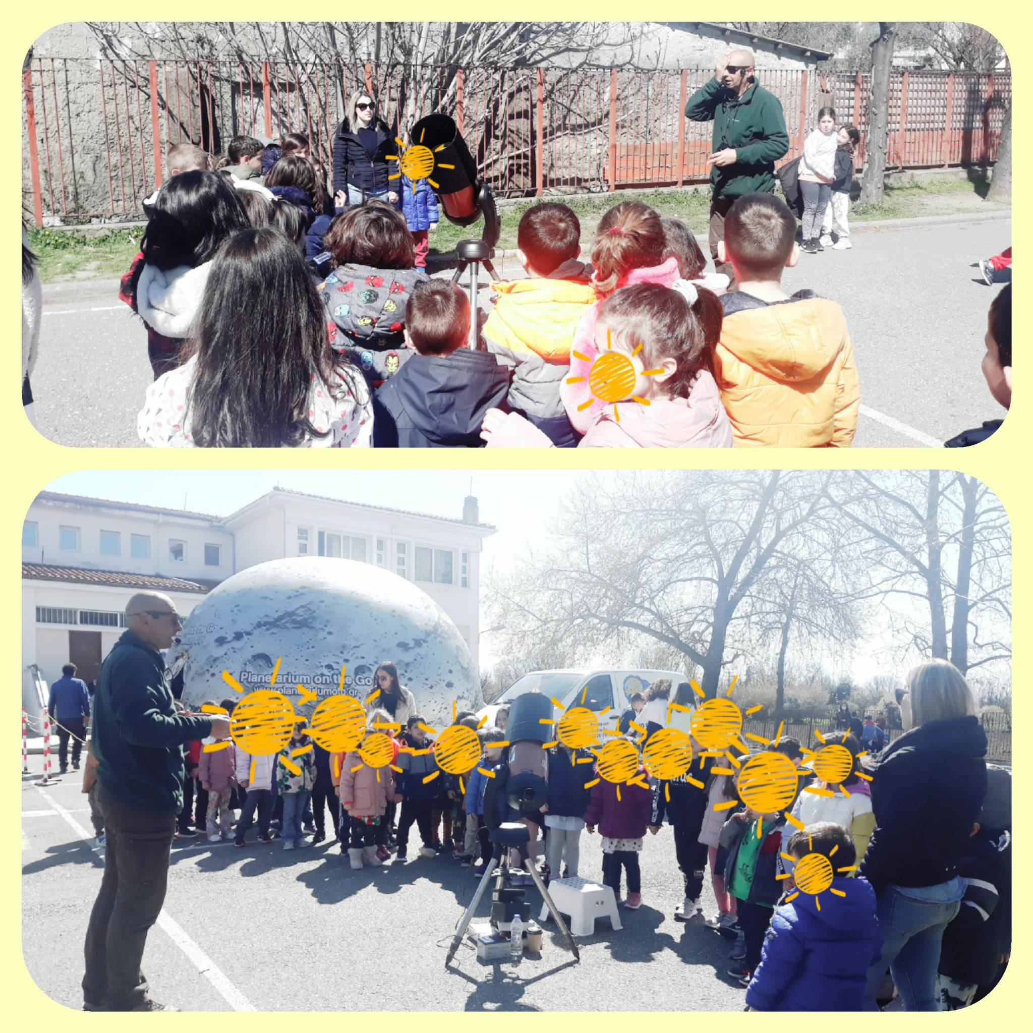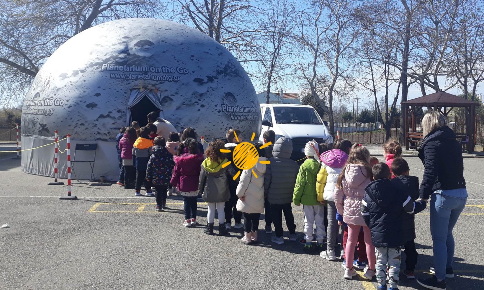 Το Φορητό Ψηφιακό Πλανητάριο Planetarium Οn Τhe Go, μια ειδική ημιμόνιμη φορητή κατασκευή σταθερού θόλου με καρέκλες για τους θεατές, εγκαταστάθηκε στον αύλειο χώρο του 5ου Δημοτικού και μας πρόσφερε μία μοναδική οπτικοακουστική διδακτική εμπειρία! Κυρίαρχο χαρακτηριστικό του είναι η ημισφαιρική οθόνη προβολής διαμέτρου 6 μέτρων με επιφάνεια εμβαδού 57 τετραγωνικών μέτρων! Παρακολουθήσαμε τη συναρπαστική ταινία “Ένας τέλειος μικρός πλανήτης” και ι εικόνες προβλήθηκαν σε όλη την εσωτερική επιφάνεια του θόλου περιβάλλοντας πλήρως τους μικρούς μαθητές, δημιουργώντας ένα συναρπαστικό περιβάλλον! Στη συνέχεια παρατηρήσαμε με τηλεσκόπιο την ήλιο με ειδικό φίλτρο!