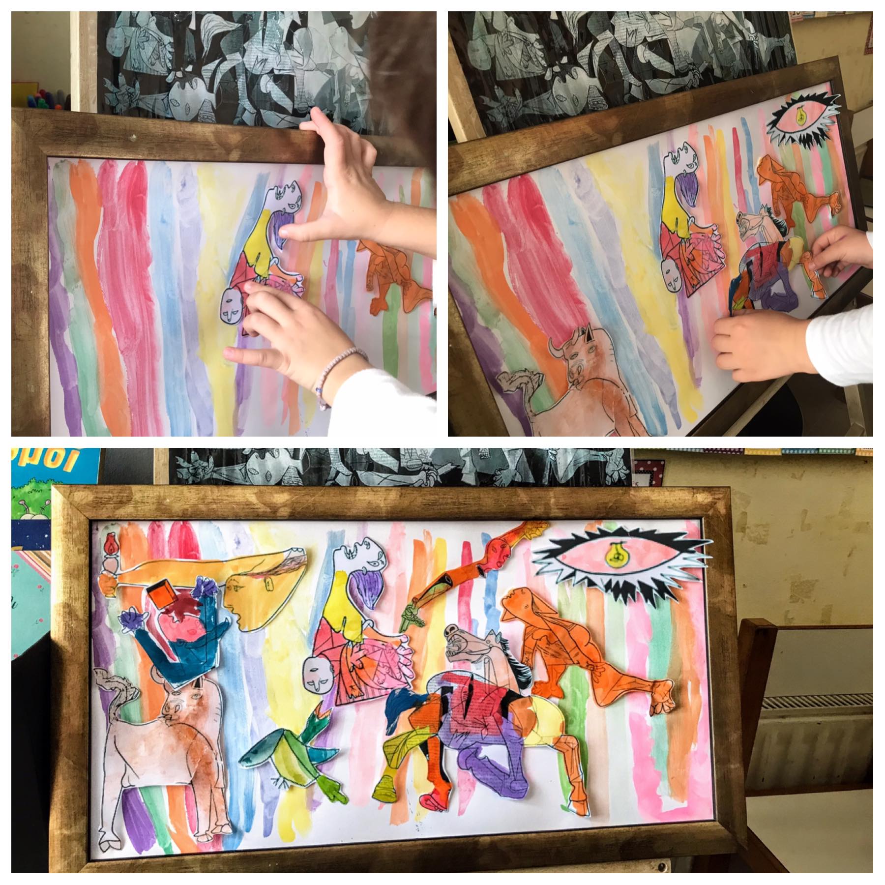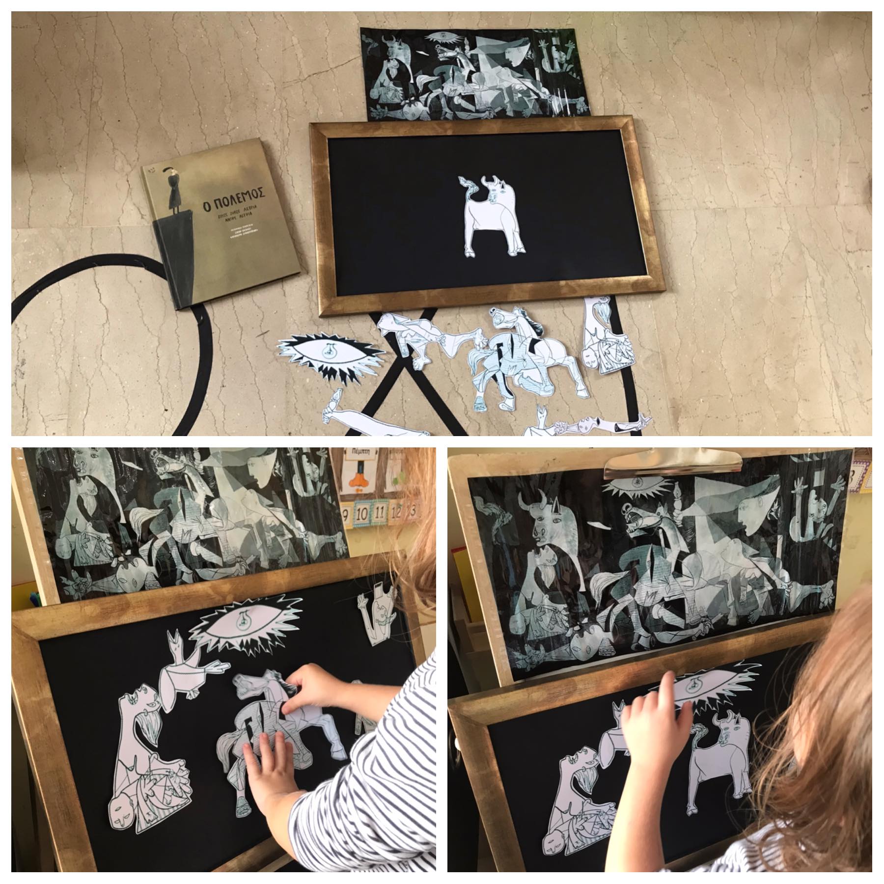 Τα παιδιά μαθαίνουν την ιστορία της πόλης Γκουέρνικα, παρατηρούν τα χρώματα που χρησιμοποίησε ο ζωγράφος αλλά και τις εκφράσεις των ηρώων του πίνακα. Έπειτα οι μορφές απέκτησαν φωνή και άρχισαν να διαμαρτύρονται. Δεν τους άρεσε που ήταν ασπρόμαυροι και ακίνητοι όποτε αποφάσισαν να δραπετεύσουν . Όλες οι μορφές φύγανε από τον πίνακα αλλά και πάλι δεν ήταν ευχαριστημένες. Ζήτησαν από τα παιδιά να τις ξανά τοποθετήσουν στη σωστή τους θέση. Τα παιδιά τις βοήθησαν και τις τοποθέτησαν ξανά μέσα στον πίνακα. Όμως και πάλι οι μορφές δεν ήταν χαρούμενες! Ήθελαν να είναι ένας χαρούμενος πίνακας. Τα παιδιά πρότειναν να τις βάψουν με φωτεινά χρώματα και να τις τοποθετήσουν σε άλλες θέσεις φτιάχνοντας έτσι έναν πίνακα που θα συμβόλιζε την Ειρήνη και δεν θα θύμιζε σε τίποτα τον πόλεμο…