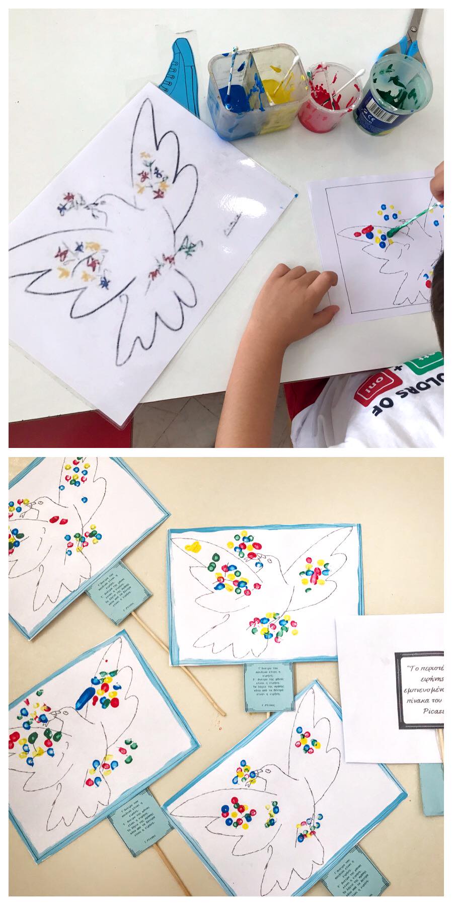 Τα παιδιά αφού παρατήρησαν τα χρώματα που χρησιμοποίησε ο ζωγράφος φτιάξανε το δικά τους περιστέρια.