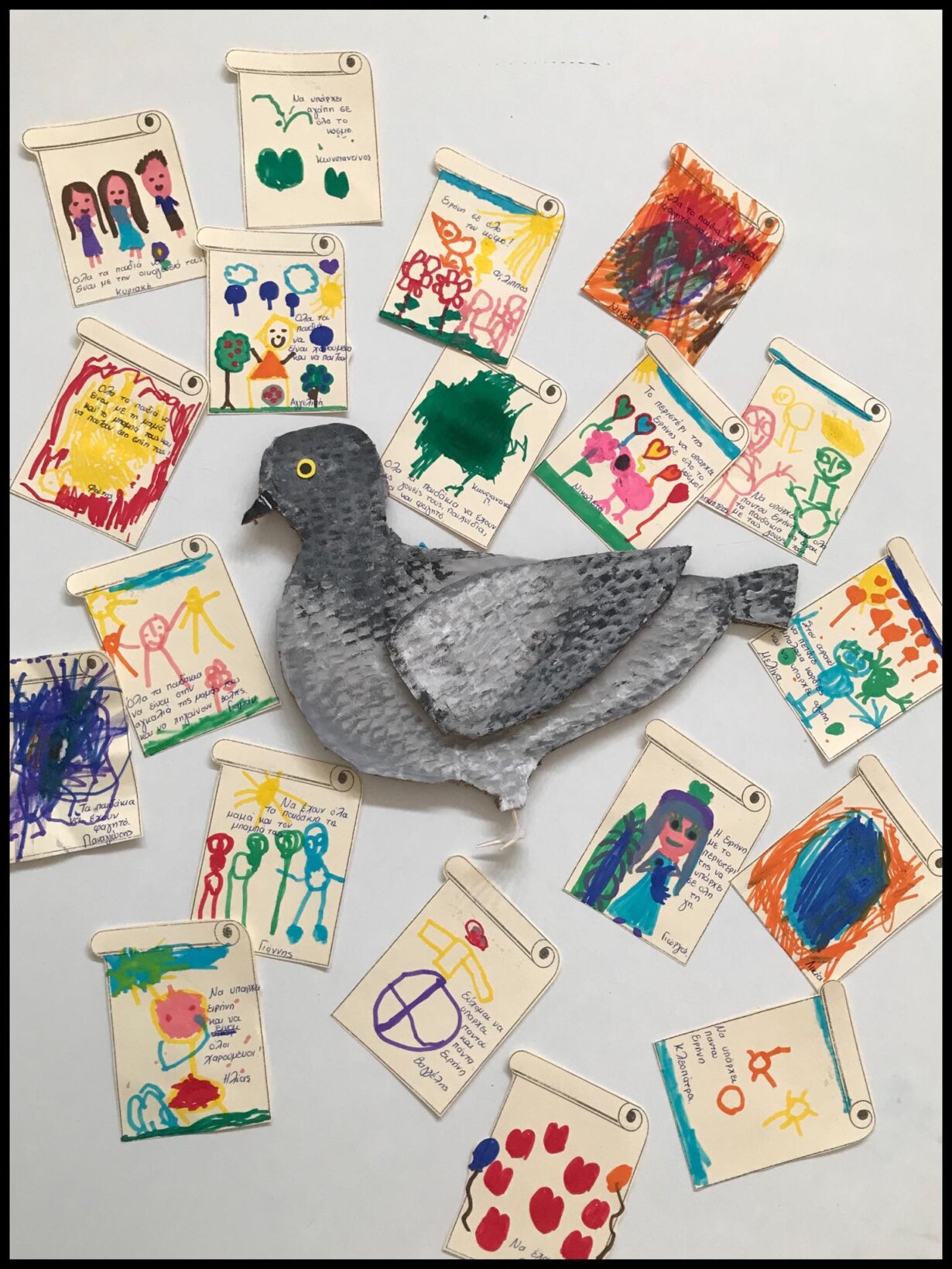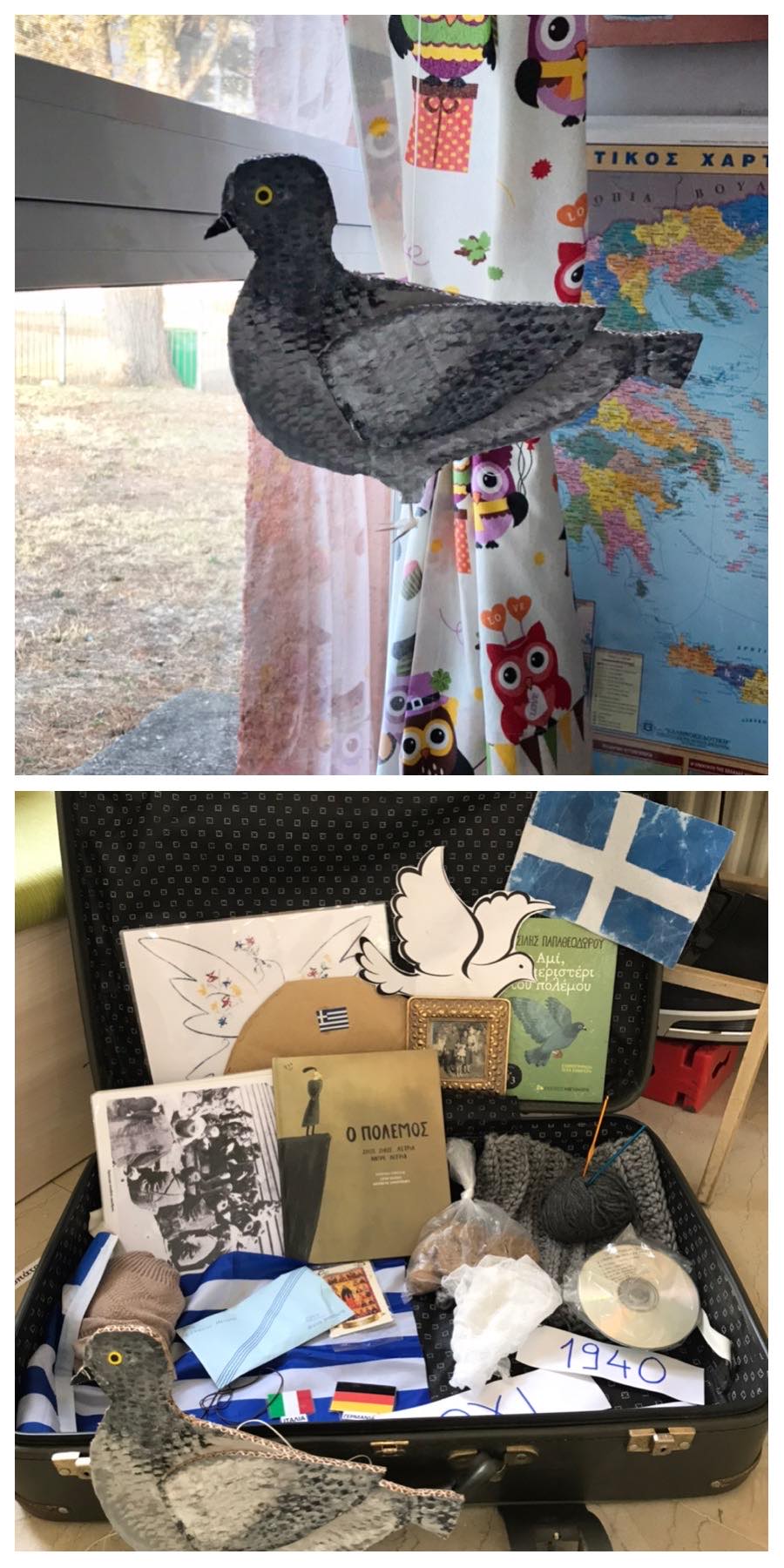 Ένα περιστέρι και μια βαλίτσα μας βοήθησαν να κατανοήσουμε τα γεγονότα του 1940. Η Σερ Αμί, το περιστέρι του πολέμου μας εξήγησε πως πετούσε ψηλά από την Ελλάδα τη χρονιά του 1940 και όσα είχαν δει τα μάτια της τα είχε φυλάξει μέσα σε αυτή τη βαλίτσα. Την άνοιξε κ καθώς μας παρουσίαζε τα αντικείμενα που περιείχε μέσα μας ξετύλιγε και το κουβάρι των γεγονότων του 1940. Τα παιδιά παρατήρησαν τις εικόνες, άκουσαν τραγούδια εκείνης της εποχής, γίνανε στρατιώτες και δραματοποιήσαν σκηνές από τη ζωή τους στο μέτωπο. Τα παιδιά παρατήρησαν πως το περιστεράκι είχε μόνο ένα πόδι. Αυτό στάθηκε αφορμή να μας πει τη δίκη της ιστορία! Η Σερ Αμί, που στα γαλλικά σημαίνει αγαπητός φίλος, είναι ένα εκπαιδευόμενο περιστέρι που στον Α΄ παγκόσμιο πόλεμο πέρασε πάνω από τις γραμμές του εχθρού, τραυματίστηκε βαριά από τα πυρά με αποτέλεσμα να χάσει το ένα της πόδι. Κατάφερε όμως να μεταφέρει το μήνυμα απόγνωσης των αποκλεισμένων στρατιωτών στο αρχηγείο τους και τελικά να τους σώσει. Γι’ αυτήν την αυτοθυσία της και τη βαθιά αίσθηση του καθήκοντος τιμήθηκε με μετάλλιο! ( από το βιβλίο “Σερ Αμι, το περιστέρι του πολέμου”) Τα παιδιά ζωγράφισαν μηνύματα ειρήνης και τα δέσαμε στο ποδαράκι της Σερ Αμί για να τα πάει στα στις χώρες που έχουν πόλεμο.
