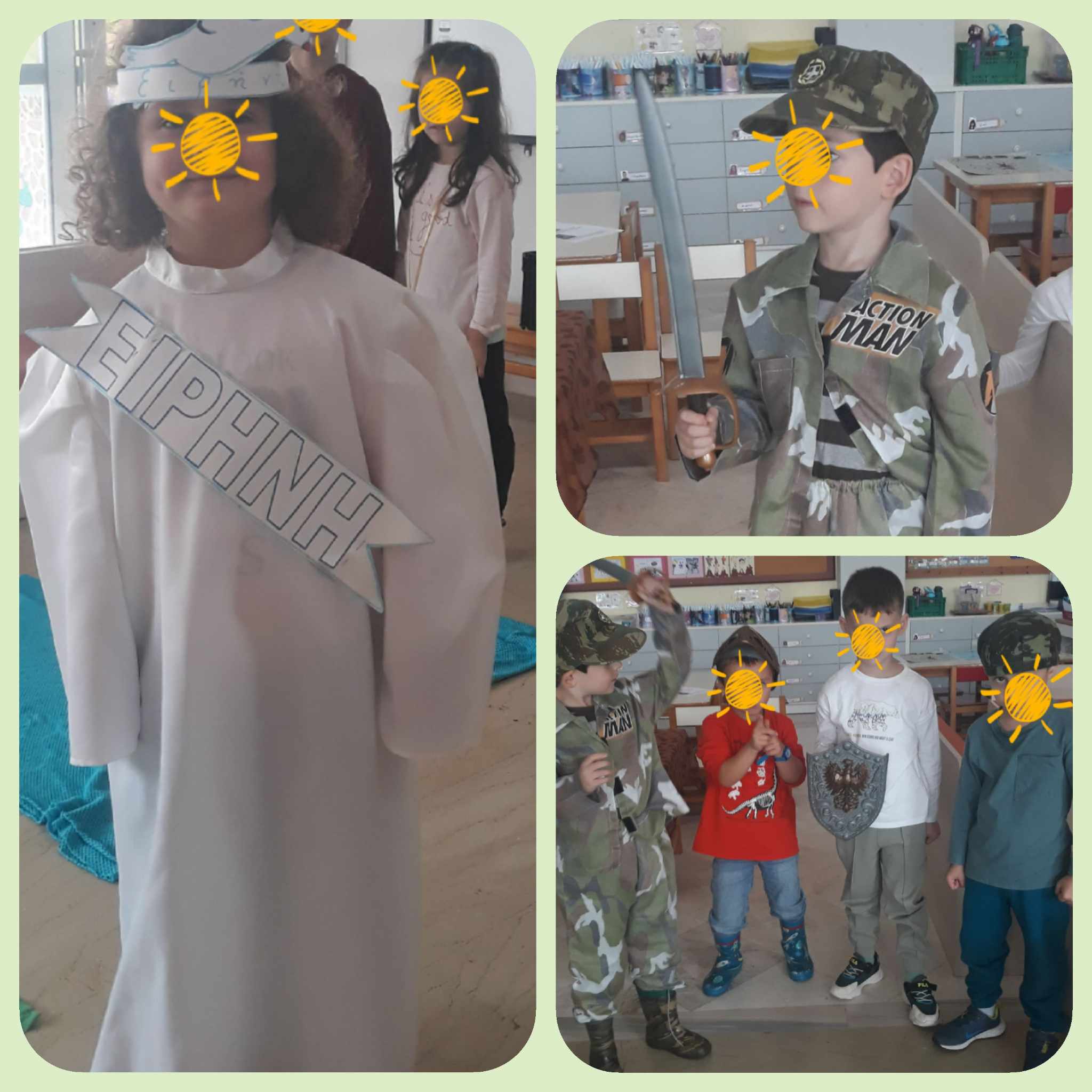 Με αφορμή το βιβλίο “Το έπος του 40’» Βάλλαμε τα γεγονότα στη σειρά .Μιλήσαμε για τον πόλεμο και την ειρήνη, είδαμε εικόνες από το βιβλίο «Πόλεμος» και το κάθε παιδί ζωγράφισε «πόλεμος είναι…Ειρήνη είναι….».Επιπλέον με φόντο το πρωτοσέλιδο εφημερίδας και στο κέντρο το ΟΧΙ τα παιδιά δημιούργησαν τους στρατιώτες του 1940.