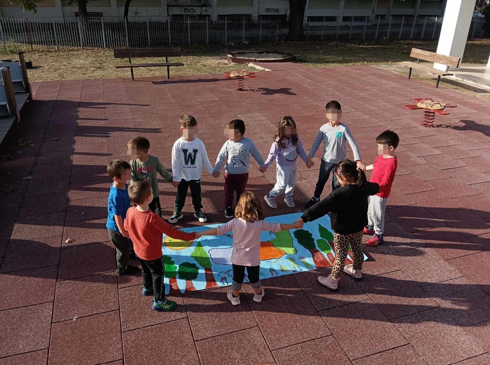 Τα παιδιά μπαίνοντας σε ένα καινούργιο περιβάλλον με άγνωστα παιδιά πρέπει να γνωριστούν ώστε να προσαρμοστούν στις νέες συνθήκες. Έπαιξαν ένα παιχνίδι γνωριμίας(με ένα ζάρι και έξι καρτέλες).Κάθε παιδί έριχνε το ζάρι, ανάλογα με τι θα τύχαινε απαντούσε σε μια ερώτηση π.χ ποιο είναι το αγαπημένο σου χρώμα, ποιο το αγαπημένο σου παιχνίδι. Με τις απαντήσεις που έδωσαν γνωρίστηκαν καλύτερα. Στη συνέχεια, προσπάθησαν ο καθένας να φτιάξει το πορτρέτο του αφού πρώτα διαβάσαμε το παραμύθι της Γιολάντα Τσορώνη-Γεωργιάδη «Η σκάλα της αγάπης».
