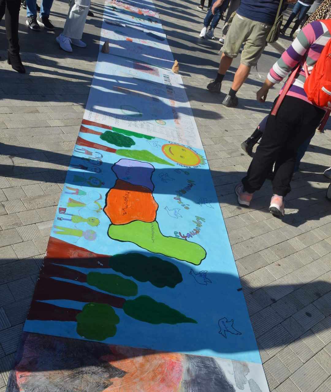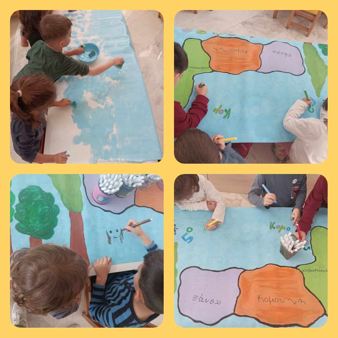 Με αφορμή το παραμύθι «Αγαπώ τα άσπρα μου παπούτσια» τα παιδιά χωριστήκαν σε ομάδες(άσπρη, κόκκινη, μπλε, πράσινη, πορτοκαλί).Σε ένα χαρτόνι κάνσον χωρισμένο σε πέντε μέρη (όσα και οι ομάδες)η κάθε ομάδα ζωγράφισε ένα όμορφο τοπίο. Στη συνέχεια τοποθετήθηκαν φωτογραφίες των παιδιών και η κάθε ομάδα έβαψε παπούτσια στο δικό της χρώμα για κάθε παιδί.