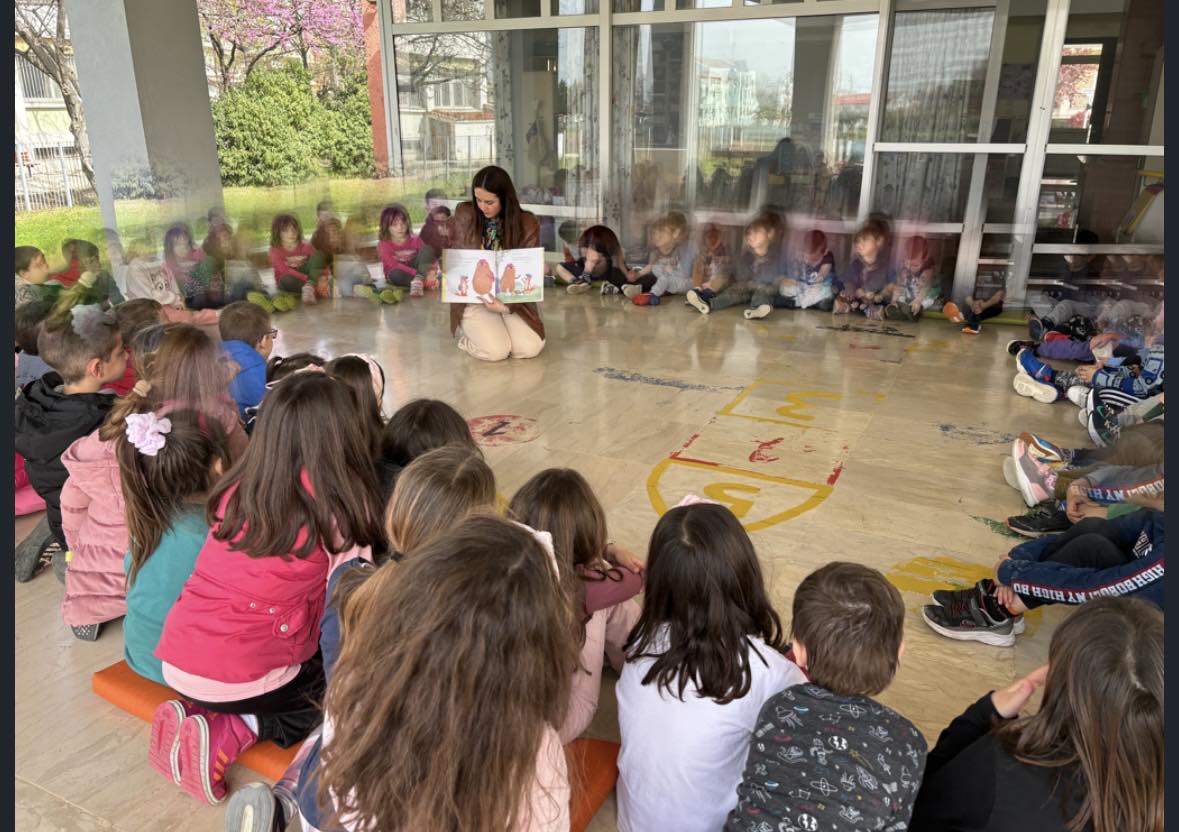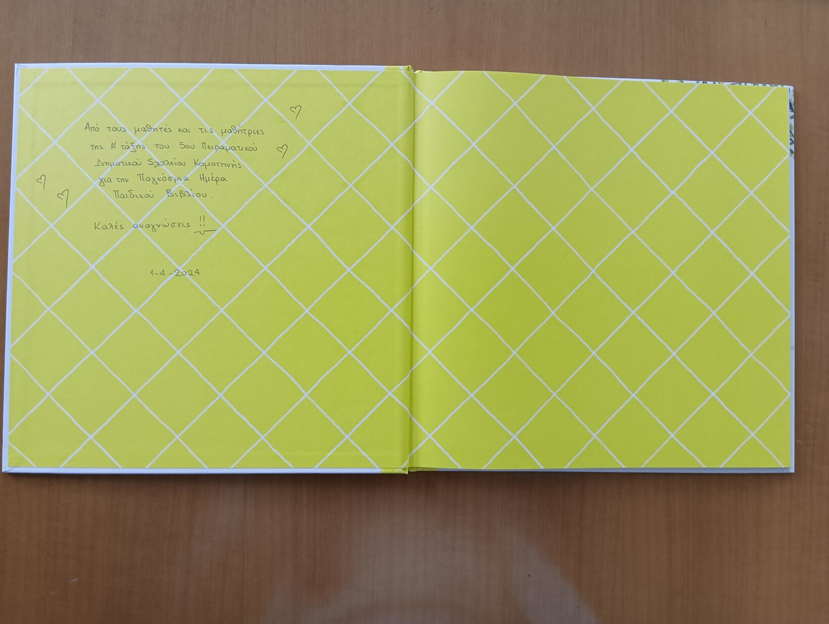 Οι μαθητές των τμημάτων της Α’ τάξης του 5ου Πειραματικού Δημοτικού Σχολείου Κομοτηνής και οι εκπαιδευτικοί τους επισκέφθηκαν το Νηπιαγωγείο μας, για να γιορτάσουμε μαζί την Παγκόσμια Ημέρα Παιδικού Βιβλίου! Μας διάβασαν ένα όμορφο παραμύθι και μας το χάρισαν με μια γλυκιά αφιέρωση. Στη συνέχεια, εμπνευστήκαμε όλοι μαζί τη δική μας ιστορία. Στη συνέχεια, τα νήπια την εικονογραφήσανε και χαρίσανε το βιβλίο στα παιδάκια του Δημοτικού Σχολείου!