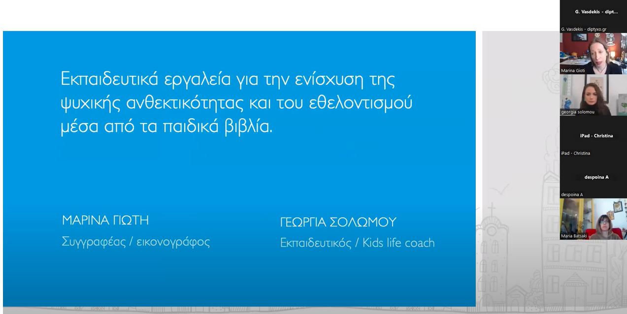 Η βραβευμένη συγγραφέας και εικονογράφος, Μαρίνα Γιώτη και η εκπαιδευτικός και πιστοποιημένη kids life coach, Γεωργία Σολωμού σε ένα σεμινάριο για εκπαιδευτικούς και γονείς με στόχο να αναδείξουν τα παιδικά βιβλία ως εργαλεία ενίσχυσης της ψυχικής ανθεκτικότητάς των παιδιών. Παρουσιάστηκαν πρακτικοί τρόποι με τους οποίους μπορούμε να ενδυναμώσουμε ψυχικά τα παιδιά μέσα από τη λογοτεχνία, προκειμένου να μεγαλώσουν με αυτοπεποίθηση, να αποκτήσουν δεξιότητες που να τα βοηθήσει να αντιμετωπίσουν έναν κόσμο που αλλάζει διαρκώς και να γίνουν πιο ευτυχισμένοι ενήλικες. Ένα σεμινάριο για εκπαιδευτικούς, γονείς, αλλά και όσους αγαπούν τα παιδικά βιβλία. Παρακολουθήσαμε το σεμινάριο, το οποίο είναι πλέον διαθέσιμο δωρεάν στο κανάλι youtoube και ακολούθησε εποικοδομητική συζήτηση και ανταλλαγή απόψεων μεταξύ των μελών του Συλλόγου Διδασκόντων του Νηπιαγωγείου.