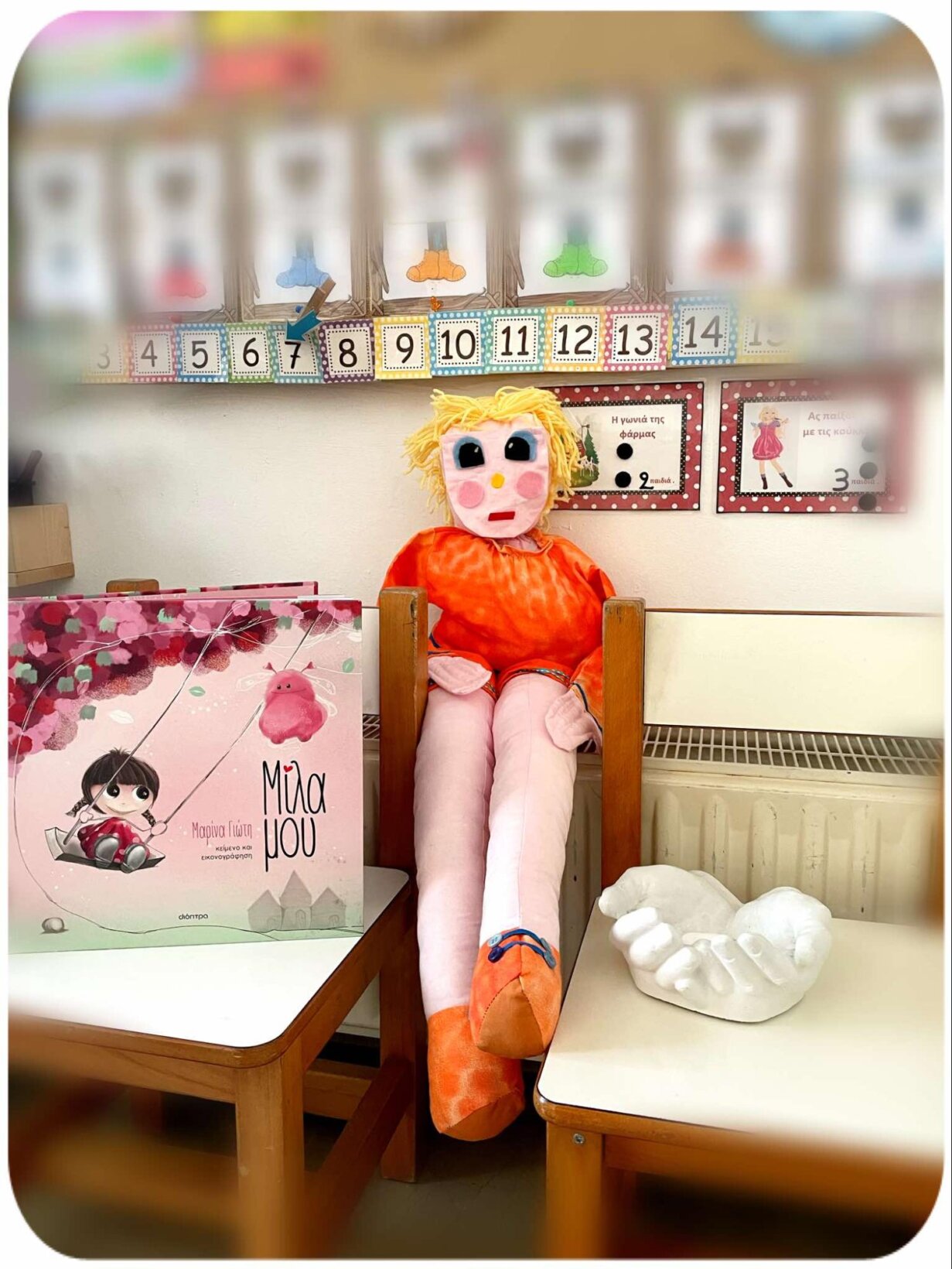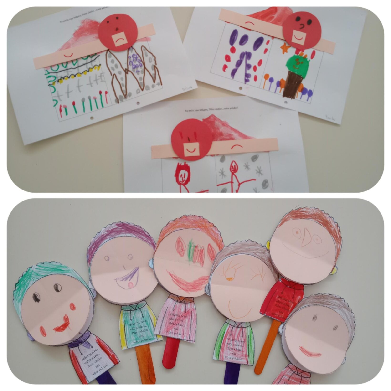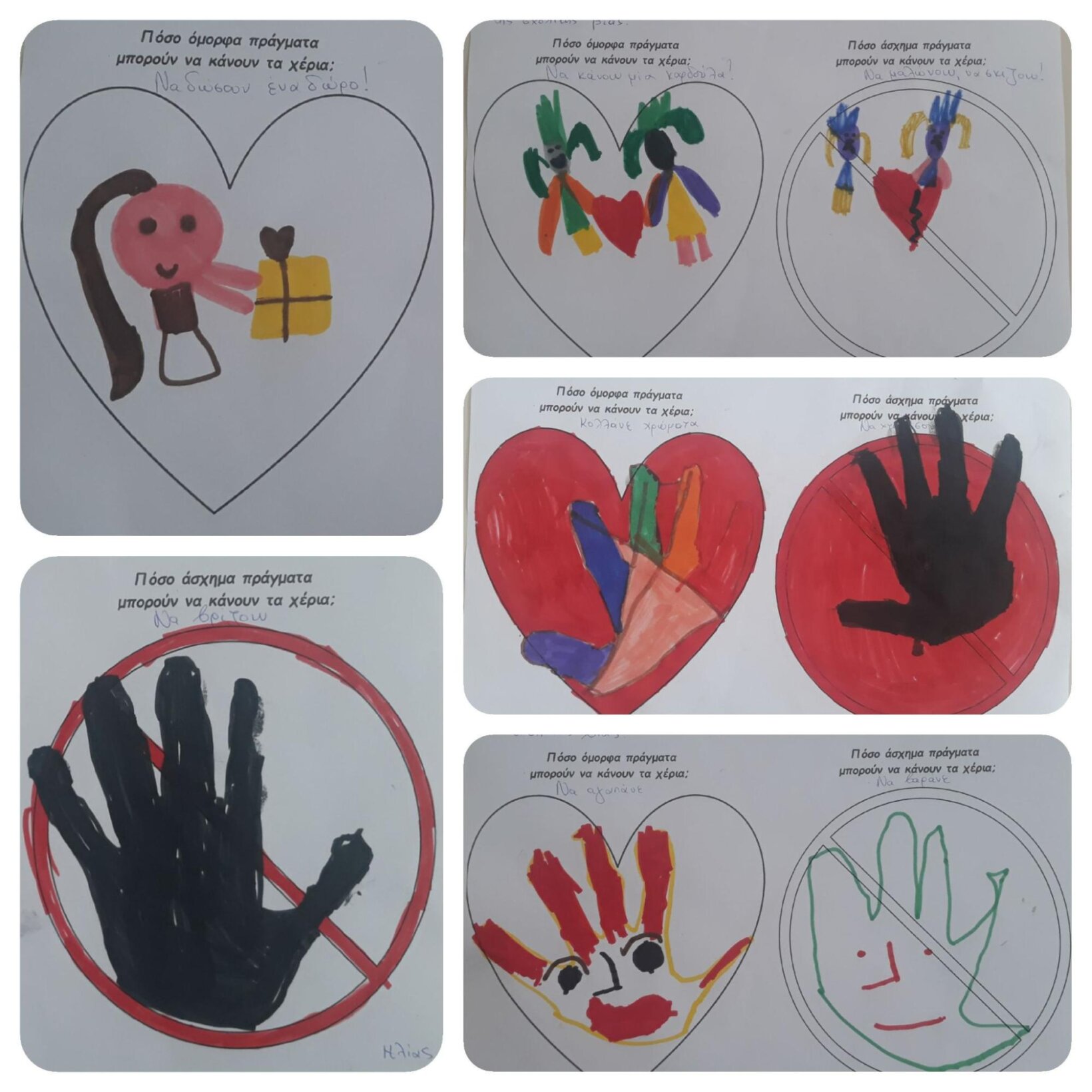 Η ιστορία του βιβλίου «Τα χέρια δε χτυπάνε, τα χέρια αγαπάνε» έθεσε τον προβληματισμό στα παιδιά για το τι μπορεί να κάνει ένα λυπημένο και θυμωμένο χέρι και πώς μπορούν τα χέρια να αποκτήσουν χρώματα. Η ηρωίδα του βιβλίου η «Πολύχρωμη» μας μίλησε για τη χρωματιστή πλευρά της ζωής. Στη συνέχεια, ακούγοντας το τραγούδι «Υπάρχουν χέρια», Locomondo, τα παιδιά εργάστηκαν σε ομάδες αλλά και ατομικά, ομαδοποίησαν τις εικόνες του τραγουδιού και αποτύπωσαν εικαστικά τις σκέψεις και τις ιδέες τους: «Τι χέρια θα θέλαμε να συναντήσουμε στη ζωή μας;» ΘΕΛΟΥΜΕ ΧΕΡΙΑ ΠΟΥ ΑΓΚΑΛΙΑΖΟΥΝ, ΠΟΥ ΧΑΪΔΕΥΟΥΝ, ΠΟΥ ΑΓΑΠΑΝΕ, ΠΟΥ ΒΟΗΘΟΥΝ, ΠΟΥ ΓΙΑΤΡΕΥΟΥΝ ΚΑΙ ΦΡΟΝΤΙΖΟΥΝ, ΧΕΡΙΑ ΠΟΥ ΜΑΣ ΣΗΚΩΝΟΥΝ ΨΗΛΑ.