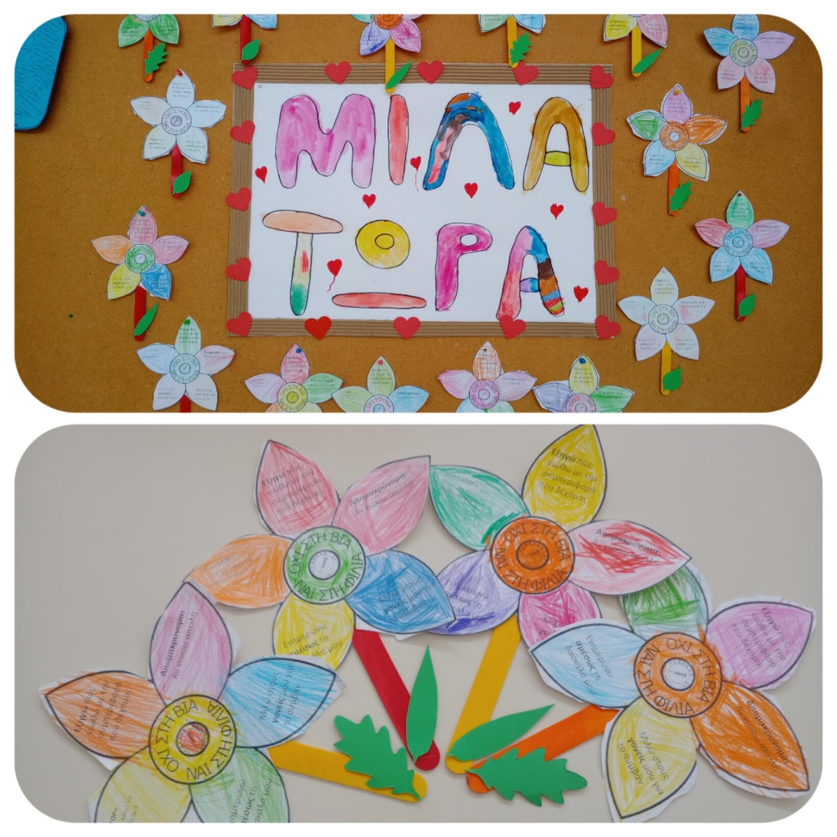 Το μήνυμα κατά του σχολικού εκφοβισμού “ΜΙΛΑ” εμφανίζεται στις τάξεις μας. Οι μαθητές προσπαθούν να διαβάσουν τη λέξη, ενώ τη γράφουν αυθόρμητα την ώρα των ελεύθερων δραστηριοτήτων.