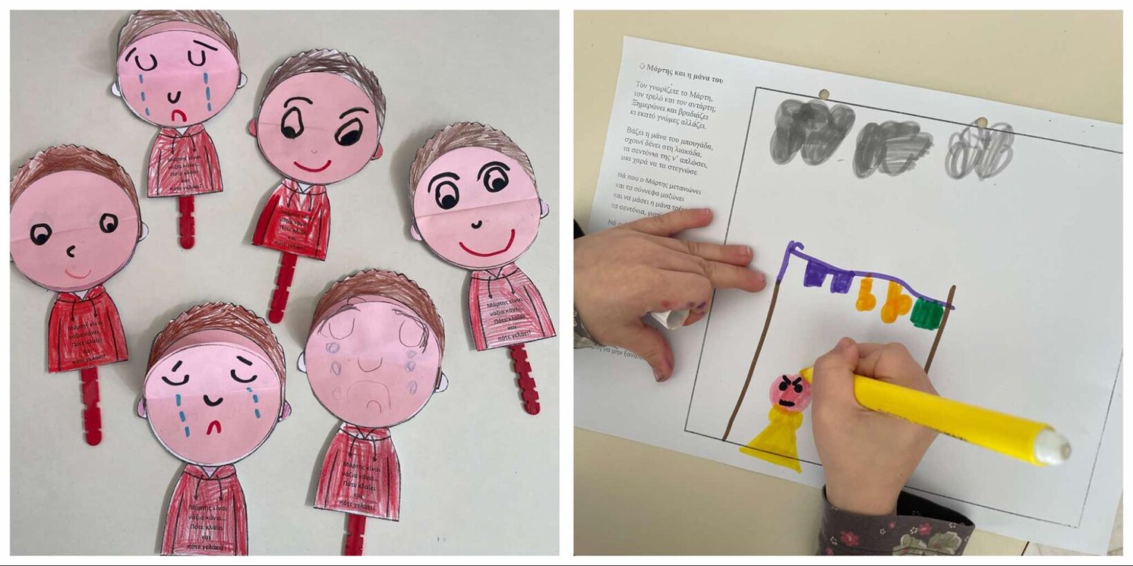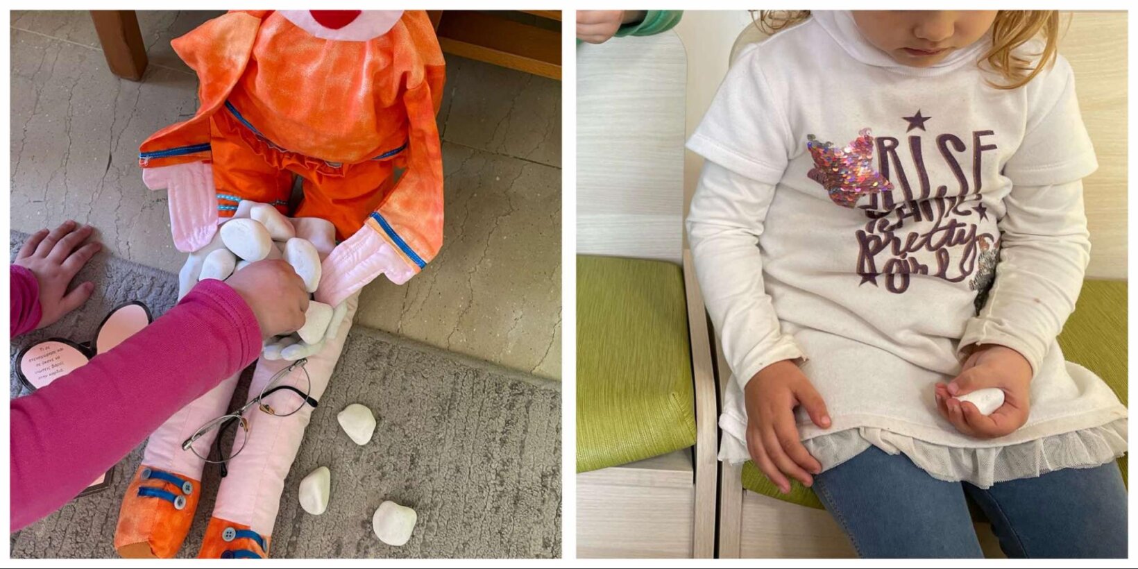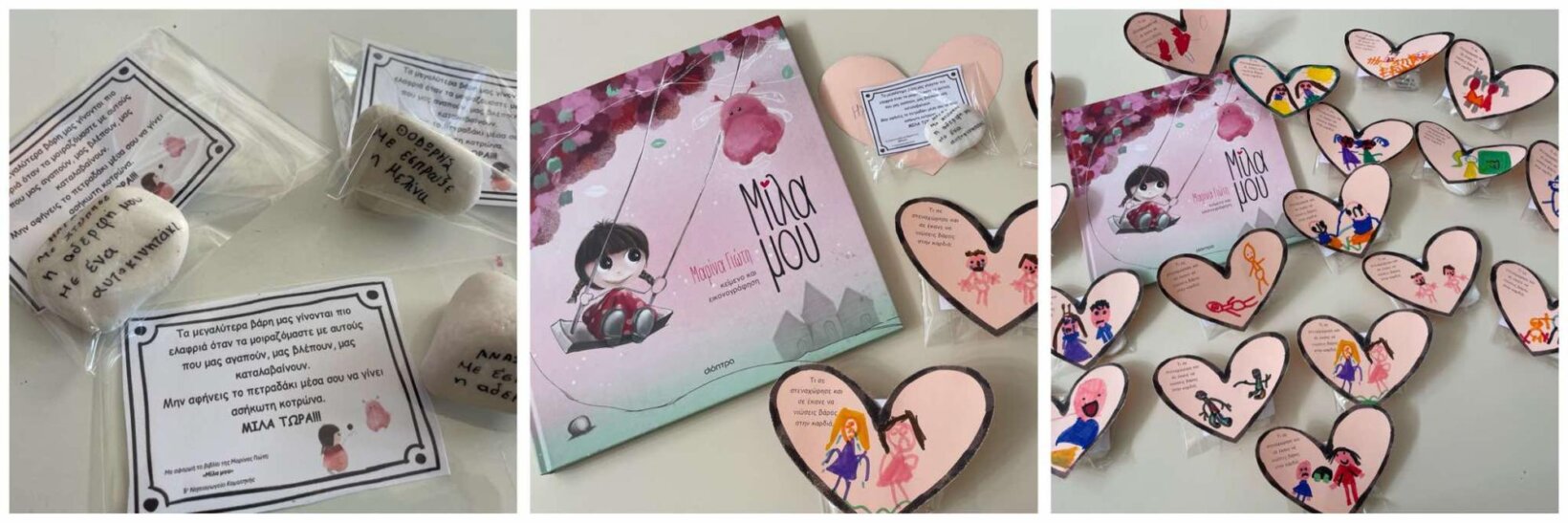 Τον ρωτήσαμε τι έχει, τι τον έχει στεναχωρήσει. Στην αρχή ήταν διστακτικός στη συνέχεια μας είπε ότι είχε ένα βάρος στην καρδιά του, το οποίο δεν τον άφηνε να χαρεί. Σήκωσε την μπλούζα του και έβγαλε από μέσα ένα σακουλάκι γεμάτο πέτρες. Μας εξήγησε πως αυτό το βάρος του δημιουργήθηκε από μία άσχημη συμπεριφορά ενός συμμαθητή του προς αυτόν, η οποία τον στεναχώρησε. Τα παιδιά κράτησαν στα χέρια τους τις πέτρες και συζητήσαμε πόσο δύσκολο είναι να κουβαλάμε ένα τέτοιο βάρος μέσα μας και με ποιο τρόπο θα μπορούσαμε να βοηθήσουμε τον Κωστή. Τα παιδιά πρότειναν στον φίλο μας να μας πει τι ακριβώς τον απασχολεί για να βγάλει το βάρος από μέσα του. Καθώς μας περιέγραφε την άσχημη συμπεριφορά του συμμαθητή του και τα συναισθήματα που ένιωσε, ένα ένα παιδί έπαιρνε στα χέρια του μία από τις πολλές του πέτρες. Στο τέλος όλοι είχαμε στα χέρια μας από μία πέτρα. Ο Κωστής τώρα ένιωθε πιο ανάλαφρος και ήταν πια χαρούμενος. Συζητήσαμε για το πόσο σημαντικό είναι να μιλάμε και να μοιραζόμαστε συναισθήματα και σκέψεις που μας βαραίνουν με άτομα που μας αγαπούν και εμπιστευόμαστε. Στη συνέχεια, κρατώντας την πέτρα στα χέρια μας κλείσαμε τα μάτια και προσπαθήσαμε να σκεφτούμε κάτι που μας στεναχώρησε πολύ και νιώσαμε βάρος στην καρδιά μας. Κάθε παιδί ζωγράφισε τη σκέψη του σε μία καρδιά και μας την παρουσίασε στην ολομέλεια. (δραστηριότητα από το βιβλίο “Καλώς ήρθες στον κόσμο που μπορείς).
