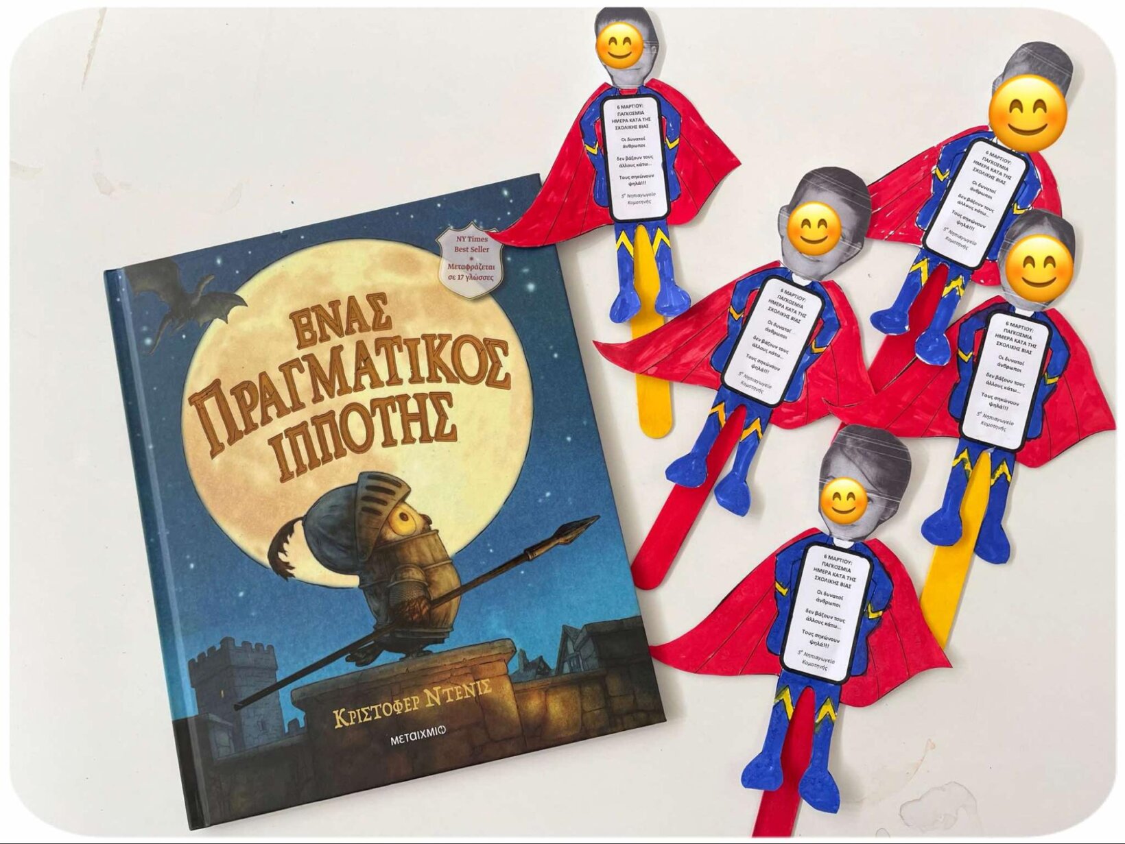 Την επόμενη μέρα διαβάσαμε το βιβλίο με τίτλο “Ένας πραγματικός ιππότης”. Ο μικρός Βάγιας μας έμαθε ότι δυνατός και ιππότης δεν είναι αυτός που χρησιμοποιεί τη σωματική του δύναμη ή τα όπλα του, αλλά αυτός ο οποίος χρησιμοποιεί το μυαλό του. Με αφορμή το παραμύθι μεταμορφωθήκαμε σε ήρωες και μάθαμε το σύνθημα “Οι δυνατοί άνθρωποι δεν βάζουν τους άλλους κάτω… Τους σηκώνουν ψηλά”.