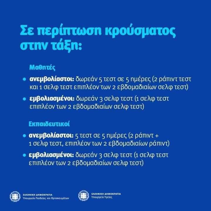 Ενημέρωση για την επιστροφή στα σχολεία 10/1/2022-self test-νέο υγειονομικό πρωτόκολλο.