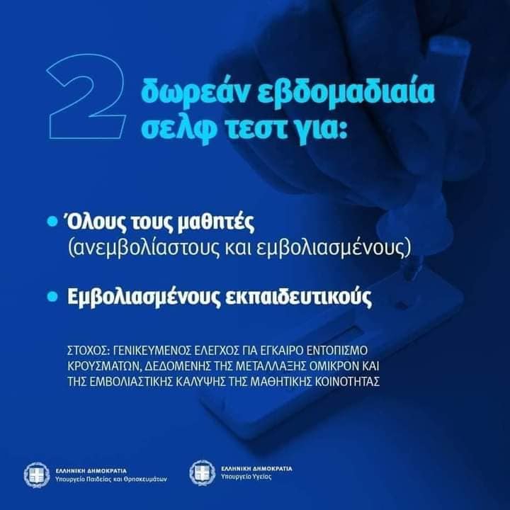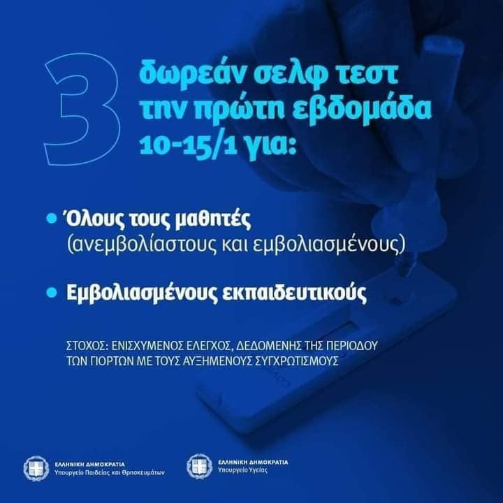 Σας ενημερώνουμε ότι θα πρέπει να προμηθευτείτε από την Τετάρτη 5 Ιανουαρίου έως και το Σάββατο 8 Ιανουαρίου, πέντε (5) δωρεάν αυτοδιαγνωστικά (self) τεστ από τα φαρμακεία, προκειμένου να καλύψετε τις ανάγκες των δύο πρώτων εβδομάδων επαναλειτουργίας των σχολείων, δηλαδή από 10 Ιανουαρίου έως και 21 Ιανουαρίου 2022.
