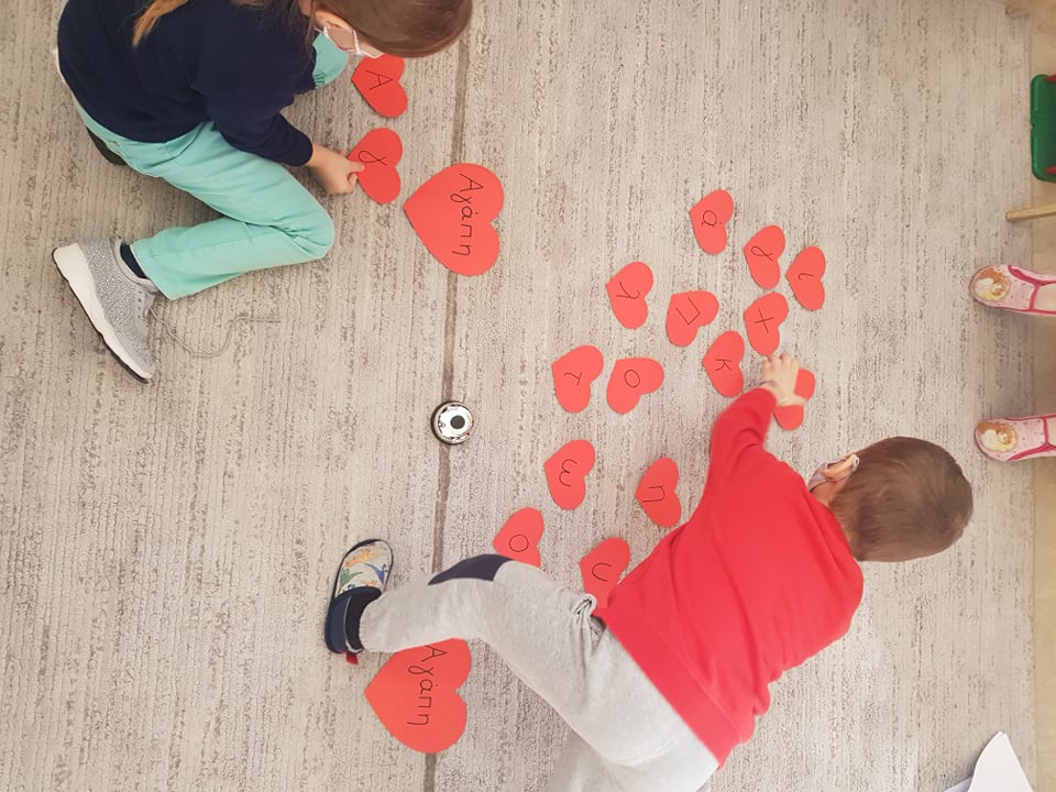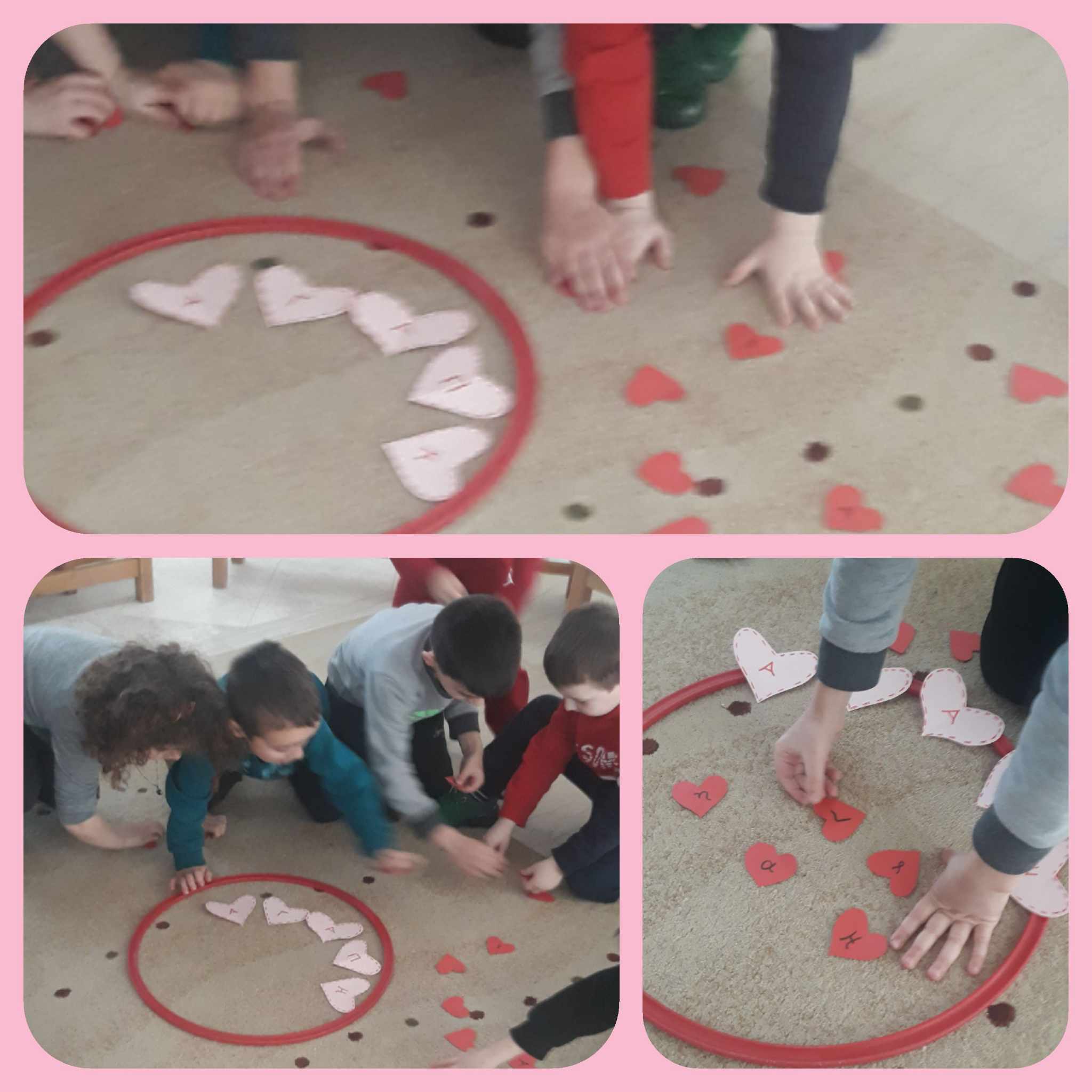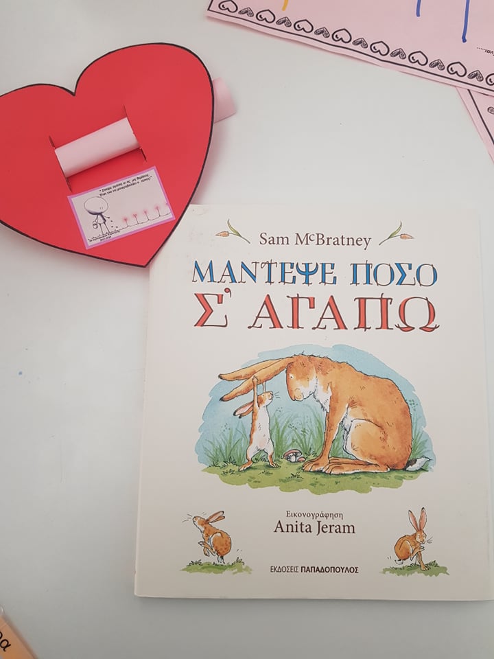 Παρακολουθήσαμε το παραμύθι “ΑΓΑΠΗ”: “ Όταν αγαπάς κάποιος θέλεις να βρίσκεσαι κοντά του. όσο πιο κοντά γίνεται…Η αγάπη μας ζεσταίνει την καρδιά σαν ένα ζεστό, μαγικό κασκόλ…Η αγάπη είναι σαν μια αόρατη κλωστή που μπορεί να μακραίνει και να τεντώνεται όσο χρειαστεί για να μας κρατήσει πάντα ενωμένους…Η κλωστή μας μπορεί να χαλαρώσει, να τεντωθεί πολύ ακόμη και να μπερδευτεί, αλλά ποτέ δε θα κοπεί…” Με την ευχή να βρισκόμαστε “ΟΠΟΥ ΥΠΑΡΧΕΙ ΑΓΑΠΗ” παίξαμε ένα ψυχοκινητικό παιχνίδι “ενώνοντας” τις καρδιές μας!