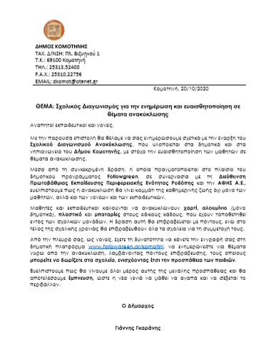 Και φέτος το Νηπιαγωγείο μας συμμετέχει στον Σχολικό Μαραθώνιο «Πάμε Ανακύκλωση» που διοργανώνεται από τον Δήμο Κομοτηνής και ξεκινάει από 1/10/2025.