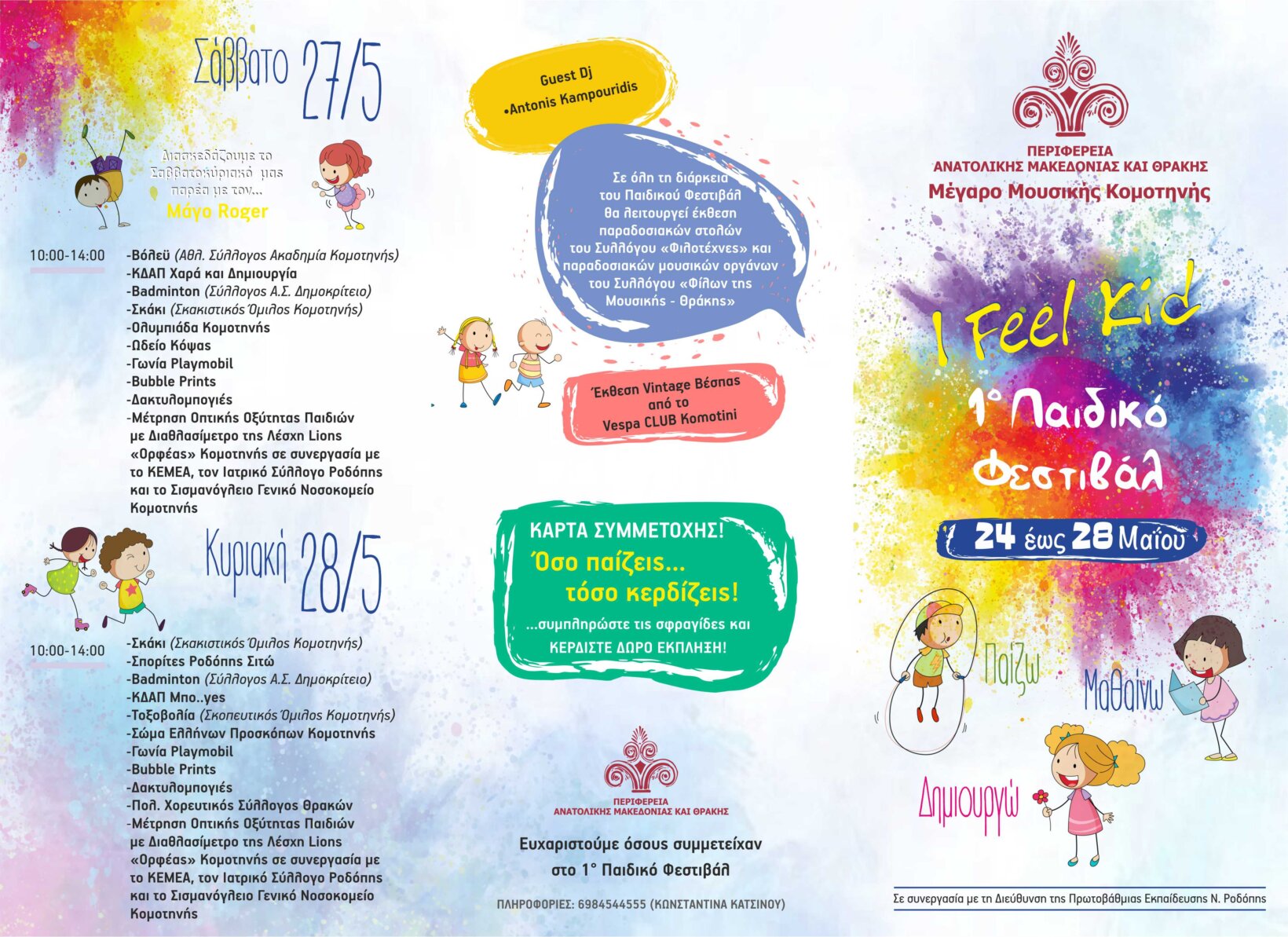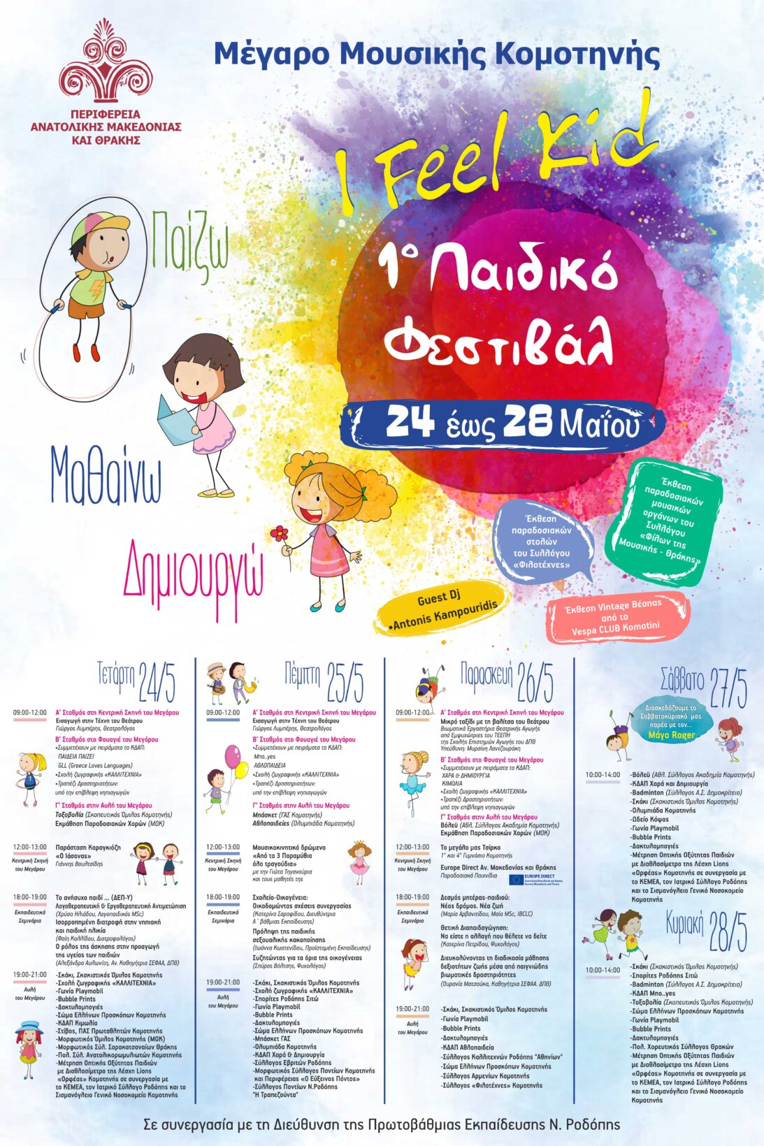 H Περιφέρεια Ανατολικής Μακεδονίας και Θράκης διοργανώνει το 1ο Παιδικό Φεστιβάλ «Παίζω, Μαθαίνω, Δημιουργώ» στο Μέγαρο Μουσικής Κομοτηνής, από την Τετάρτη 24 Μαΐου έως και την Κυριακή 28 Μαΐου2023, κατά τις πρωινές ώρες 9:00 έως 13:00 και τις απογευματινές ώρες 18:00 έως 21:00, με την συνεργασία της Δ/νσης Α/θμιας Εκπαίδευσης Ροδόπης και των συλλόγων και φορέων της περιοχής.