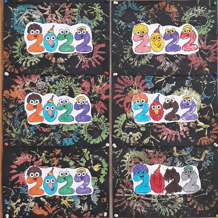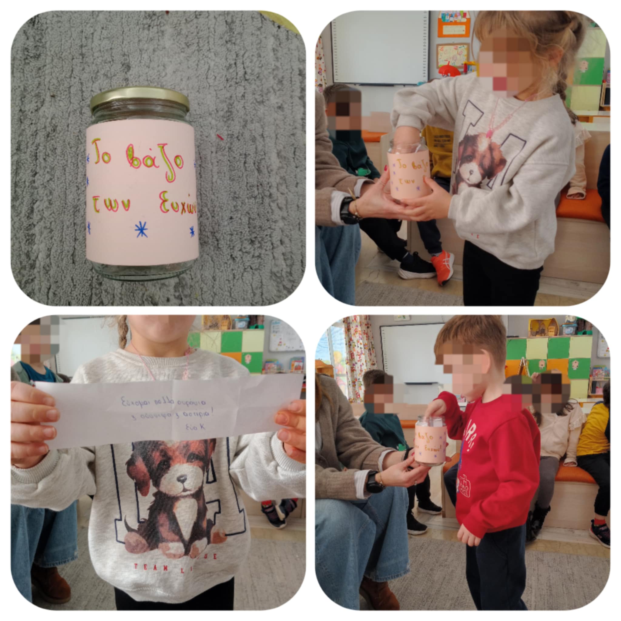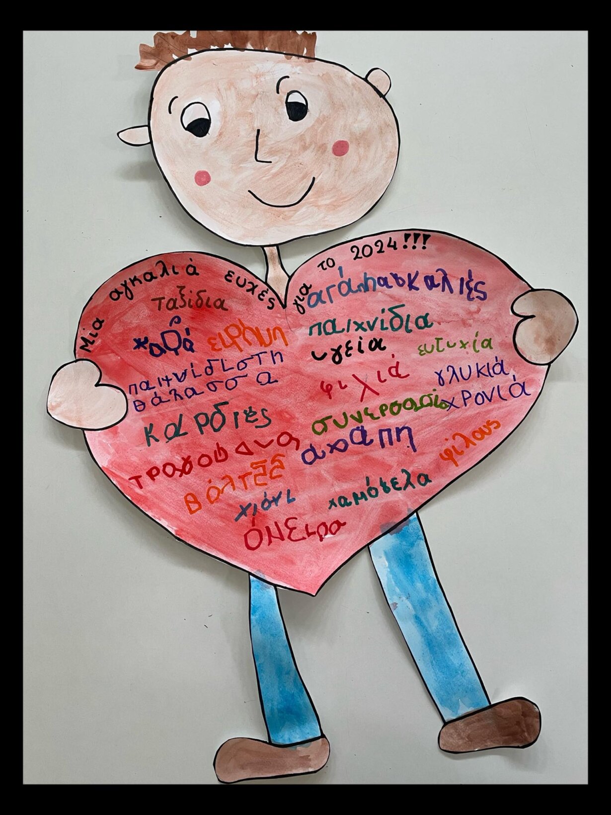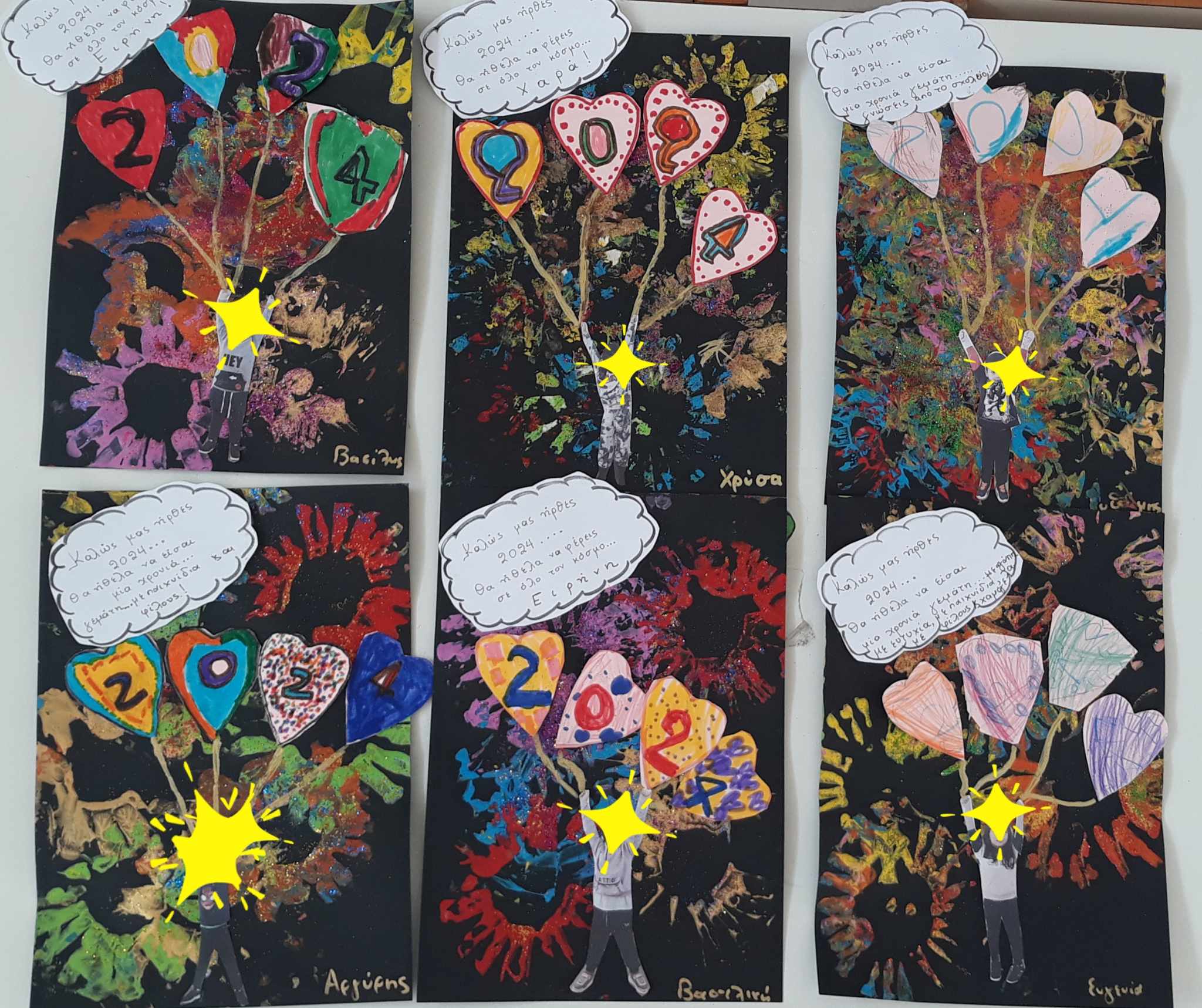 «Μια αγκαλιά ευχές για το 2024» Στο τι νέα είχαμε το βάζο των ερωτήσεων όπου κάθε παιδί τραβούσε από ένα χαρτάκι κι απαντούσε στην ερώτηση που του τύχαινε σχετικά με τις διακοπές των Χριστουγέννων. Παίξαμε ευχοπόλεμο με ευχές που καταγράψαμε σε άσπρα χαρτιά. Στο τέλος κάθε παιδί άνοιγε τη χιονόμπαλα που έπιασε, τ ην ευχή που του έτυχε για τη νέα χρόνια και την κατέγραφε στην καρδιά του κυρίου 2024 που σχεδίασαν και χρωμάτισαν τα ίδια τα παιδιά.