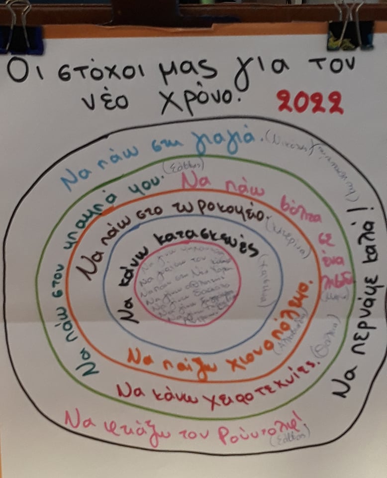 «Ο στόχος του σκίουρου για τη νέα χρονιά» και «Γέτι η δύναμη του ακόμη» ήταν τα δυο παραμύθια που μας βοήθησαν να κατανοήσουμε τι είναι ένας στόχος και να σκεφτούμε ποιο στόχο θέλει ο καθένας μας να βάλει για τη νέα χρονιά. Συζητήσαμε σε τι θα θέλαμε να γίνουμε καλύτεροι, τι είναι αυτό που δεν μπορούμε να καταφέρουμε ΑΚΟΜΗ και θα θέλαμε μέσα στη χρονιά να το πετύχουμε. ” ΤΙ ΔΕΝ ΕΧΩ ΚΑΤΑΦΕΡΕΙ ΑΚΟΜΗ ΚΑΙ ΘΕΛΩ ΝΑ ΠΡΟΣΠΑΘΗΣΩ ΝΑ ΤΟ ΠΕΤΥΧΩ;” Και αφού ζωγραφίσαμε το δικό μας φανταστικό Γέτι ατομικά και ομαδικά θέσαμε και τον στόχο μας για το 2024. Ακολούθησε ” το κυνήγι του στόχου μας “
