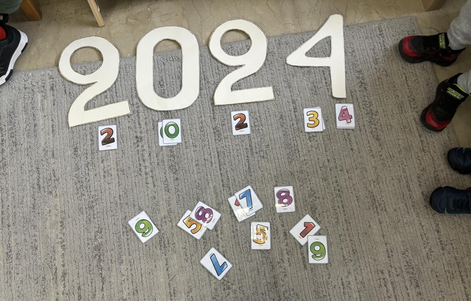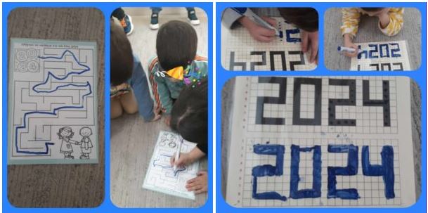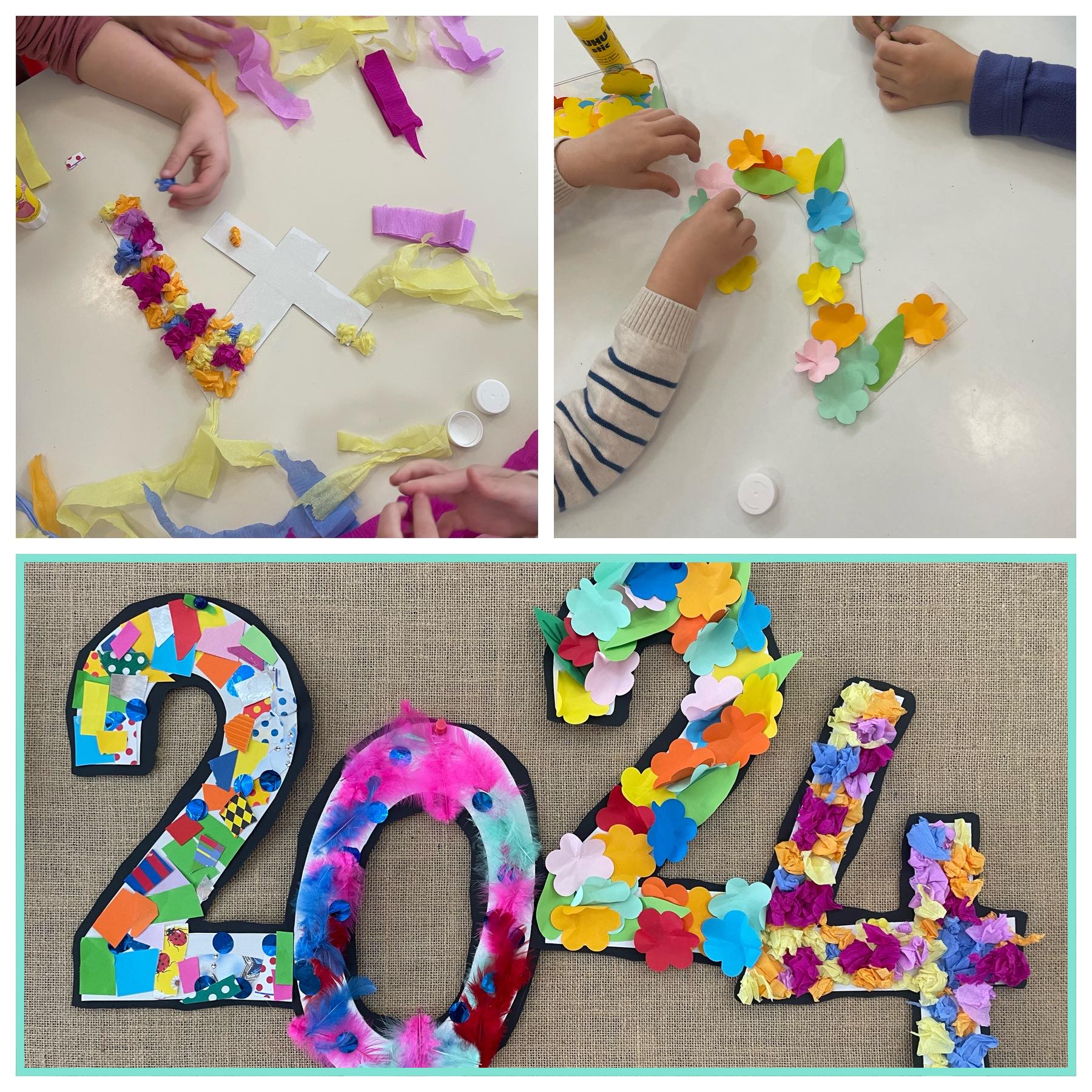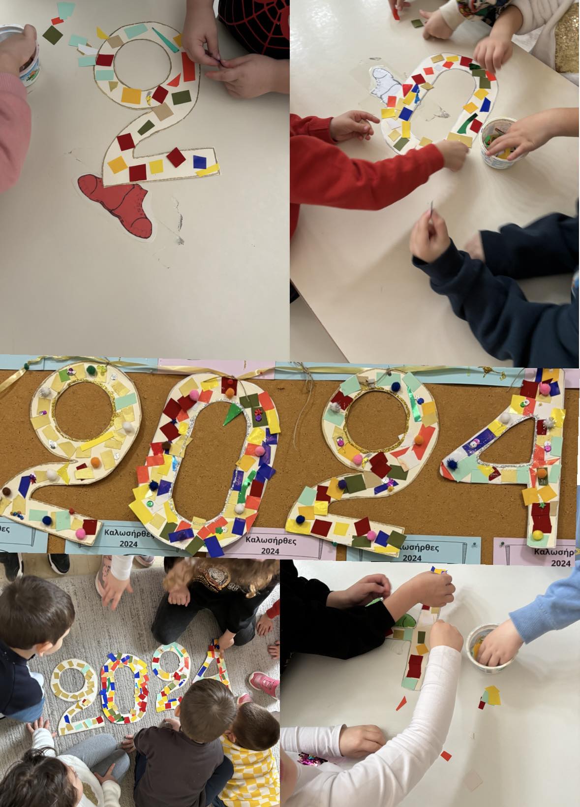 Παίξαμε, και πειραματιστήκαμε με τους αριθμούς του και στη συνέχεια διακοσμήσαμε το 2024 με πολύχρωμα χαρτάκια ,πον πον και πούλιες .