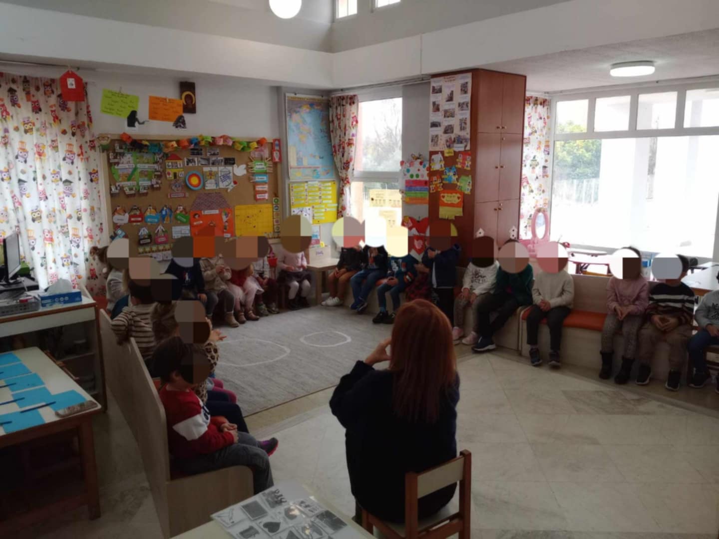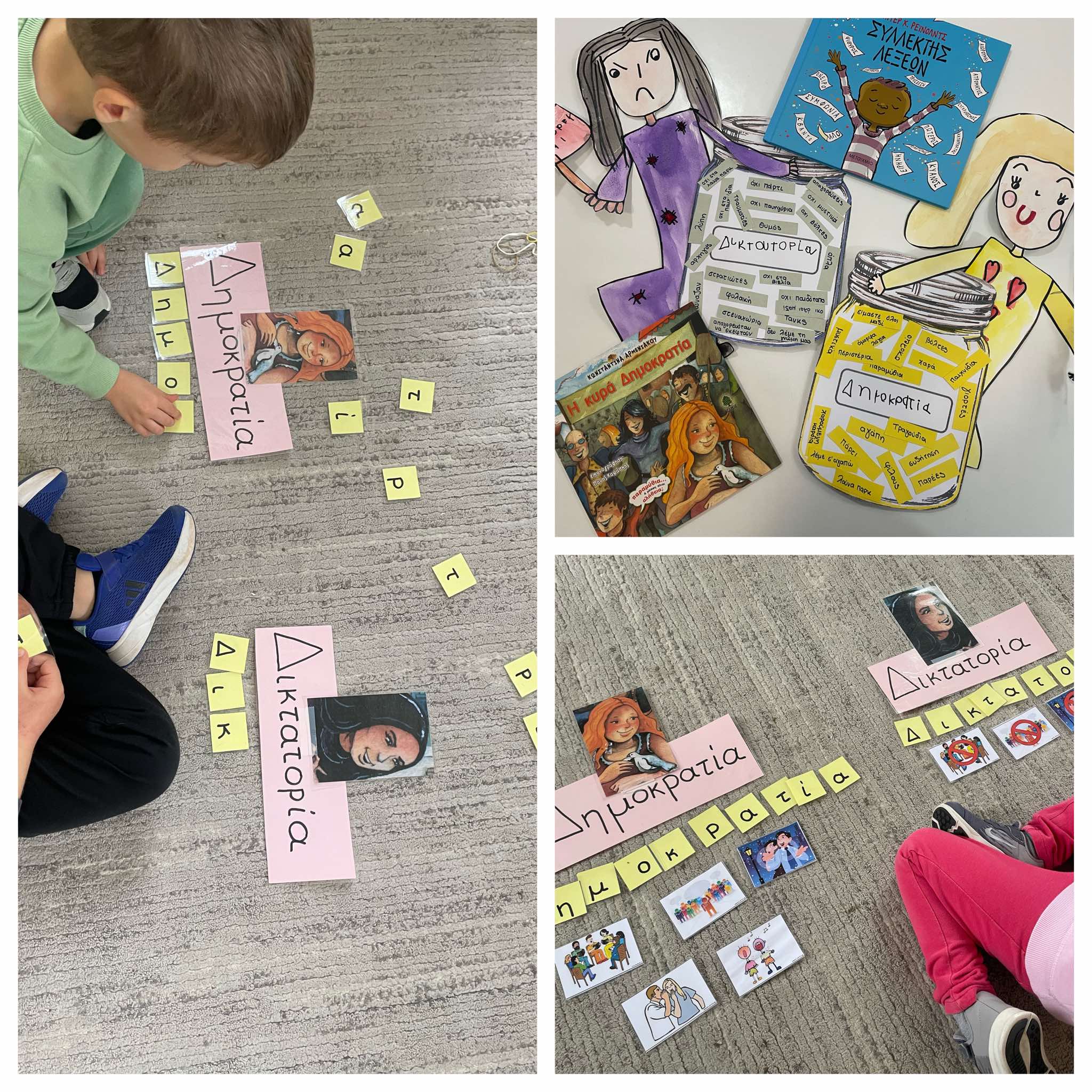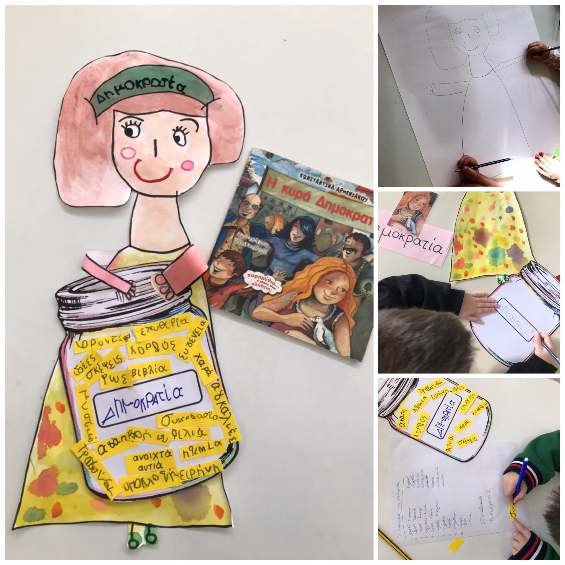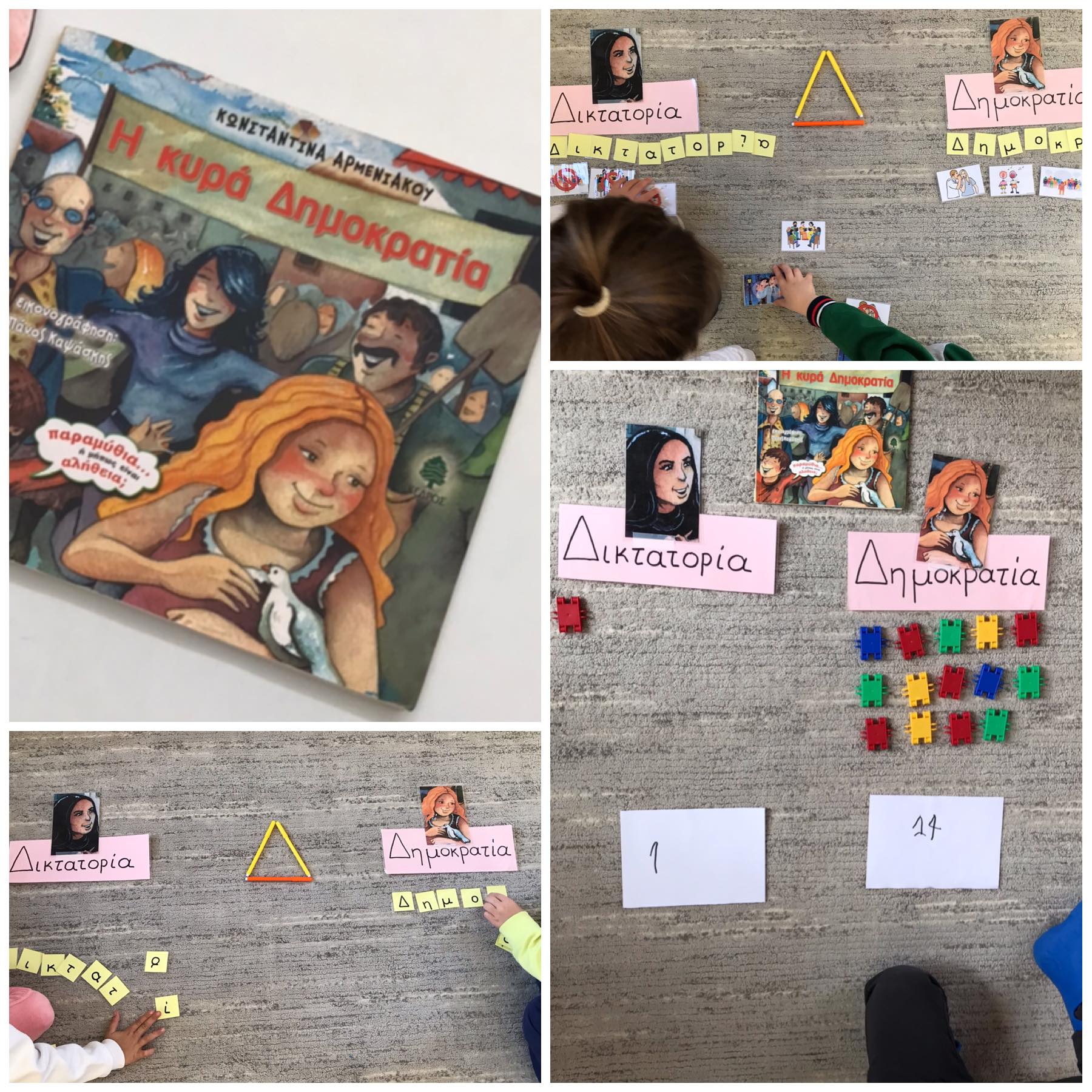 Διαβάσαμε το βιβλίο « Η κυρά Δημοκρατία». Γνωρίσαμε τις δυο κύριες την Δημοκρατία και την Ρία την Δικτατορία. Παρουσιάσαμε την κυρία Δημοκρατία και την κυρία Δικτατορία ως δυο φίλες που ήρθαν στην τάξη μας .Μάθαμε για τις συνήθειες και των δύο. Ταξινομήσαμε εικόνες που ταίριαζαν στην κάθε μια, παίξαμε με τα ονόματα τους και ψηφίσαμε ποια θα θέλαμε εμείς για αρχηγό μας και γιατί.
