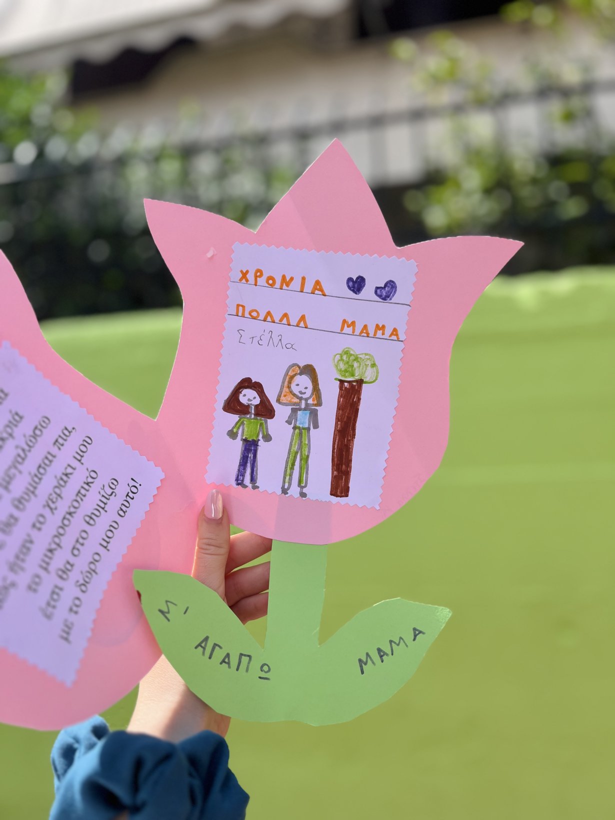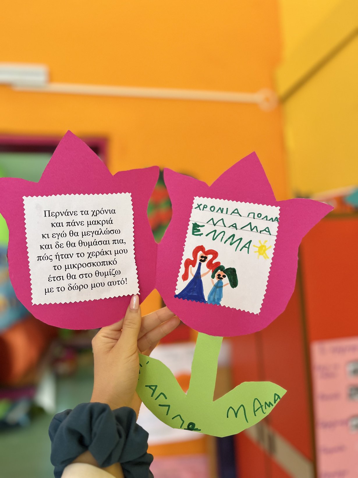 Μία από τις σημαντικές Παγκόσμιες Ημέρες είναι η γιορτή της μητέρας! Η σημασία της μητέρας στη ζωή ενός παιδιού είναι τεράστια. Οι μικροί μας μαθητές, θέλοντας να δείξουν στις μανούλες τους πόσο τις αγαπούν, κατασκεύασαν μια κάρτα σε σχήμα τουλίπας, μέσα στην οποία απεικόνισαν τους ίδιους με τη μητέρα τους αλλά και γράφοντας όμορφες ευχές!!!
