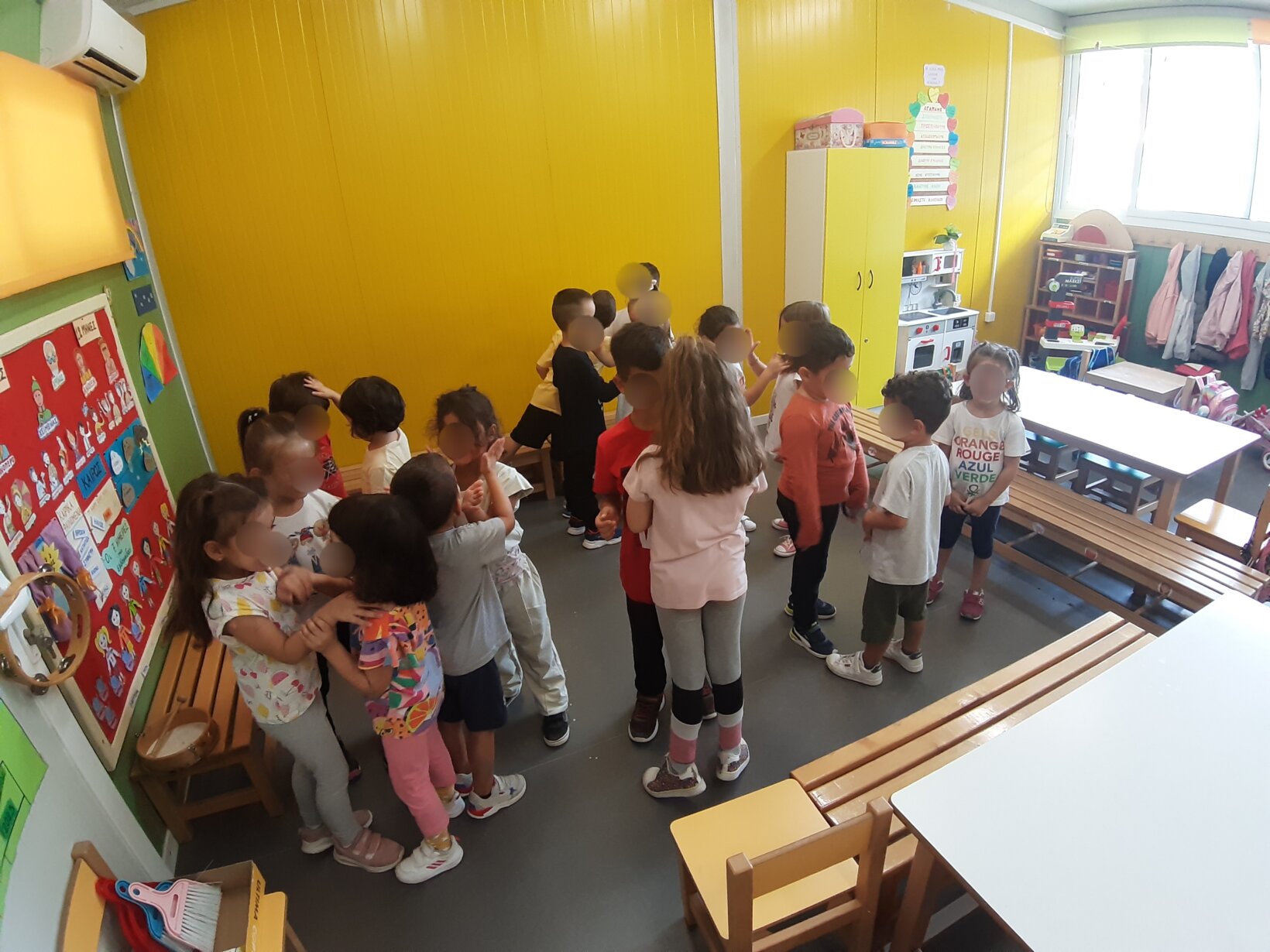 Η αυλή είναι πλαισιωμένη με δέντρα και λουλούδια και διαθέτει μια τσουλήθρα και δύο τραμπάλες. Επιπλέον έχουν φτιαχτεί από τις νηπιαγωγούς, επιδαπέδια παιχνίδια ώστε τα παιδιά να χαίρουν ποικίλους τρόπους αλληλεπίδρασης και διάδρασης.