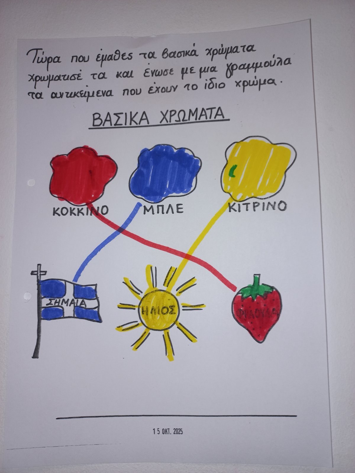 Επειδή αγαπά τα χρωματα και τα παιδιά, ήρθε στο Νηπιαγωγείο για να μας μάθει όλα τα χρώματα, τα βασικά,τα βοηθητικά, τις αναμείξεις και τις αποχρώσεις…Αρχικά μας είπε την ιστορία του ,πως δηλαδή με τρία βασικά χρώματα(κοκκινο,κιτρινο μπλε) και δύο βοηθητικά(άσπρο,μαυρο), κατάφερε να βάψει πολύχρωμο το σπίτι του.