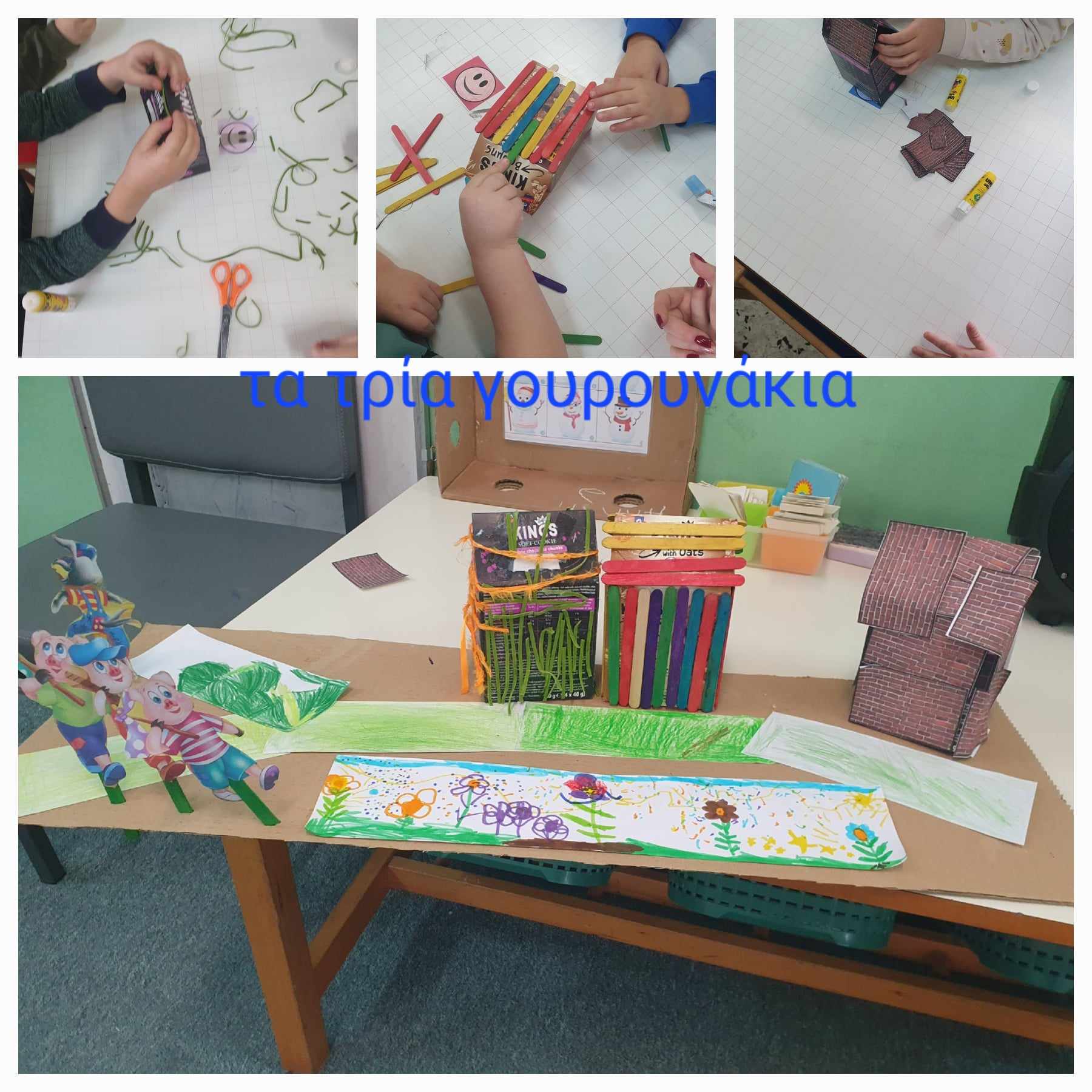 Μετά την παρουσίαση του βιβλίου από τη φίλη μας τα παιδιά αποτύπωσαν στο χαρτί αυτό που τους εντυπωσίασε περισσότερο από το βιβλίο. Έγινε ο απαραίτητος σχολιασμός και αποφασίστηκε να φτιάξουν τα παιδιά τα σπίτια των γουρουνιών. Χωρίστηκαν σε ομάδες. Άλλη έφτιαξε λουλούδια, άλλη χορτάρι, άλλες τα σπιτάκια. Το αποτέλεσμα ήταν εντυπωσιακό. Στη συνέχεια πήραν τους ήρωες του βιβλίου και έπαιξαν κουκλοθέατρο χρησιμοποιώντας τη μακέτα που είχαν φτιάξει