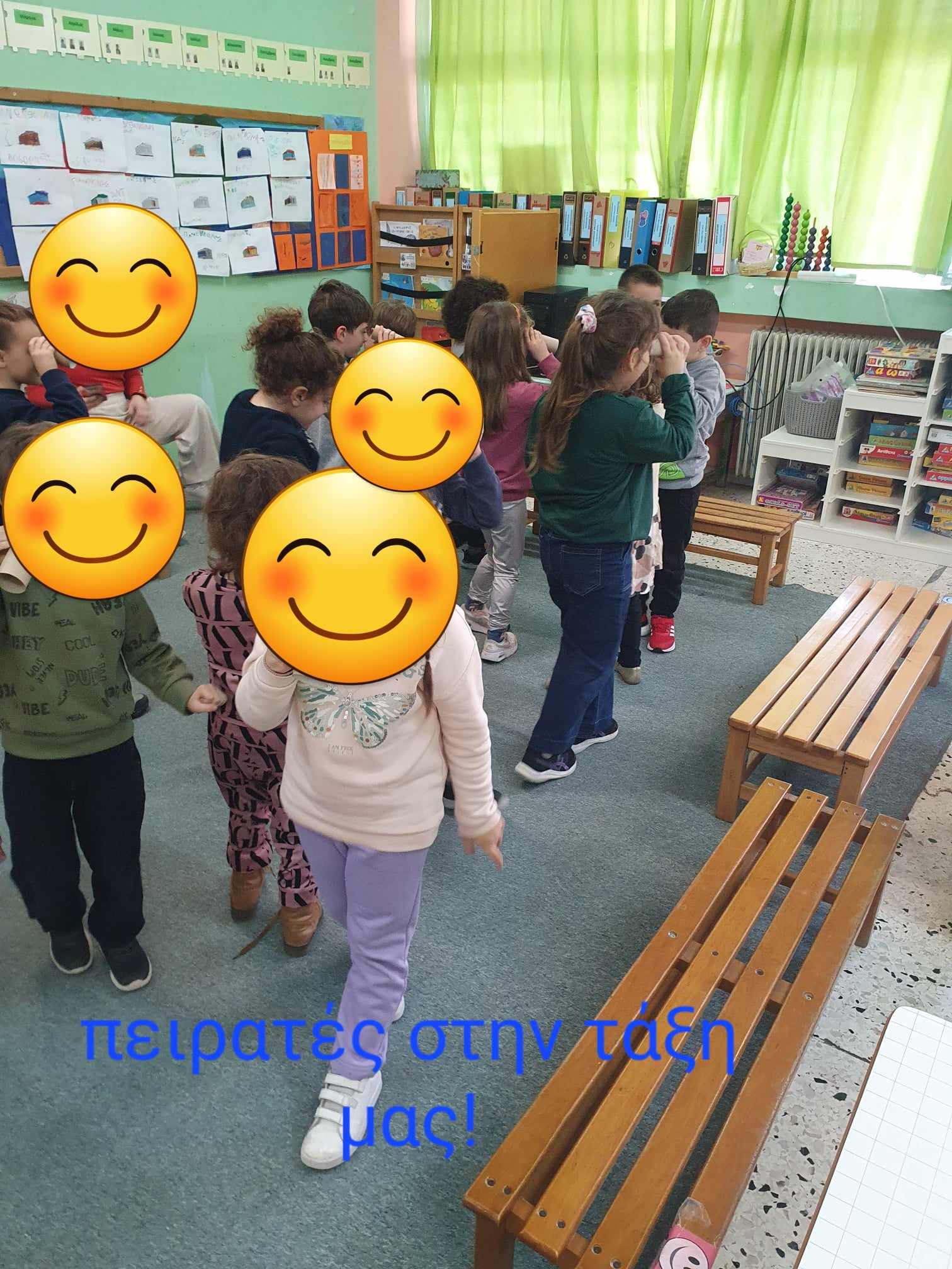 Ζωγραφίζουμε τι θα κάναμε αν είμαστε εμείς οι καλοί πειρατές !Ακούγοντας τραγούδια που μιλούν για πειρατές γινόμαστε πειρατές και ψάχνουμε να βρούμε τον κρυμμένο θησαυρό στην τάξη μας!