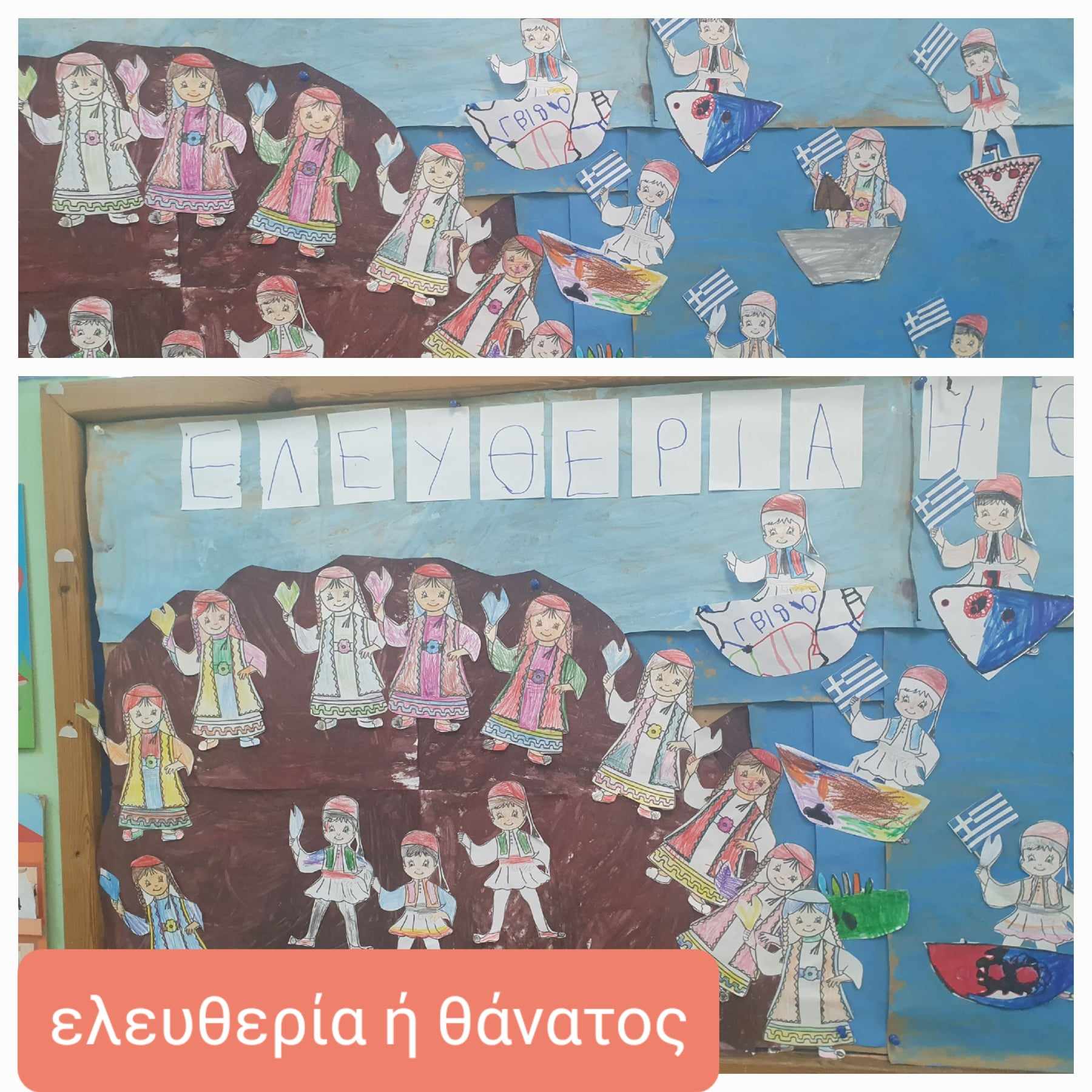Τα παιδιά συνεργάστηκαν για να φτιάξουν δύο ομαδικές αφίσες για την γιορτή της 25ης Μαρτίου. Επιπλέον κάθε παιδί έβαλε και την προσωπική του πινελιά.