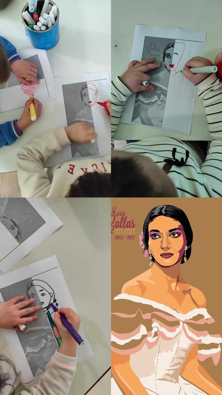 Με αφορμή την επίσκεψης, μιας φίλης μας απ’ την τάξη στο μουσείο της Μαρίας Κάλλας, αποφασίσαμε να γνωρίσουμε τη ζωή και το έργο της σπουδαίας υψιφώνου. Ακούσαμε αποσπάσματα από τις ερμηνείες της, συζητήσαμε για την προσφορά της στην όπερα και τα παιδιά δημιούργησαν τα δικά τους πορτρέτα, συμπληρώνοντας μισές εικόνες με τη φαντασία τους Η δραστηριότητα αυτή ήταν η αρχή για τη μελέτη και άλλων σπουδαίων γυναικών που άφησαν το δικό τους αποτύπωμα στην ιστορία.