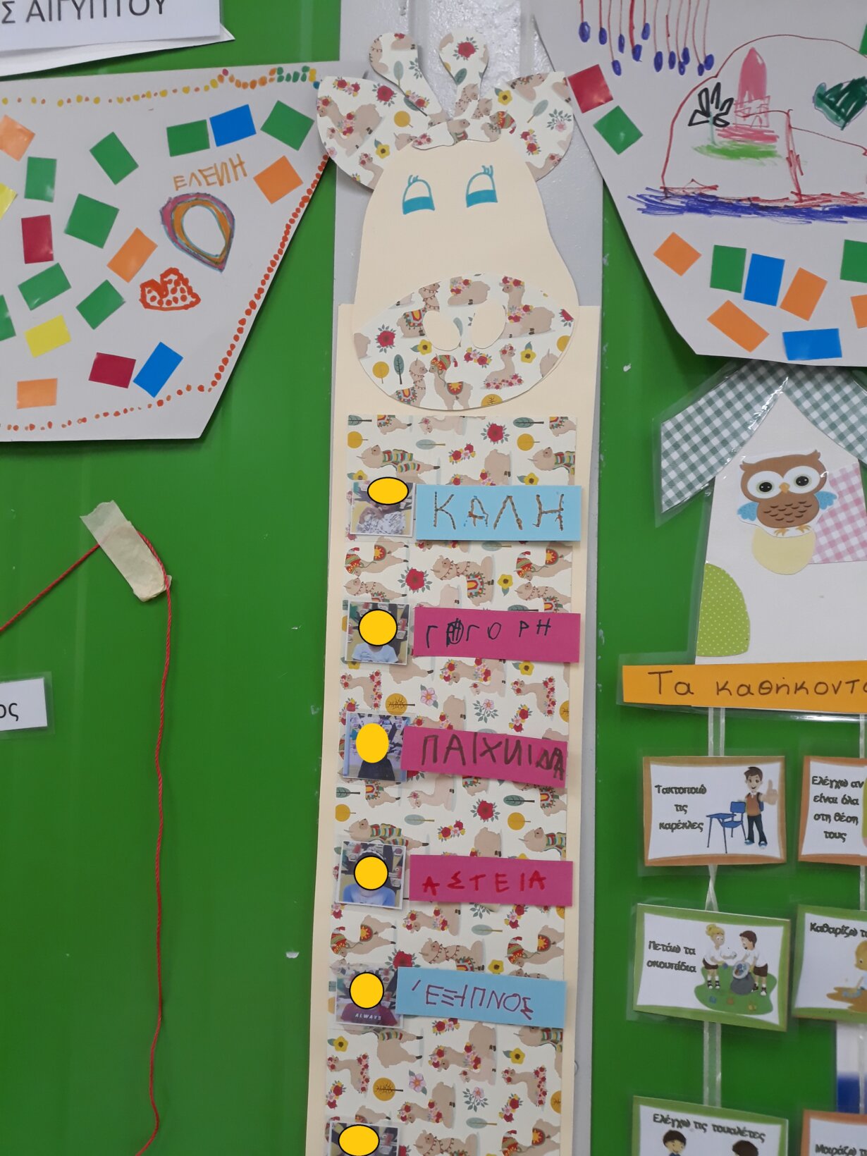 Φτιάξαμε την καμηλοπάρδαλη της τάξης μας…. στη συνέχεια το κάθε παιδί επέλεξε ένα παιδί από την ομάδα μας και το ονόμασε με ένα επίθετο. Συγκεντρώσαμε όλα τα επίθετα και τα τοποθετήσαμε στη καμηλοπάρδαλη δίπλα από κάθε παιδί!