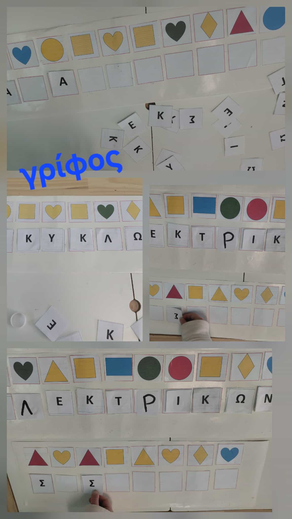 Τα παιδιά καλούνται να σπάσουν τον γρίφο και να διαβάσουν τι λέει. Οι γρίφοι , είναι από τα αγαπημένα τους παιχνίδια. Ενεργοποιούν τη σκέψη και τη φαντασία και μέσα από το παιχνίδι μαθαίνουν γράμματα και σχήματα . Τα παιδιά αντιστοιχίζουν γράμμα και σύμβολο και στη συνέχεια όταν κολλήσουν όλα τα γράμματα καλούνται άλλα παιδιά μόνα τους και άλλα με τη βοήθεια των νηπιαγωγών να διαβάσουν τι γράφει ο γρίφος.
