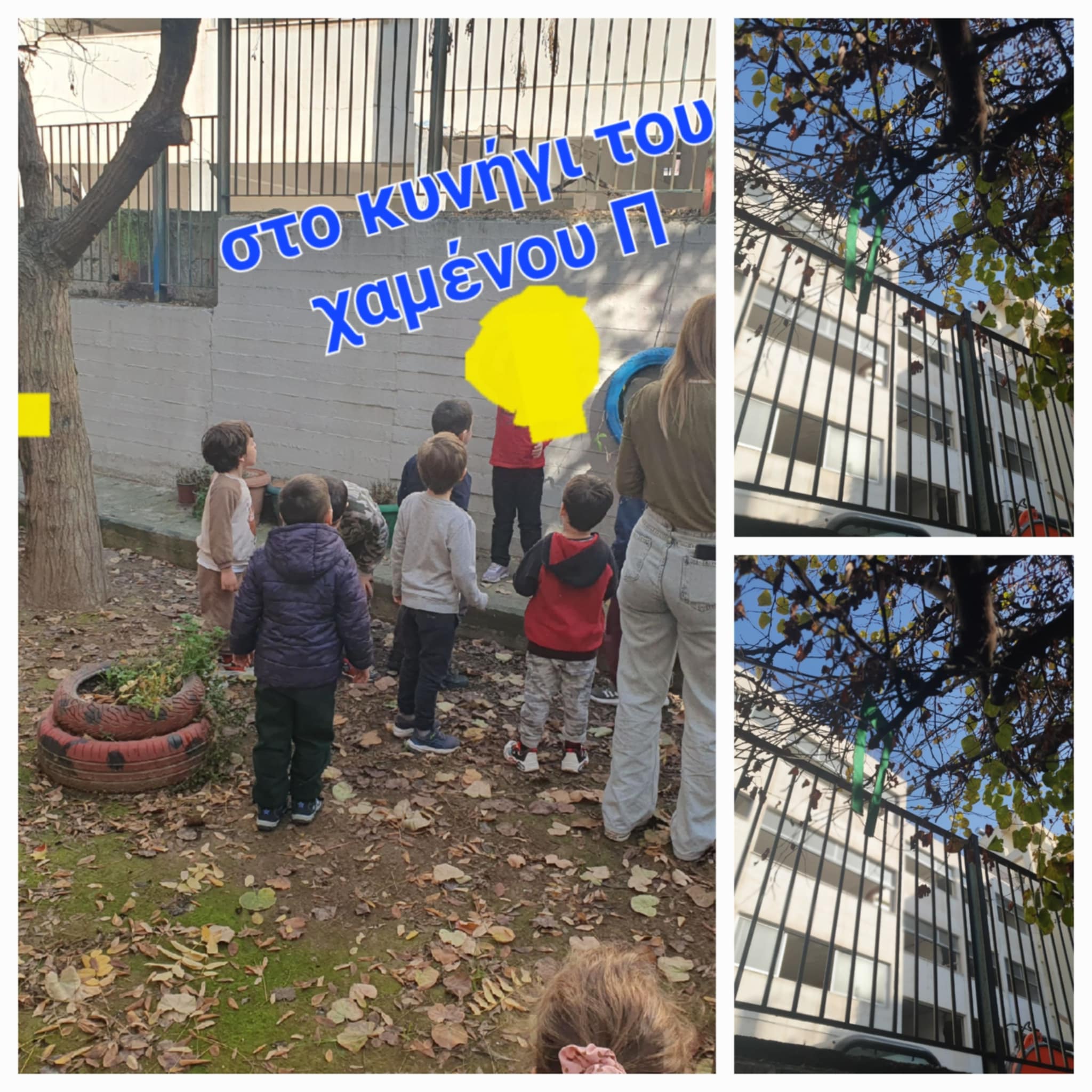 Το γράμμα “Π” είχε σκαρφαλώσει σε ένα δέντρο και δεν κατέβαινε. Για να πέσει, τα παιδιά έπρεπε να χρησιμοποιήσουν τις φεγγαρόπετρες – μπάλες από αλουμινόχαρτο που είχαν συγκεντρώσει – και να τις πετάξουν προς το δέντρο. Όλοι δοκίμασαν μέχρι που τελικά μια φεγγαρόπετρα βρήκε τον στόχο της και το “Π” έπεσε επιτέλους στο έδαφος!