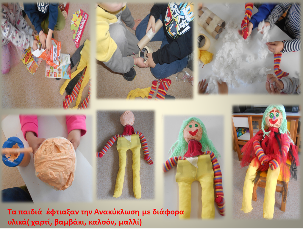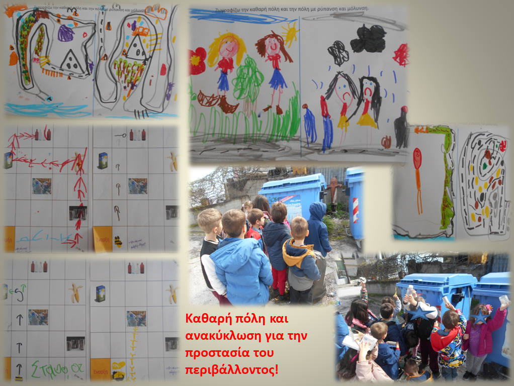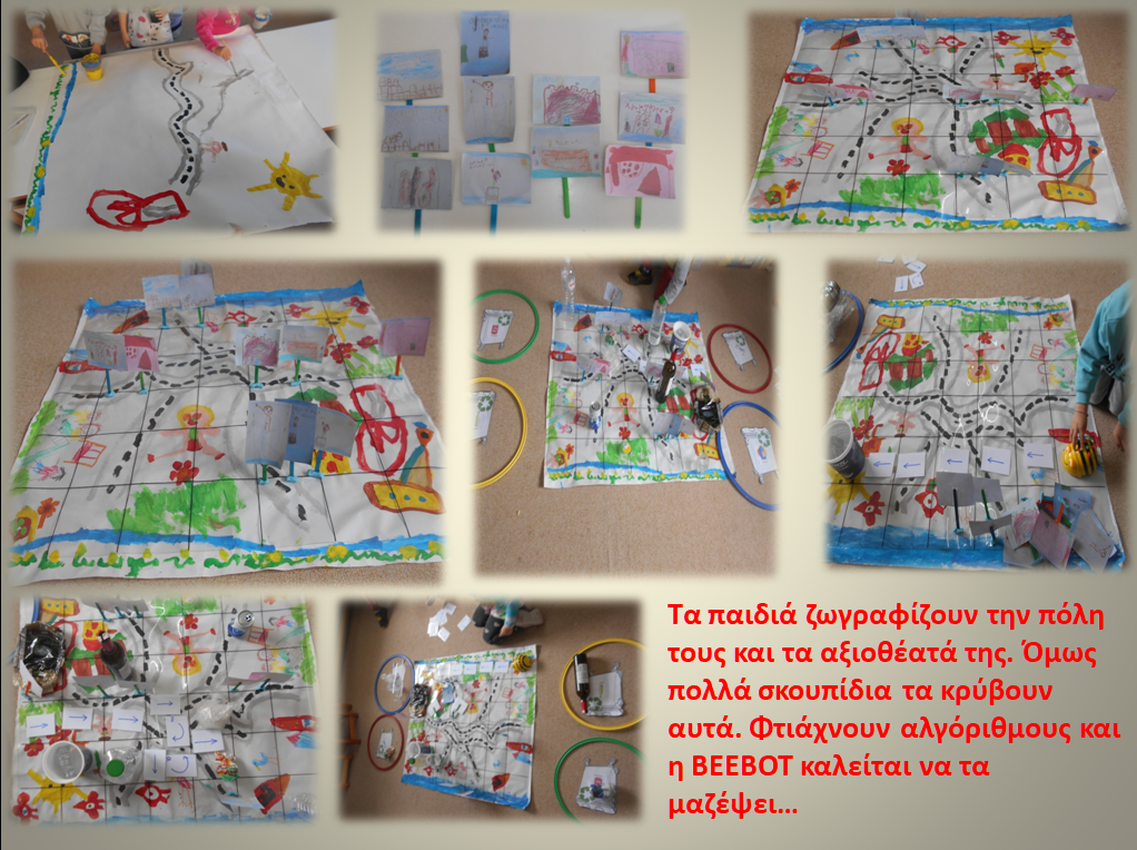 ΘΕΜΑΤΙΚΗ ΕΝΟΤΗΤΑ: ΔΗΜΙΟΥΡΓΩ ΚΑΙ ΚΑΙΝΟΤΟΜΩ –ΔΗΜΙΟΥΡΓΙΚΗ ΣΚΕΨΗ & ΠΡΩΤΟΒΟΥΛΙΑ- STEM/Εκπαιδευτική Ρομποτική. Το σενάριο αποτελεί μια διδακτική πρόταση, όπου μέσα από τα στάδια υλοποίησης, οι συμμετέχοντες μαθητές/τριες, παίρνουν μέρος σε διερευνητικές, ανακαλυπτικές, ομαδικές δραστηριότητες και επίλυσης προβλήματος. Ευχαριστούμε τον κ. Χρήστο Σκάρκο για τις πολύ όμορφες ιδέες. Διαχωρίσαμε κι ομαδοποιήσαμε, ως προς το υλικό ανακυκλώσιμα υλικά. Τα παιδιά ζωγράφισαν την πόλη τους και τα αξιοθέατά της. Όμως τα σκουπίδια κρύβουν την όμορφη θέα τους. Η BEEBOT μέσω αλγόριθμων που φτιάχνουν τα παιδιά πρέπει να μαζέψει όλα τα σκουπίδια και να τοποθετηθούν στον σωστό κάδο ανακύκλωσης. Επίσης φτιάξαμε το δικό μας ανακυκλωμένο χαρτί. Ακόμη τα παιδιά δημιούργησαν με ανακυκλώσιμα υλικά μία κούκλα που την ονόμασαν “Ανακύκλωση”. Με αυτήν, πήραν μέρος στον 12ο Διεθνή Μαθητικό Διαγωνισμό: “Δημιουργώντας τα δικά μας παιχνίδια: Από το χθες στο σήμερα”, που διοργάνωσε το Μουσείο Σχολικής Ζωής και Εκπαίδευσης του Εθνικού Κέντρου Έρευνας και Διάσωσης Σχολικού Υλικού (ΕΚΕΔΙΣΥ) και το Τμήμα Εκπαιδευτικής Ραδιοτηλεόρασης και Ψηφιακών Μέσων του Υπουργείου Παιδείας, Θρησκευμάτων και Αθλητισμού. Η δράση αυτή περιλαμβάνεται επίσης,στο σχέδιο δράσης: ” Χέρι, χέρι προχωράμε… παίζουμε, γελάμε, αγαπάμε”