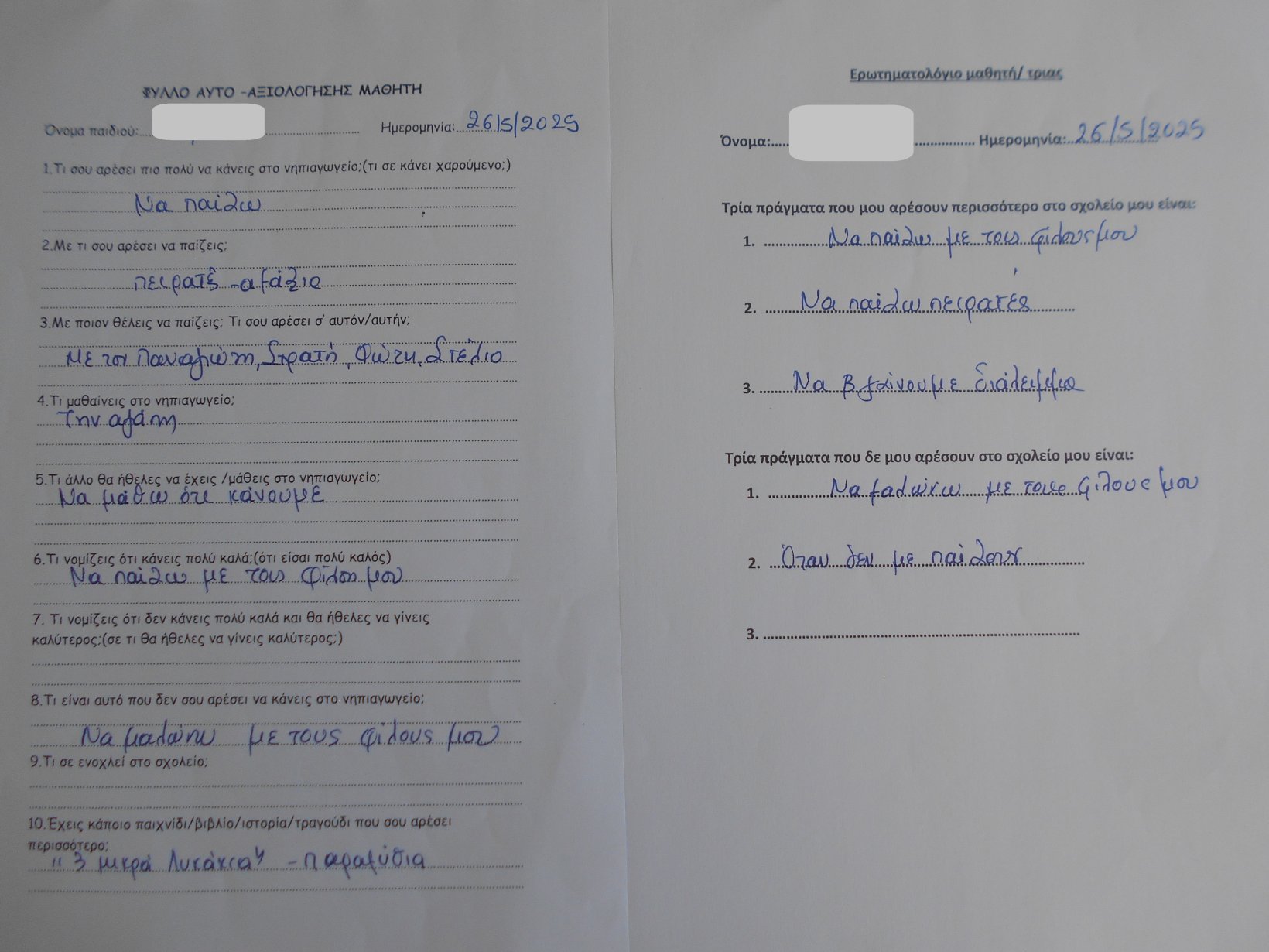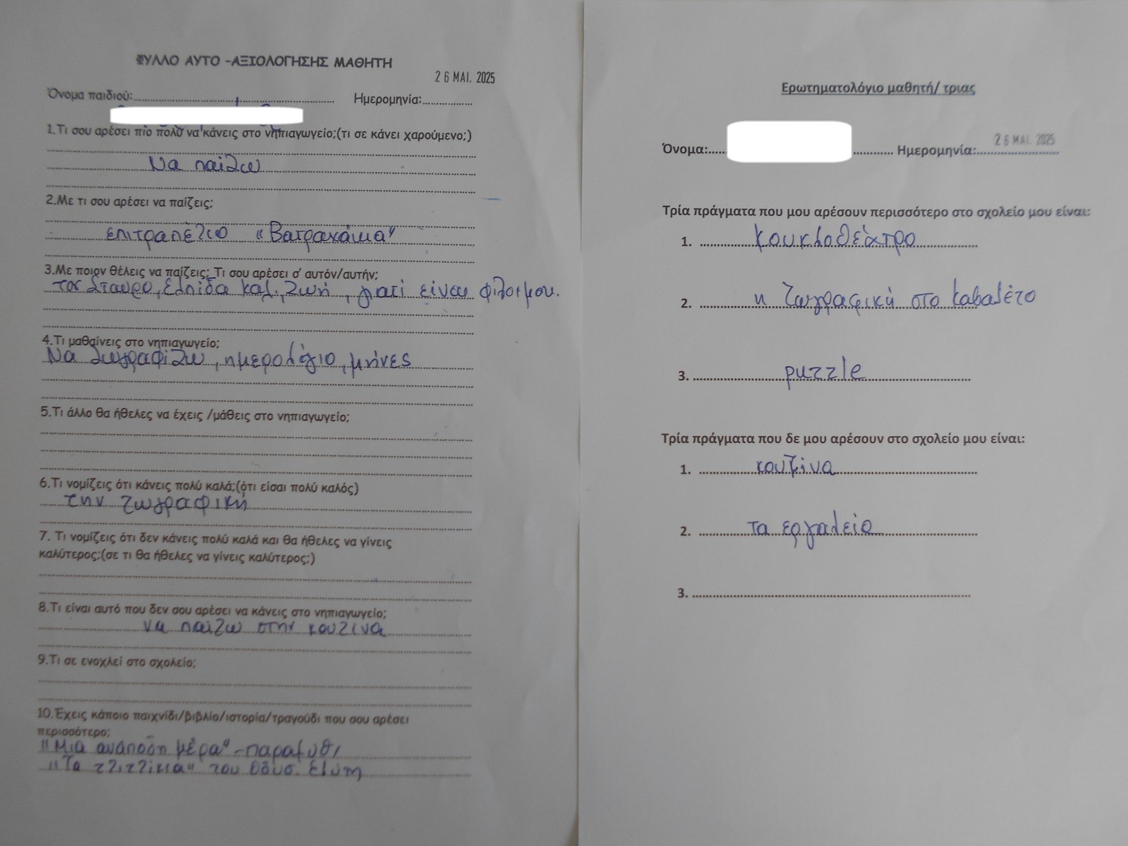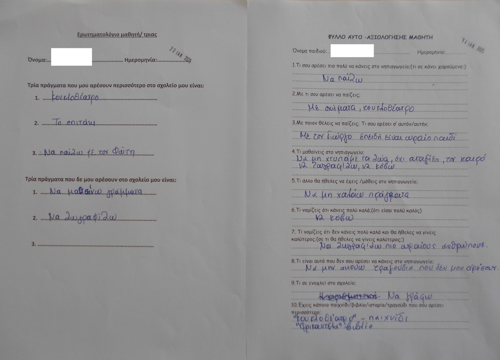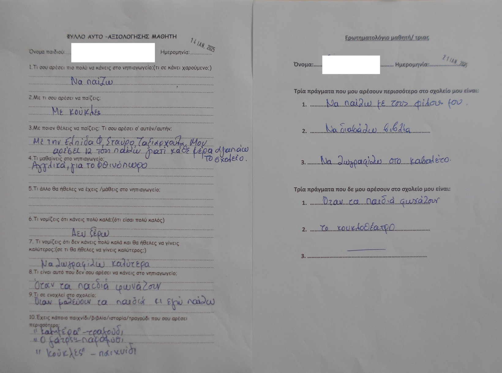 - Τα παιδιά απάντησαν σε ερωτηματολόγιο: «Τρία πράγματα που τους αρέσουν στο νηπιαγωγείο και τρία πράγματα που δεν τους αρέσουν».
