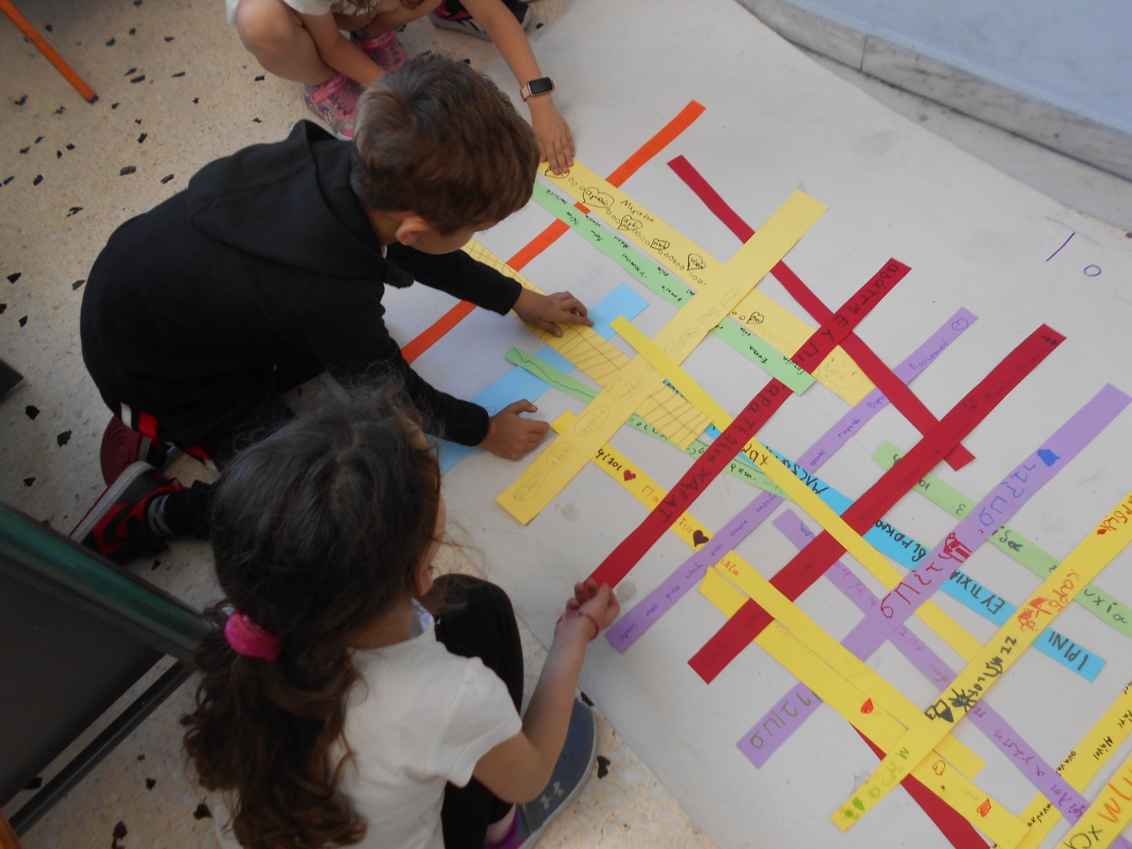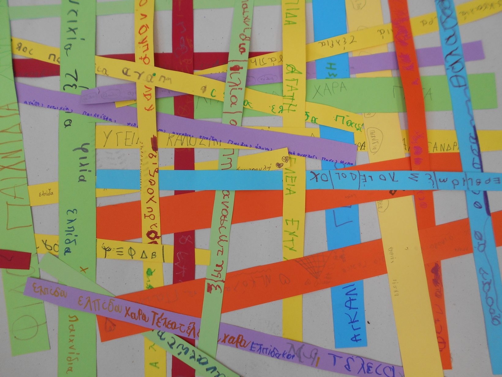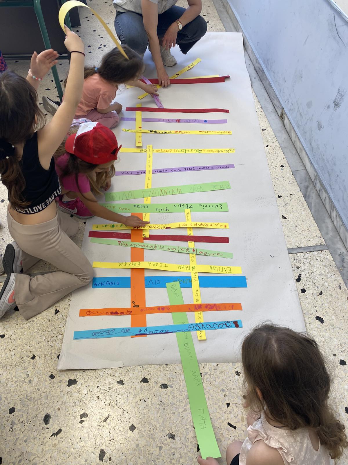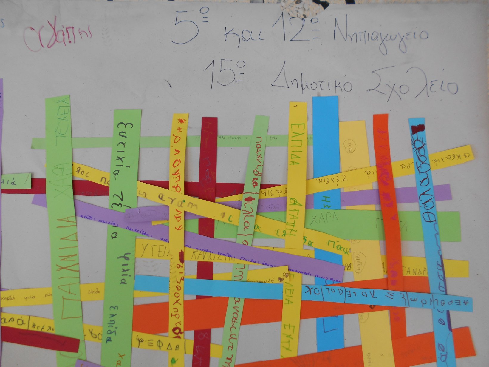 Όλοι μαζί 5ο και 12ο Νηπιαγωγείο, μεταβήκαμε στο 15ο δημοτικό Σχολείο για το πρόγραμμα: “Ομαλή μετάβαση από το νηπιαγωγείο στο Δημοτικό Σχολείο”. Είχαμε συνεννοηθεί, με την δασκάλα της Α΄ Δημοτικού κι αφού αφηγηθήκαμε το παραμύθι, όλα τα παιδιά αντέγραψαν λέξεις της Φιλίας σε κάνσον λωρίδες, με σκοπό να πλέξουμε ‘Το υφαντό της Αγάπης’. Ήταν μα πολύ όμορφη συνεργασία και των τριών σχολείων!!!!