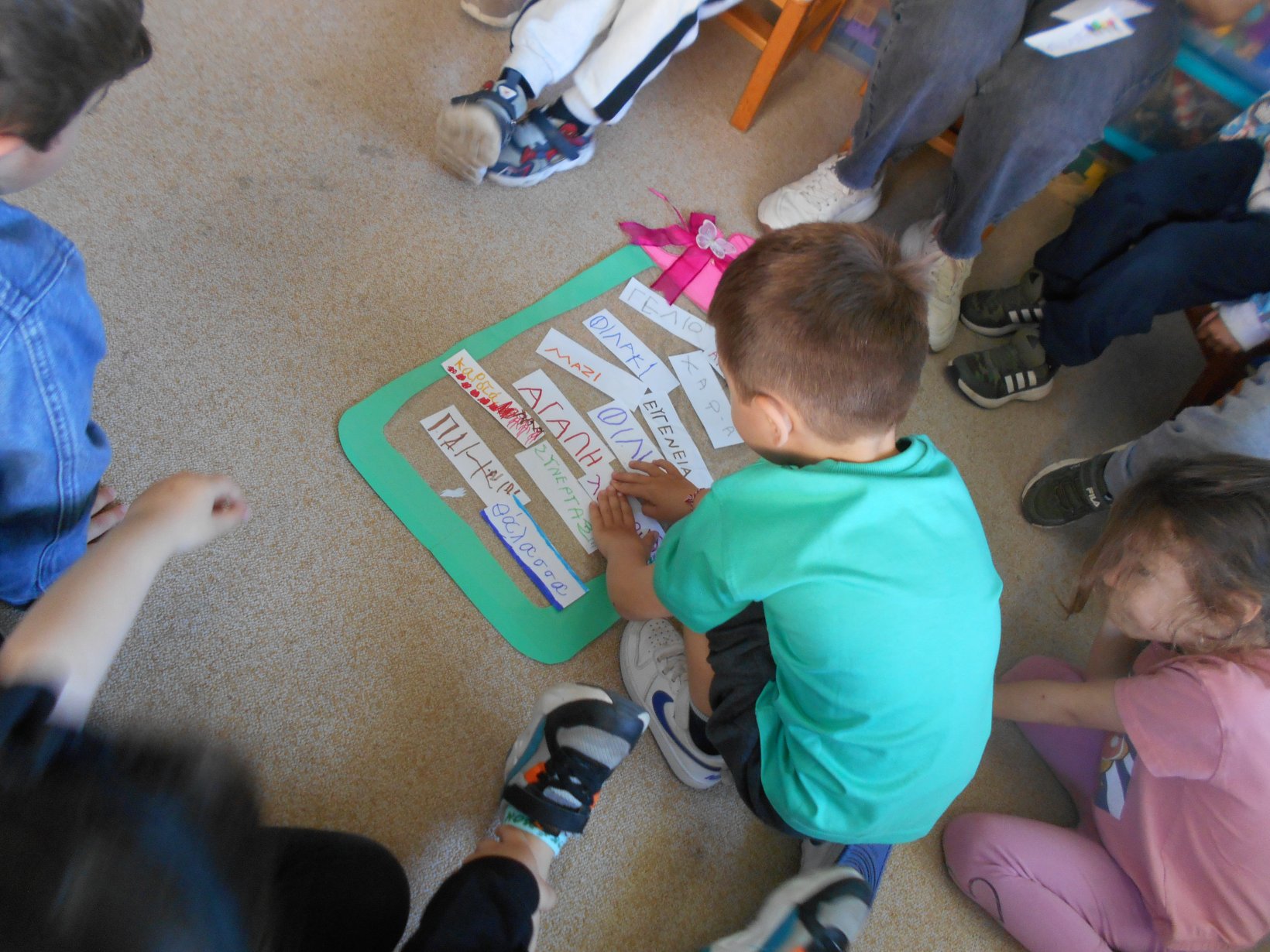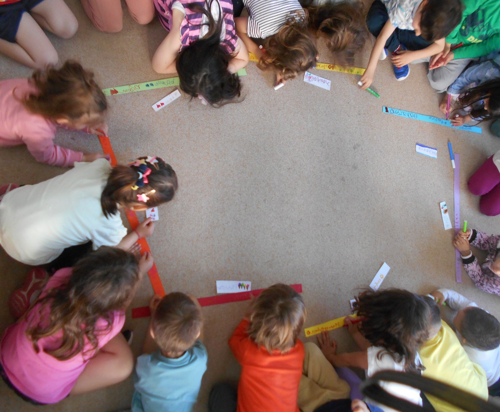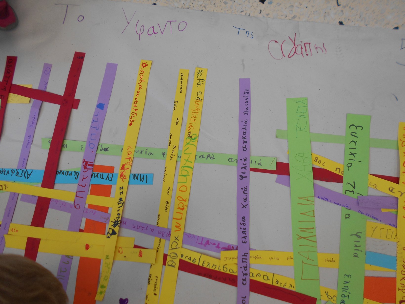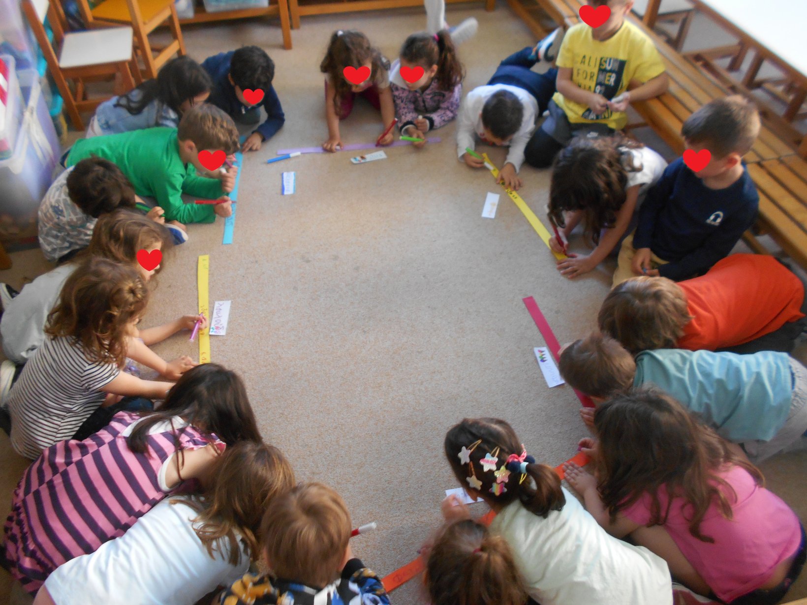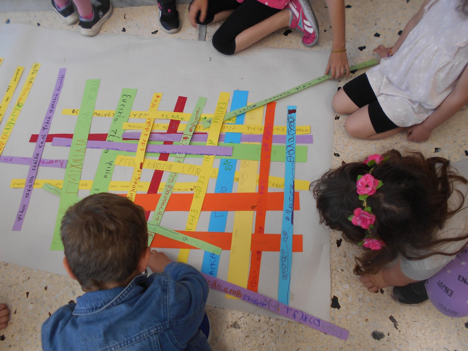 Όλοι μαζί 5ο και 12ο Νηπιαγωγείο, μεταβήκαμε στο 15ο δημοτικό Σχολείο για το πρόγραμμα: “Ομαλή μετάβαση από το νηπιαγωγείο στο Δημοτικό Σχολείο”. Είχαμε συνεννοηθεί, με την δασκάλα της Α΄ Δημοτικού κι αφού αφηγηθήκαμε το παραμύθι, όλα τα παιδιά αντέγραψαν λέξεις της Φιλίας σε κάνσον λωρίδες, με σκοπό να πλέξουμε ‘Το υφαντό της Αγάπης’. Ήταν μα πολύ όμορφη συνεργασία και των τριών σχολείων!!!!