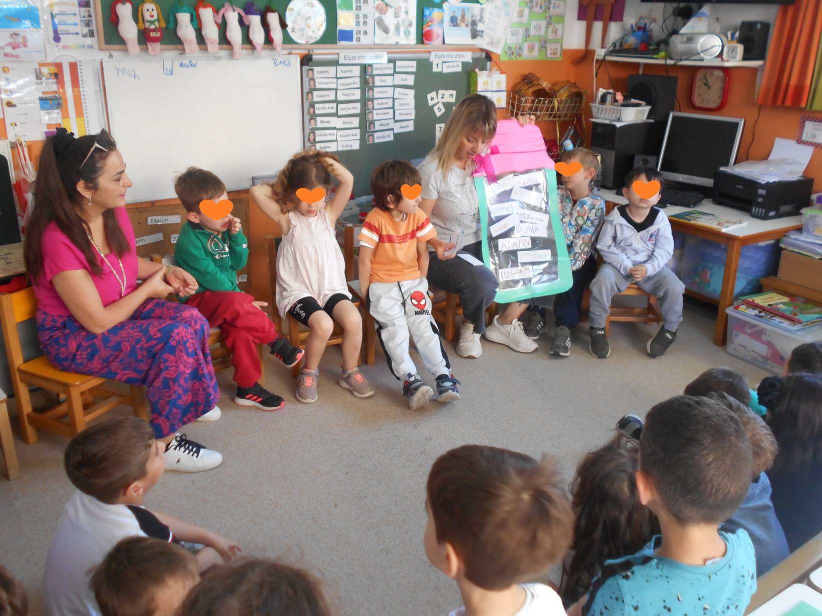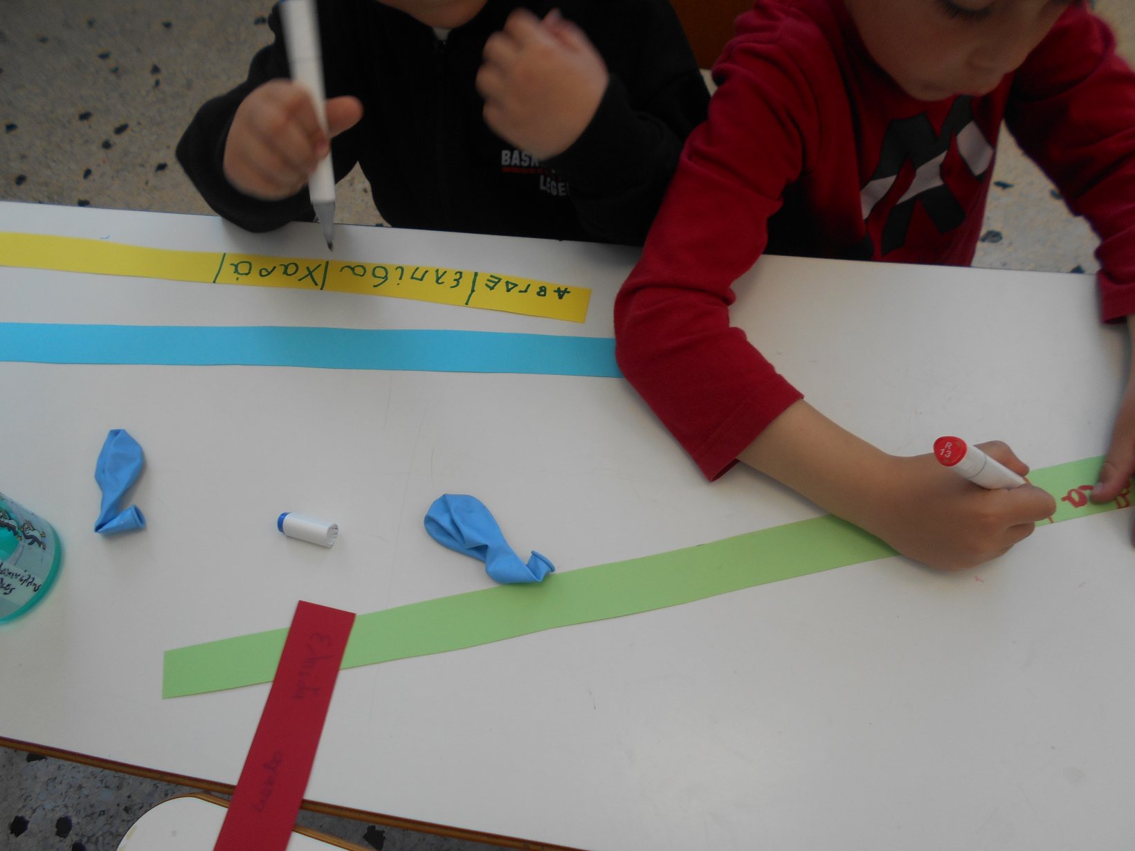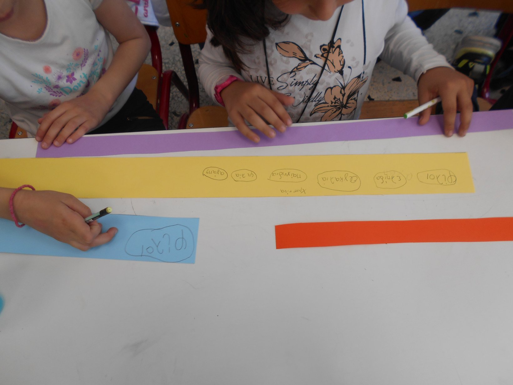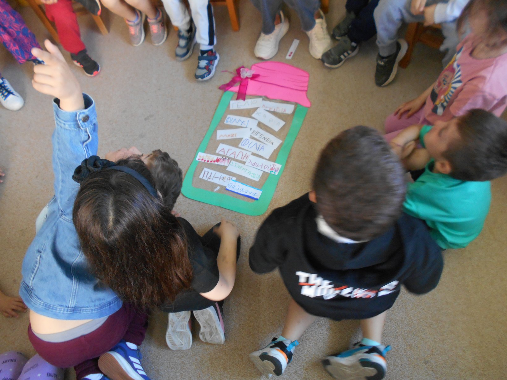 Όλοι μαζί 5ο και 12ο Νηπιαγωγείο, μεταβήκαμε στο 15ο δημοτικό Σχολείο για το πρόγραμμα: “Ομαλή μετάβαση από το νηπιαγωγείο στο Δημοτικό Σχολείο”. Είχαμε συνεννοηθεί, με την δασκάλα της Α΄ Δημοτικού κι αφού αφηγηθήκαμε το παραμύθι, όλα τα παιδιά αντέγραψαν λέξεις της Φιλίας σε κάνσον λωρίδες, με σκοπό να πλέξουμε ‘Το υφαντό της Αγάπης’. Ήταν μα πολύ όμορφη συνεργασία και των τριών σχολείων!!!!
