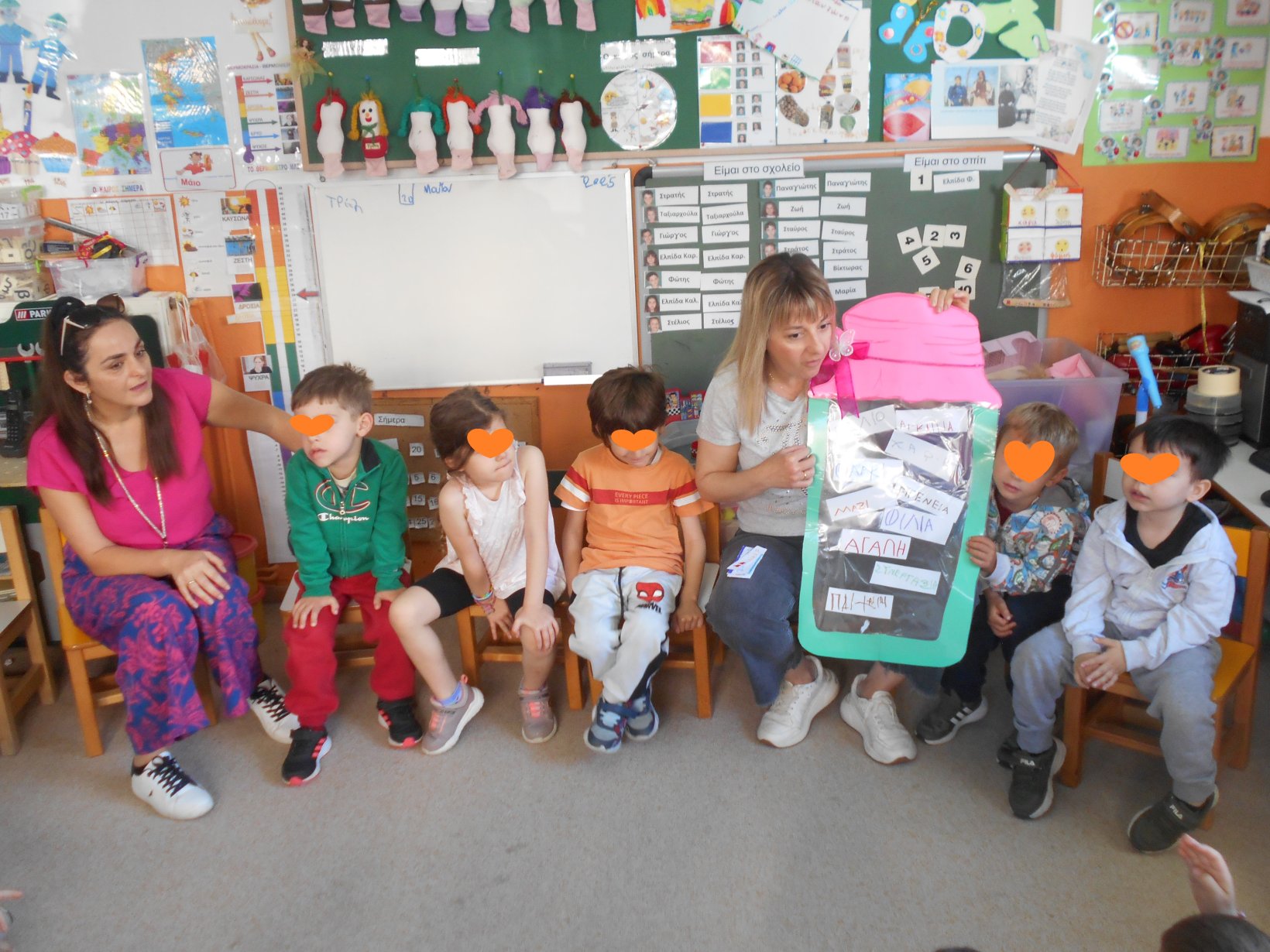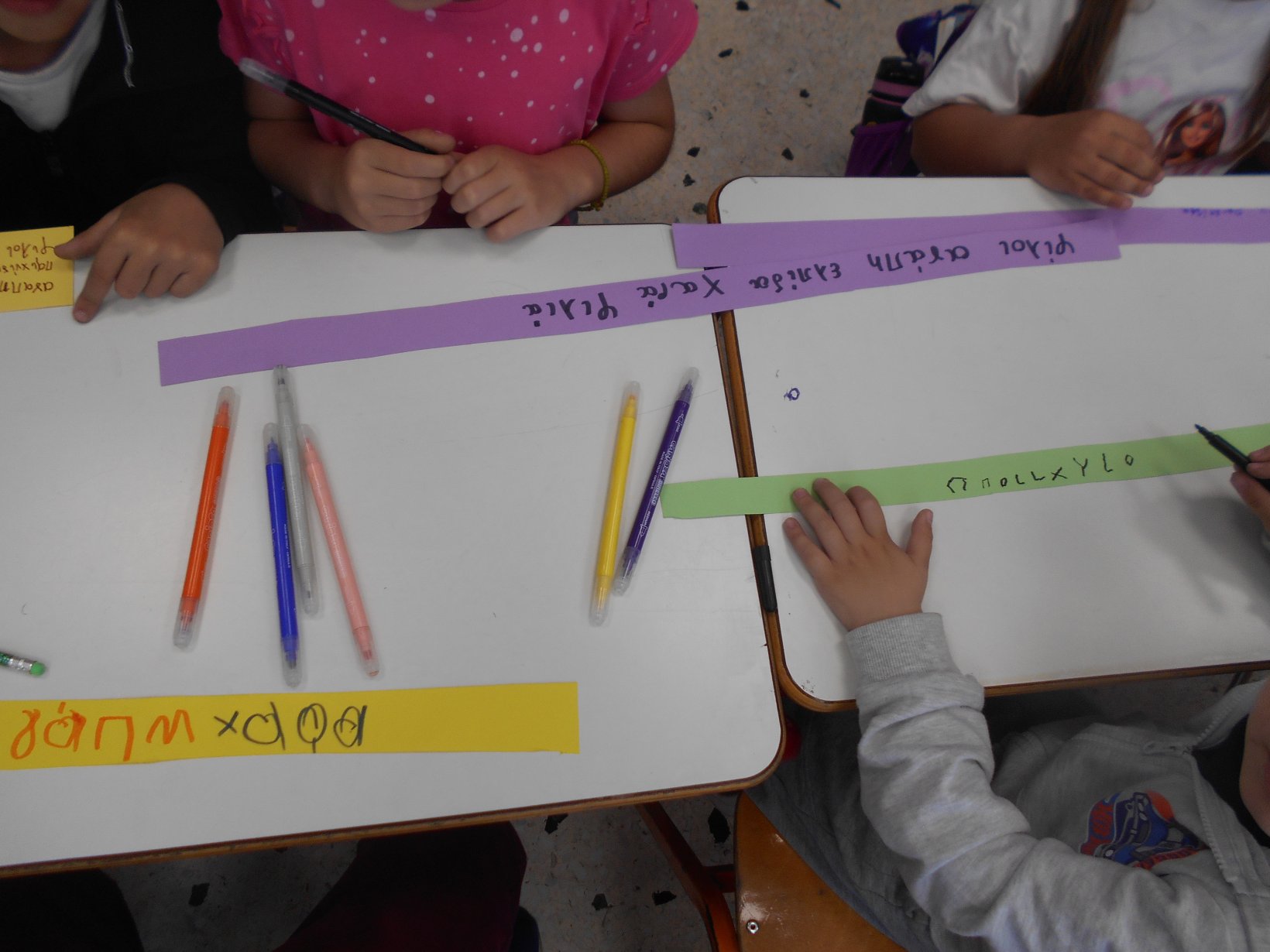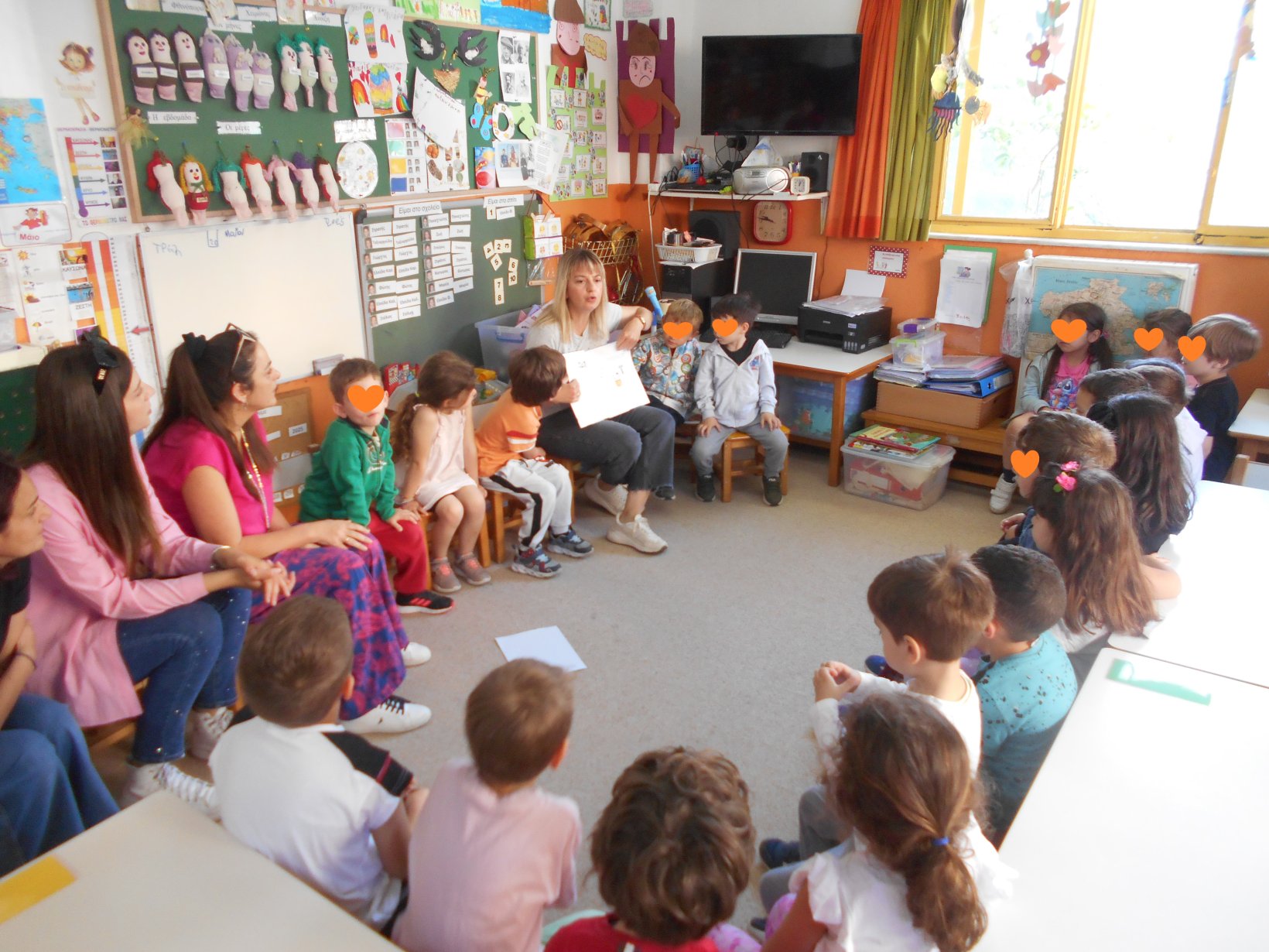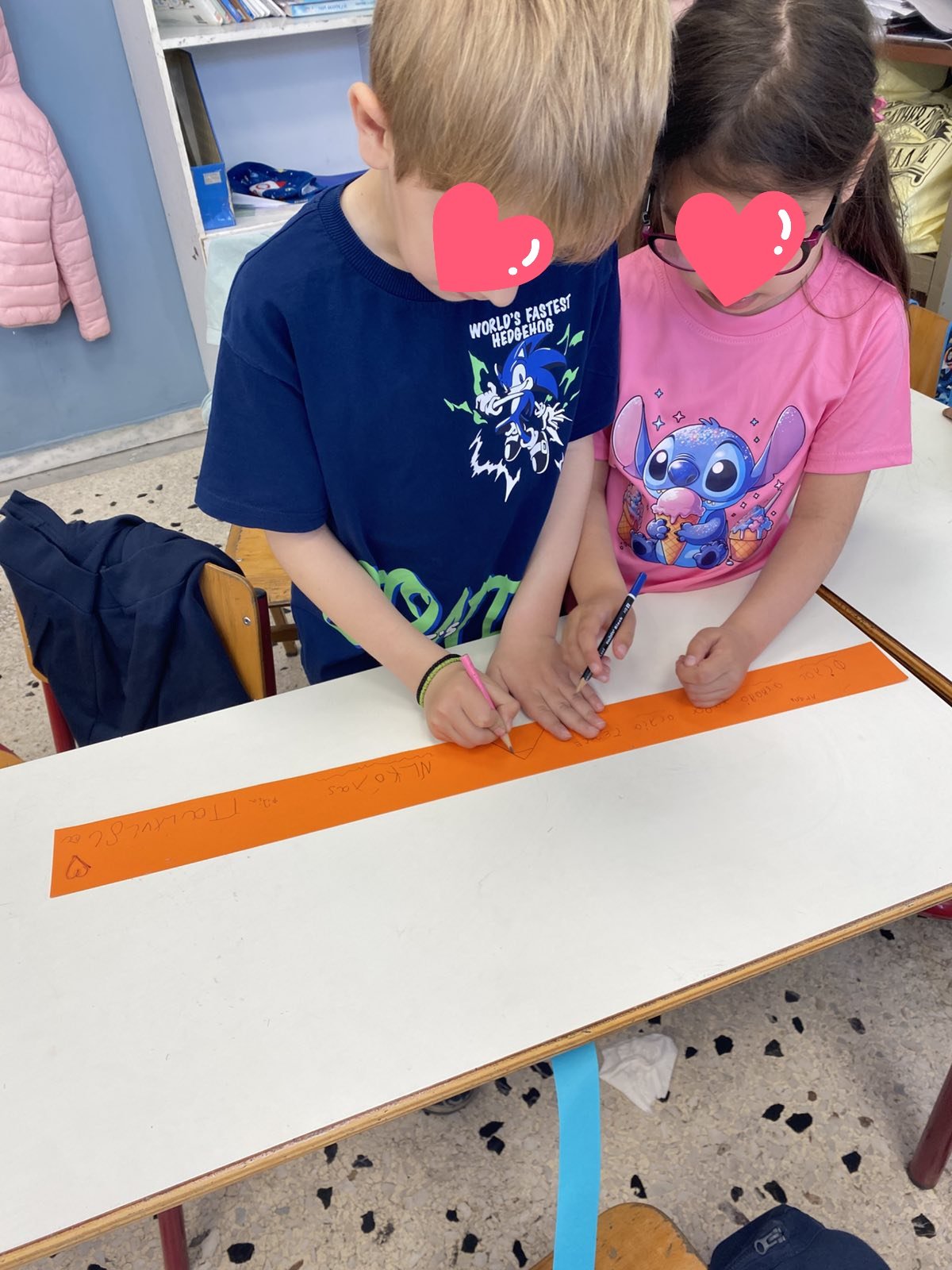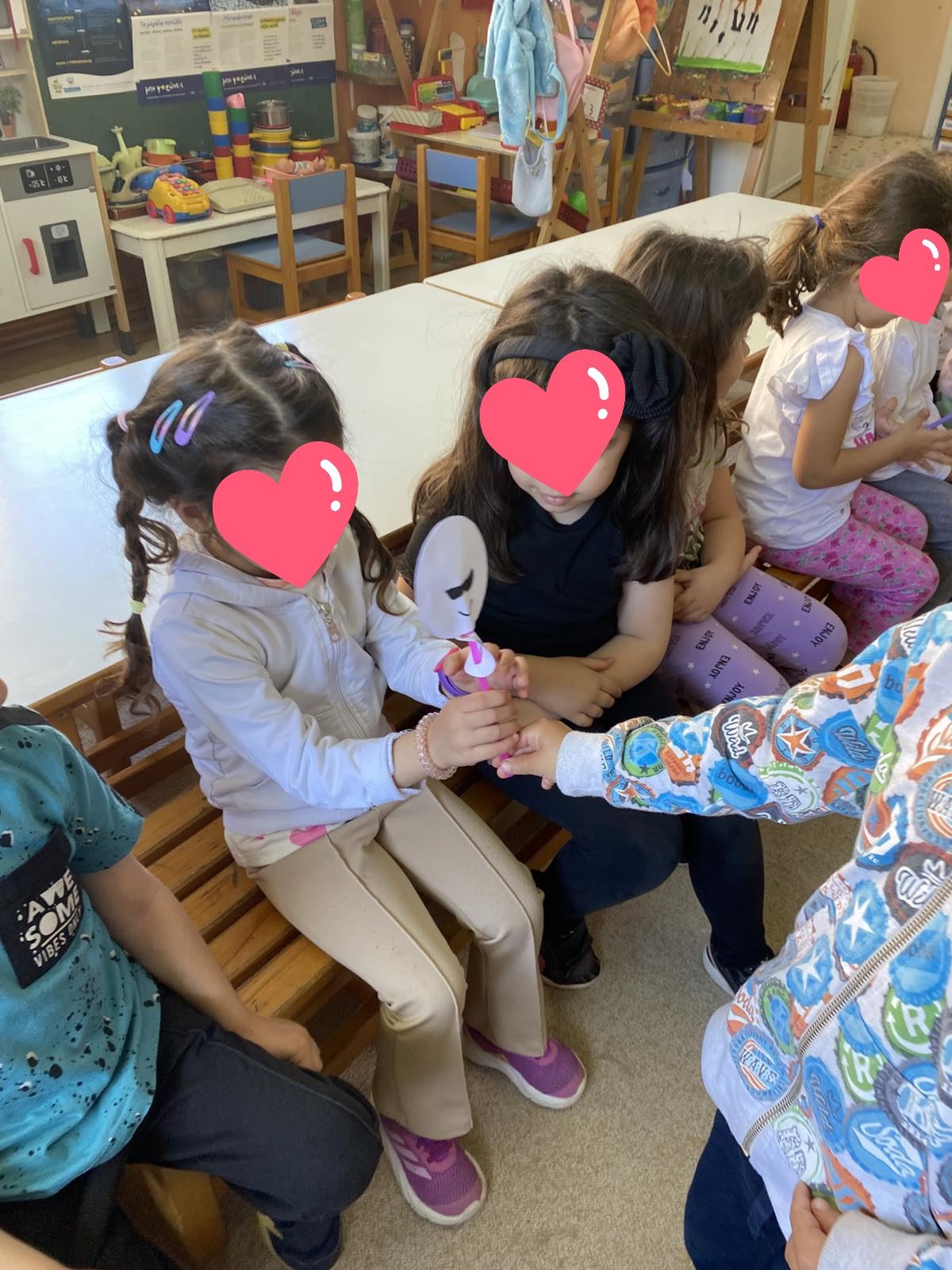 Όλοι μαζί 5ο και 12ο Νηπιαγωγείο, μεταβήκαμε στο 15ο δημοτικό Σχολείο για το πρόγραμμα: “Ομαλή μετάβαση από το νηπιαγωγείο στο Δημοτικό Σχολείο”. Είχαμε συνεννοηθεί, με την δασκάλα της Α΄ Δημοτικού κι αφού αφηγηθήκαμε το παραμύθι, όλα τα παιδιά αντέγραψαν λέξεις της Φιλίας σε κάνσον λωρίδες, με σκοπό να πλέξουμε ‘Το υφαντό της Αγάπης’. Ήταν μα πολύ όμορφη συνεργασία και των τριών σχολείων!!!!