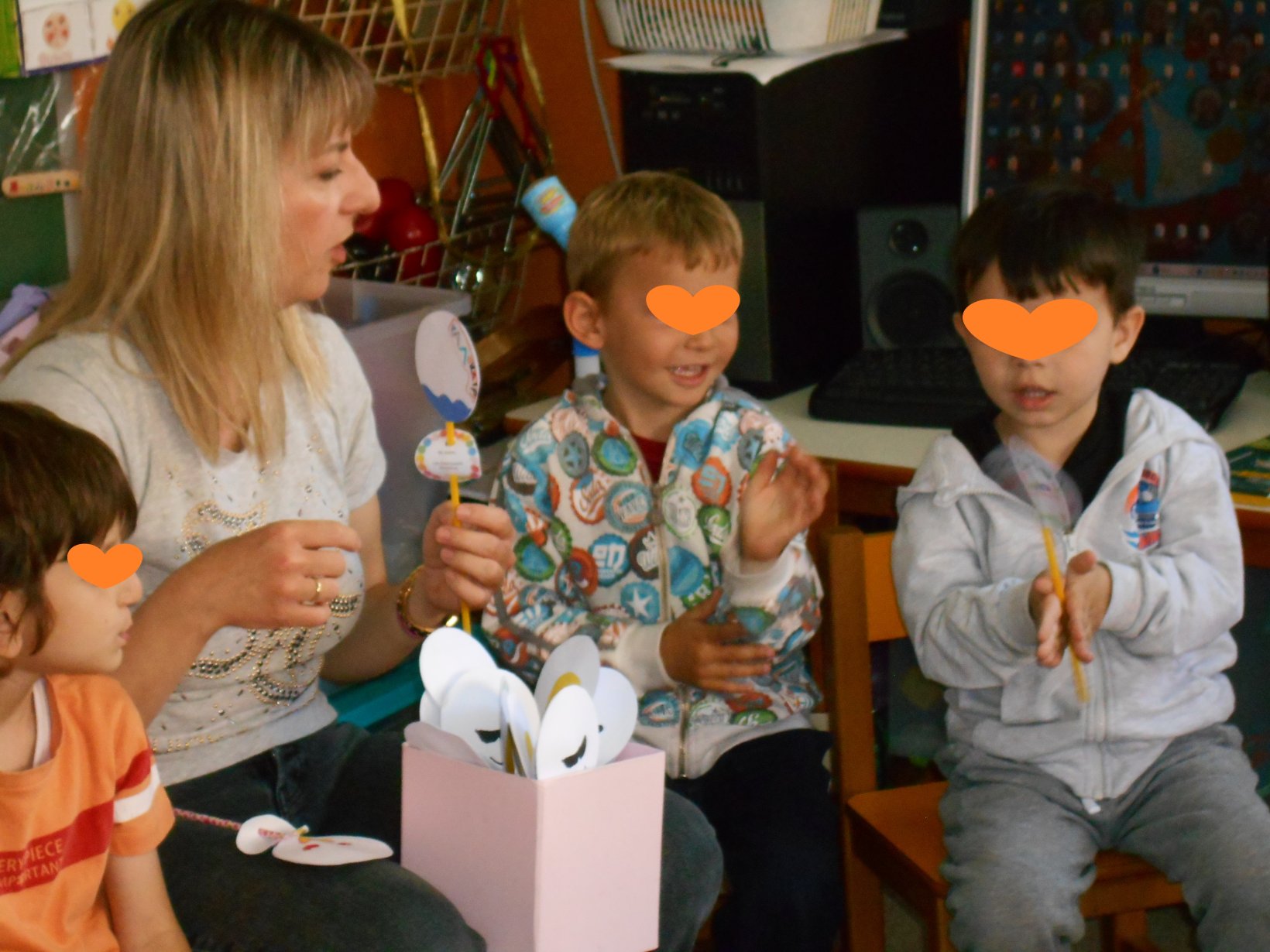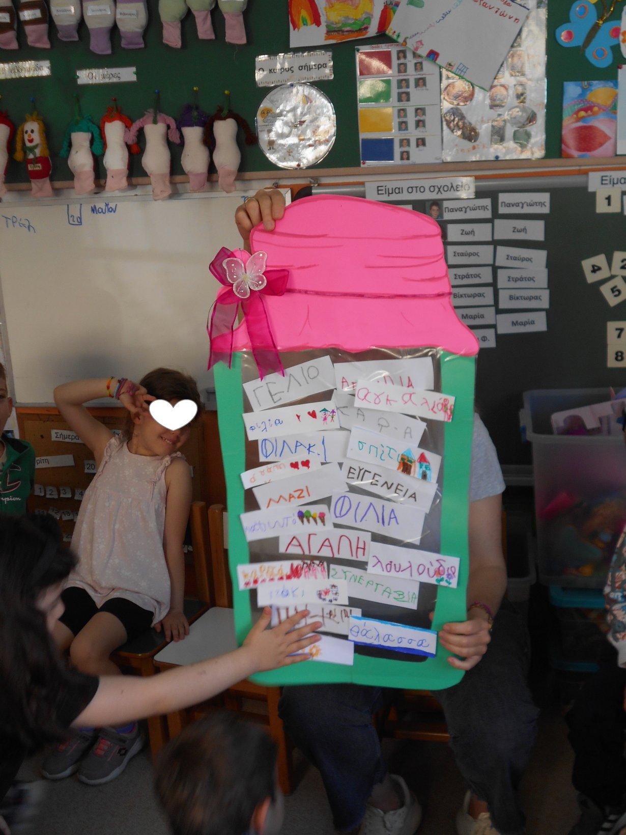 Στα πλαίσια των Κοινοτήτων Μάθησης αποφασίσαμε με το 12ο Νηπιαγωγείο (Αλυφαντά),να κάνουμε από κοινού μια δράση εν αναμονή της επισκέψεώς τους στο δικό μας νηπιαγωγείο, 20 Μαΐου. Επιλέξαμε το βιβλίο ” Ο ραφτάκος των λέξεων” του Αντώνη Παπαθεοδούλου – Εκδ. Μεταίχμιο. Το διαβάσαμε και κάθε νηπιαγωγείο έφτιαξε, καρτέλες με λέξεις της φιλίας . Στην συνάντησή μας , όλα τα παιδιά έπαιξαν ένα ομαδικό παιχνίδι στην αυλή και γνωριστήκαμε. Μετά στην τάξη, ενώσαμε τις λέξεις της αγάπης , στο πολύ όμορφο “βάζο” που μας έφεραν τα παιδιά, του 12ου Νηπιαγωγείου. Τα παιδιά αντάλλαξαν δώρα μεταξύ τους .