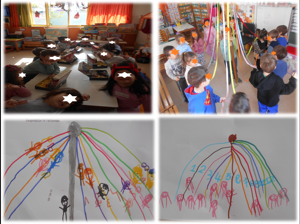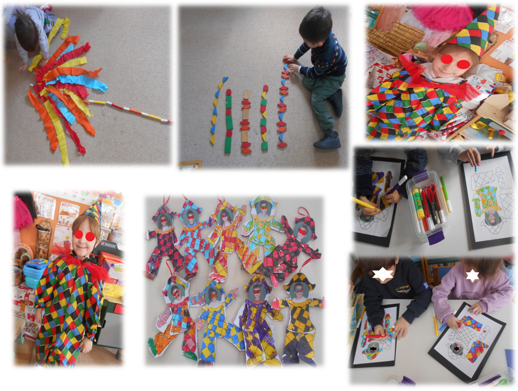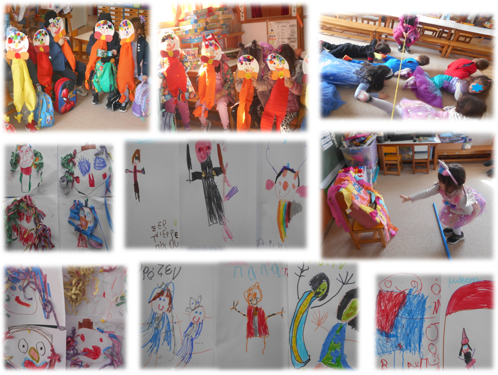 Καλώς το καρναβάλι με τους τρελούς χορούς… είναι για τα παιδάκια η πιο τρελλή γιορτή..!!  Σήμερα τα παιδιά έμαθαν για το έθιμο της Τσικνοπέμπτης και το δραματοποίησαν . Κλόουν και σερπαντίνες έχουν την τιμητική τους!!! Χορέψαμε το γαϊτανάκι, τα παιδιά το σχηματοποίησαν κάνοντας μοτίβα και το ζωγράφισαν αντιστοιχίζοντας σε κάθε κορδέλα έναν αριθμό. Η στολή του Αρλεκίνου έχει μοτίβα. Μεγάλοι ζωγράφοι όπως ο Picasso φιλοτέχνησαν αρλεκίνους. Τα παιδιά ζωγραφίζουν τον εαυτό τους, σαν Αρλεκίνο, κάνοντας μοτίβα. Χαρταετοί στην Τέχνη. Γνωρίσαμε πίνακες ζωγραφικής : της Renie Britenbuncer και του Simon Taylor. Τα παιδιά ζωγράφισαν  συναισθήματα και σκέψεις! Ζωγραφίζουν την αποκριάτικη στολή τους. Ο Σύλλογος Γονέων και Κηδεμόνων μας πρόσφερε τα τσικνίσματα. Στο Αποκριάτικο πάρτι  παίξαμε παιχνίδια στόχων κι άλλα ομαδικά.!!! Οι δράσεις περιλαμβάνονται στο Σχέδιο Δράσης: ” Χέρι, χέρι προχωράμε… παίζουμε, γελάμε, τραγουδάμε”
