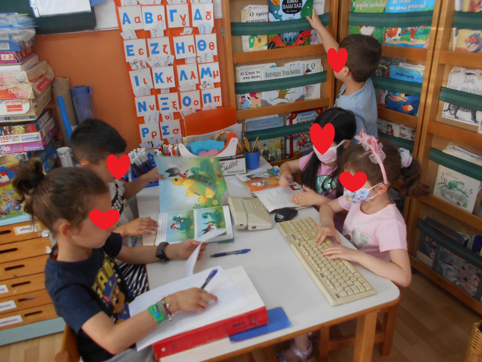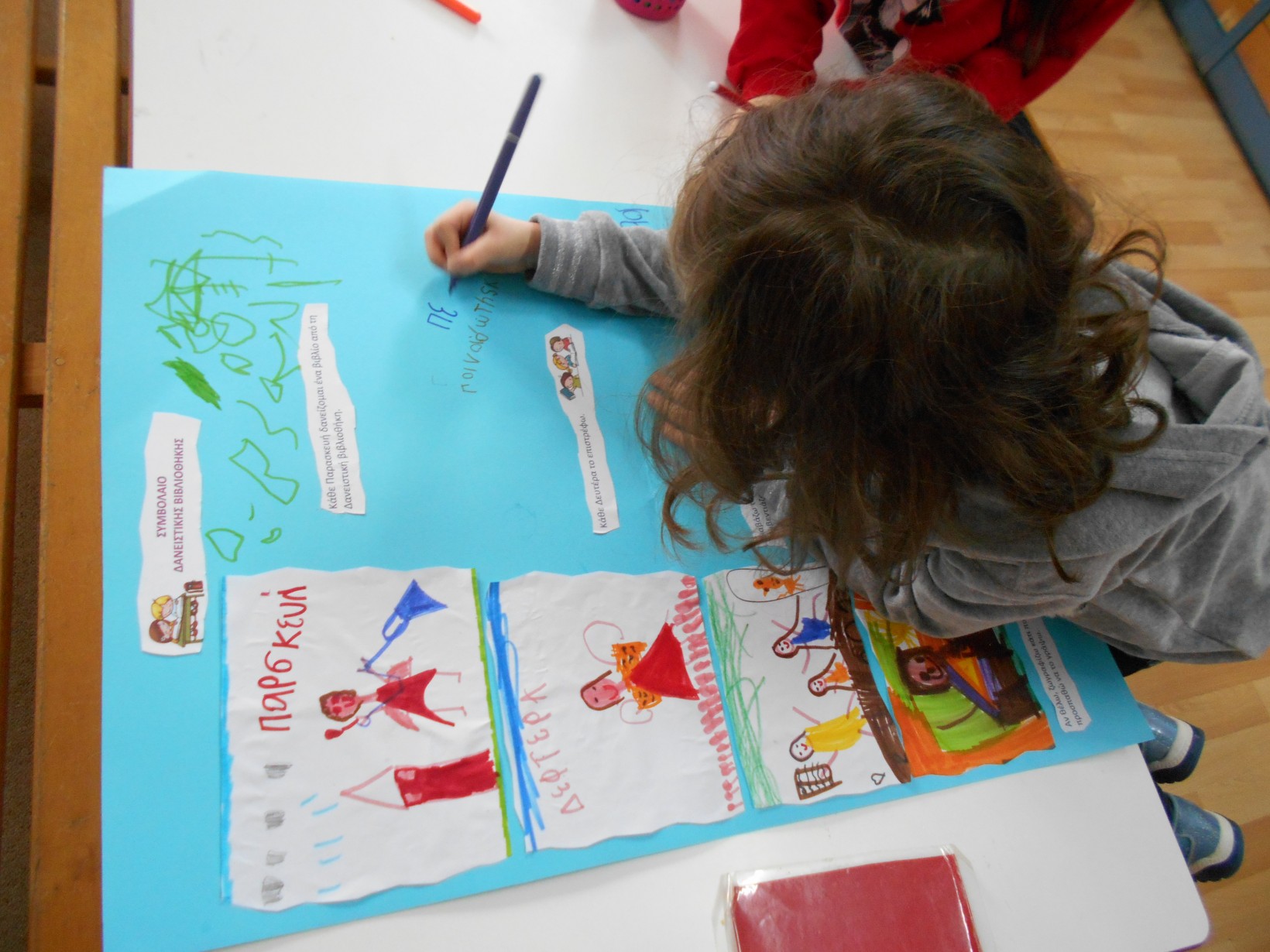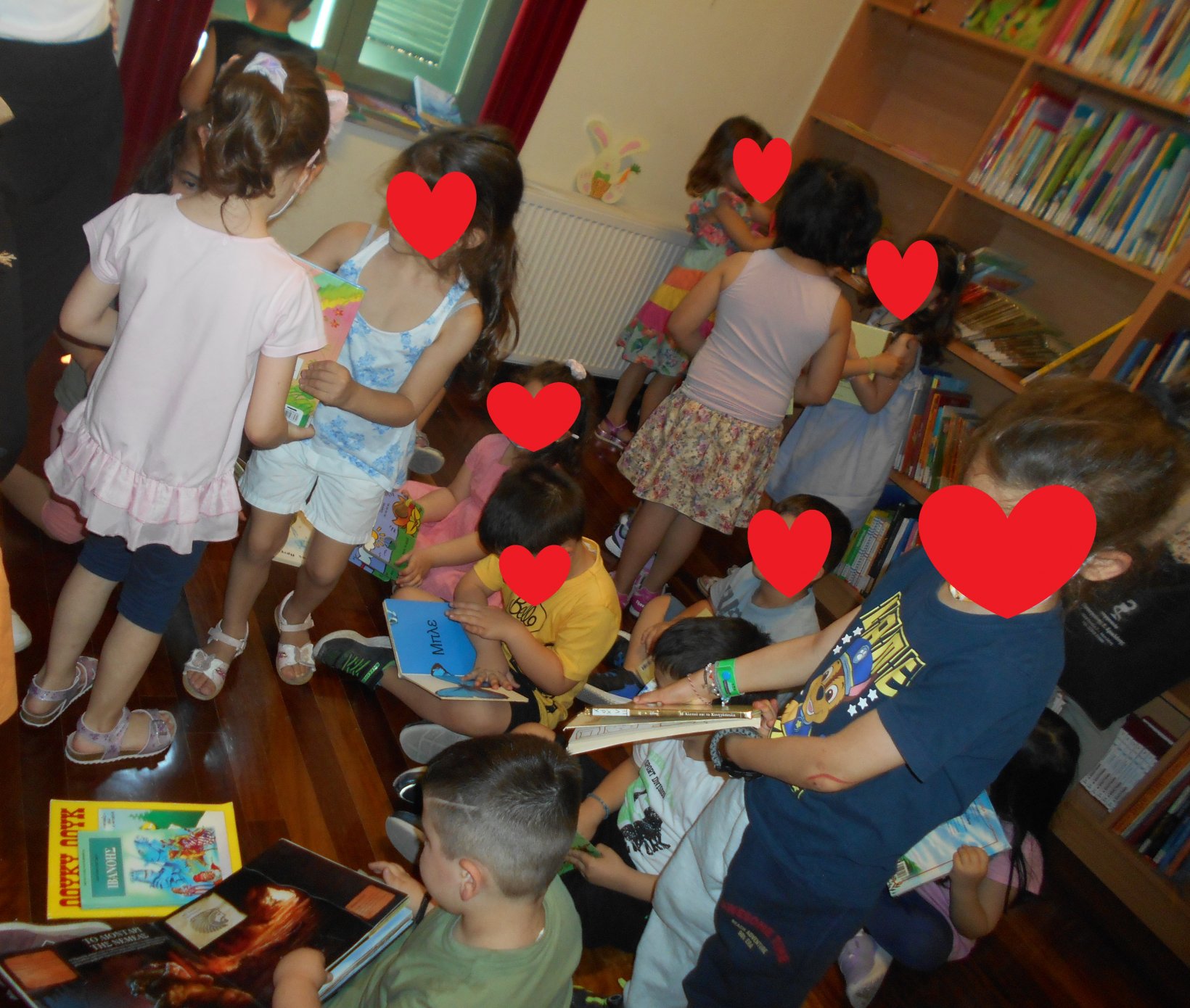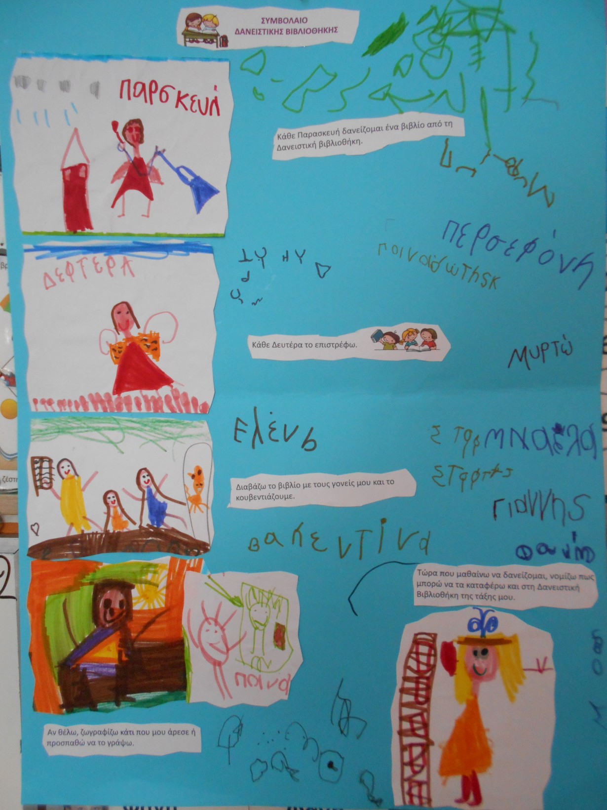 Τα παιδιά (νήπια και προνήπια) καθημερινά στις ελεύθερες δραστηριότητες δημιουργούσαν τα δικά τους παραμύθια. Περίμεναν με ανυπομονησία να τα παρουσιάσουν στην ολομέλεια της τάξης. Οργανώσαμε την επίσκεψή μας στην Δανειστική Βιβλιοθήκη “Ευγενία Κλειδαρά”. Τα παιδιά έφτιαξαν την αφίσα του σωστού Αναγνώστη και μαζί με την αφίσα με τους κανόνες της δανειστικής βιβλιοθήκης τα πρόσφεραν δώρο κατά την επίσκεψή μας. Ζωγράφισαν πώς φαντάζονται την Βιβλιοθήκη πριν την επισκεφτούμε και μετά τι τα εντυπωσίασε. Καθημερινά ήθελαν να παίζουν στο Νηπιαγωγείο Δανειστική Βιβλιοθήκη, στο συμβολικό τους παιχνίδι.