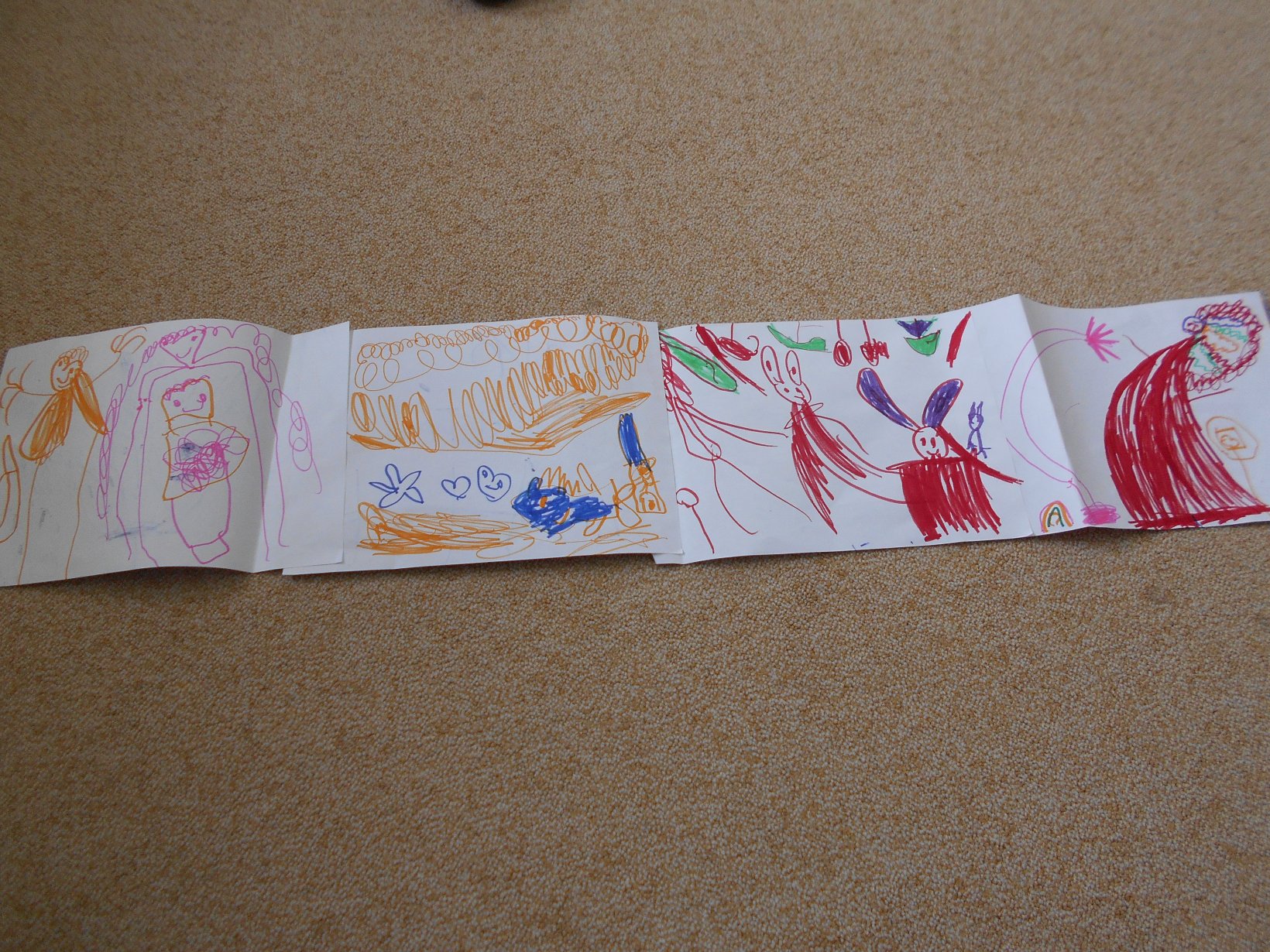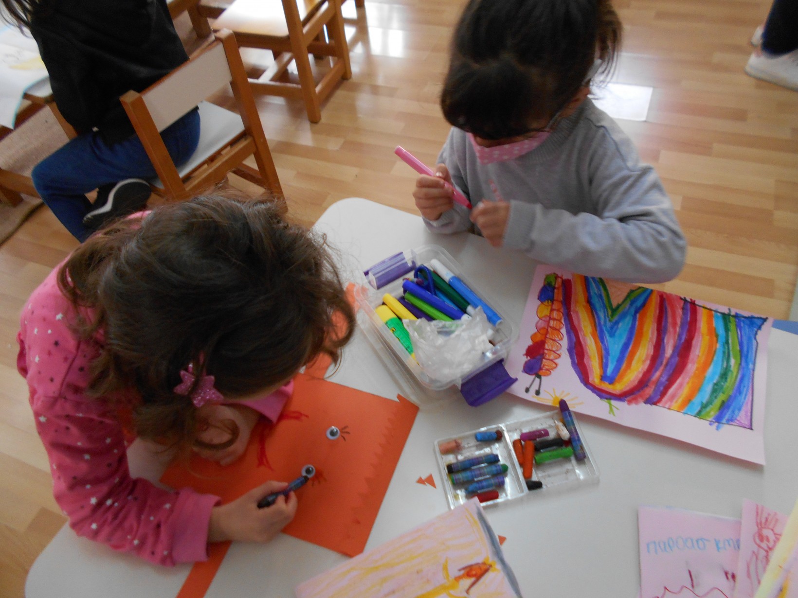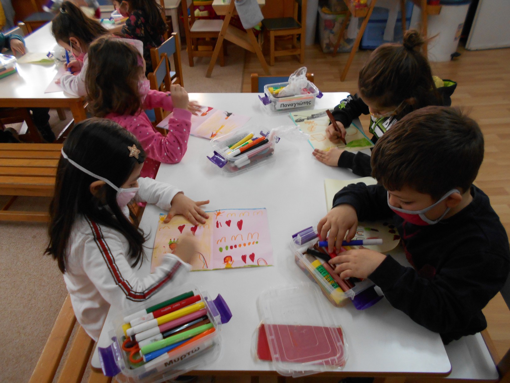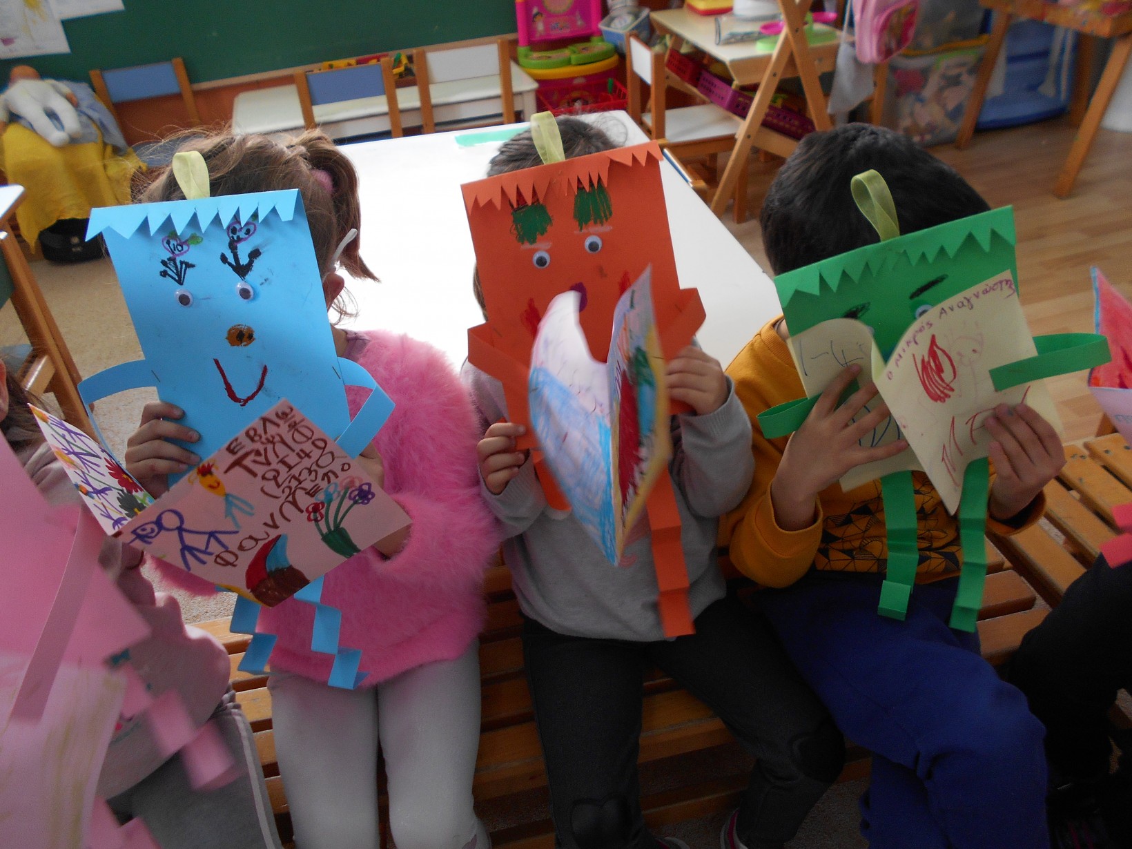 Τα παιδιά (νήπια και προνήπια) καθημερινά στις ελεύθερες δραστηριότητες δημιουργούσαν τα δικά τους παραμύθια. Περίμεναν με ανυπομονησία να τα παρουσιάσουν στην ολομέλεια της τάξης. Οργανώσαμε την επίσκεψή μας στην Δανειστική Βιβλιοθήκη “Ευγενία Κλειδαρά”. Τα παιδιά έφτιαξαν την αφίσα του σωστού Αναγνώστη και μαζί με την αφίσα με τους κανόνες της δανειστικής βιβλιοθήκης τα πρόσφεραν δώρο κατά την επίσκεψή μας. Ζωγράφισαν πώς φαντάζονται την Βιβλιοθήκη πριν την επισκεφτούμε και μετά τι τα εντυπωσίασε. Καθημερινά ήθελαν να παίζουν στο Νηπιαγωγείο Δανειστική Βιβλιοθήκη, στο συμβολικό τους παιχνίδι.