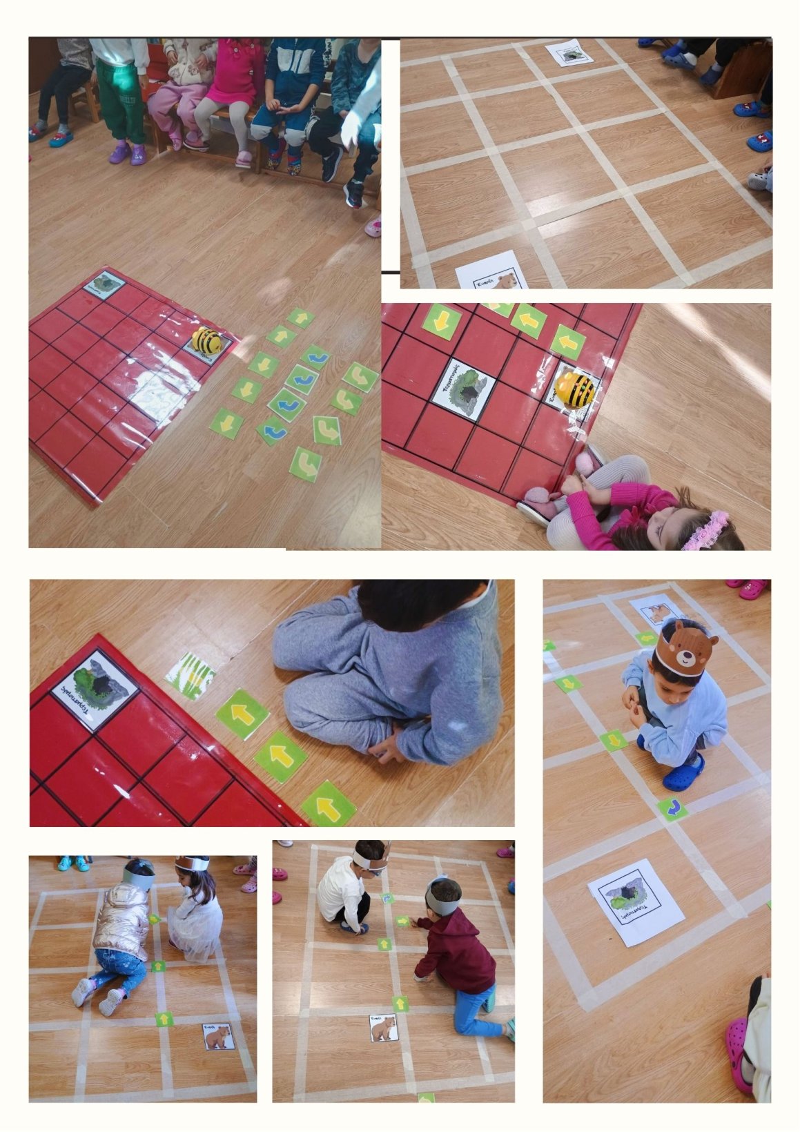 Στην πίστα για το Beebot, με 25 τετράγωνα ακολουθήσαμε το σενάριο σύμφωνα με το οποίο η αρκουδίτσα (ρομπότ beebot) προσπαθεί να φτάσει στη φωλιά της. Το ένα τετράγωνο ήταν η αφετηρία και το άλλο η φωλιά. Τα παιδιά έπρεπε να προγραμματίσουν το Beebot ώστε να φτάσει από την αφετηρία στη φωλιά, αφού πρώτα σχεδίαζαν τη διαδρομή με τα βελάκια. Κάθε φορά που άλλαζε ο παίκτης, άλλαζε και η διαδρομή. Τα παιδιά το διασκέδασαν πραγματικά πολύ!