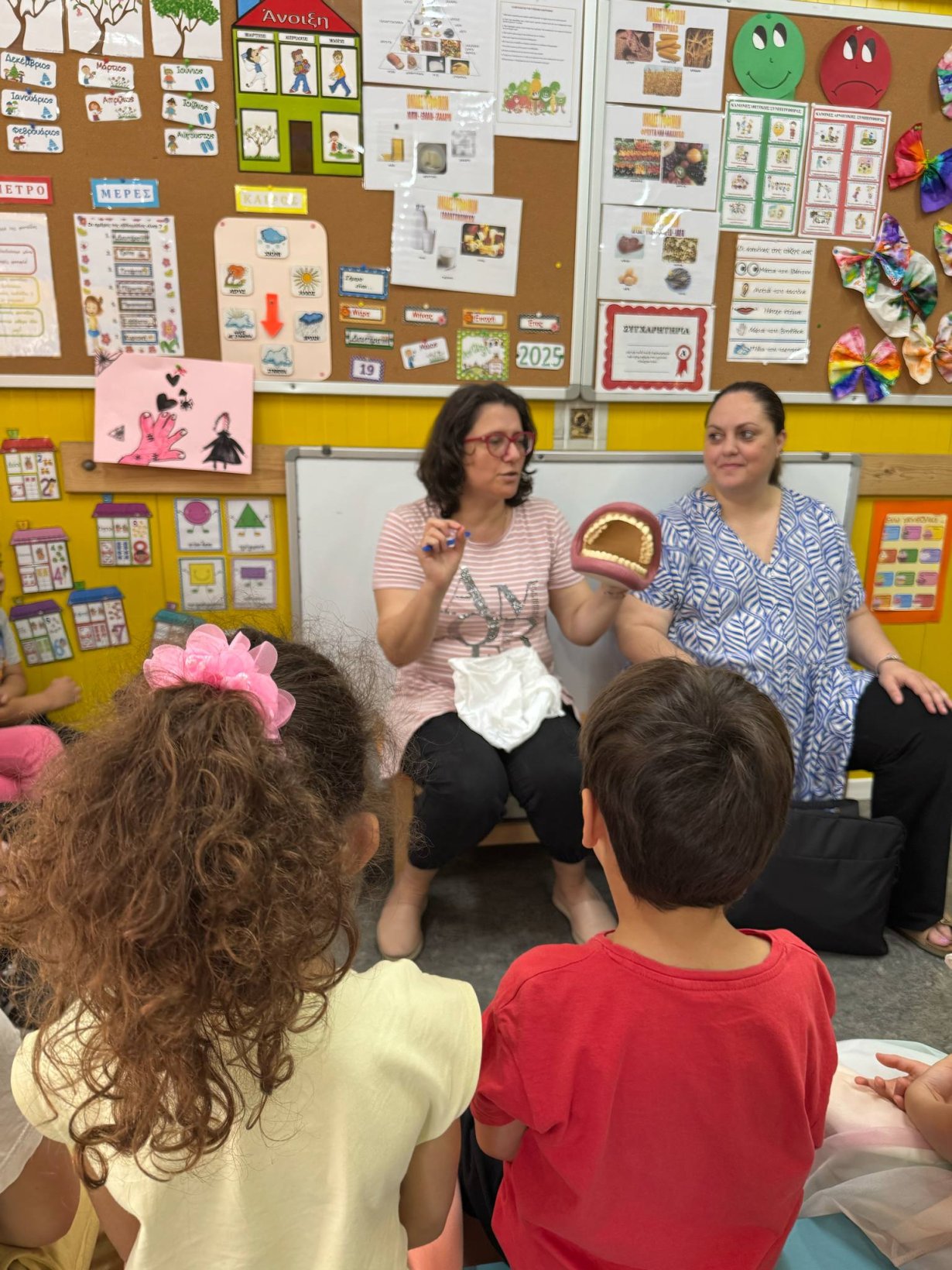 Μας έδειξαν το ρόλο των δοντιών στη μάσηση των τροφών και της ομιλίας, τους τρόπους φροντίδας τους, (βούρτσισμα, ποσότητα οδοντόκρεμας, αλλαγή οδοντόβουρτσας…). Μας τόνισαν ότι η διατροφή παίζει σημαντικό ρόλο στην καλή υγεία των δοντιών . Τα παιδιά αντιλήφθηκαν μέσω ερωτήσεων το επάγγελμα του οδοντιάτρου και μοιράστηκαν κάποιες προσωπικές τους εμπειρίες.